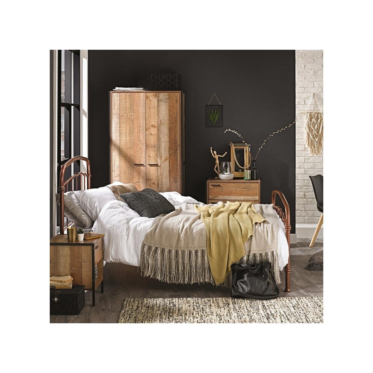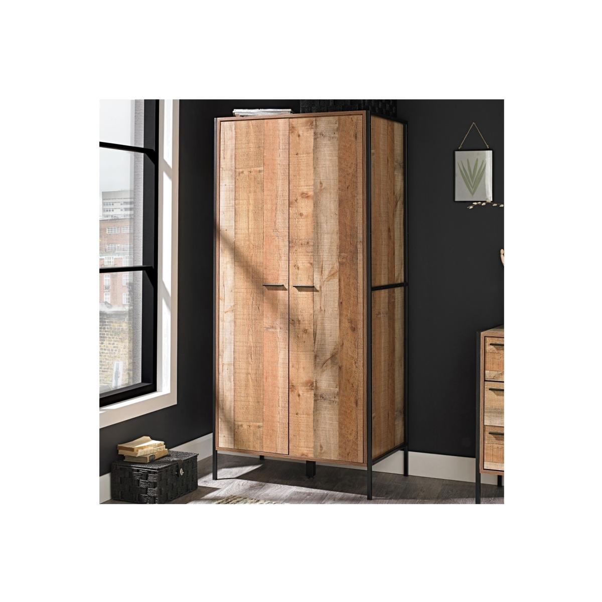 Dimensions W83.8cm x D52cm x H180cm Features. Stylish and affordable this bedroom range radiates industrial chic. The range comprises wardrobe chest of drawers and bedside. Wood effect finish with black metal frame. Assembly Required. The Hoxton range offers the perfect solution for those wanting to inject some contemporary industrial style...