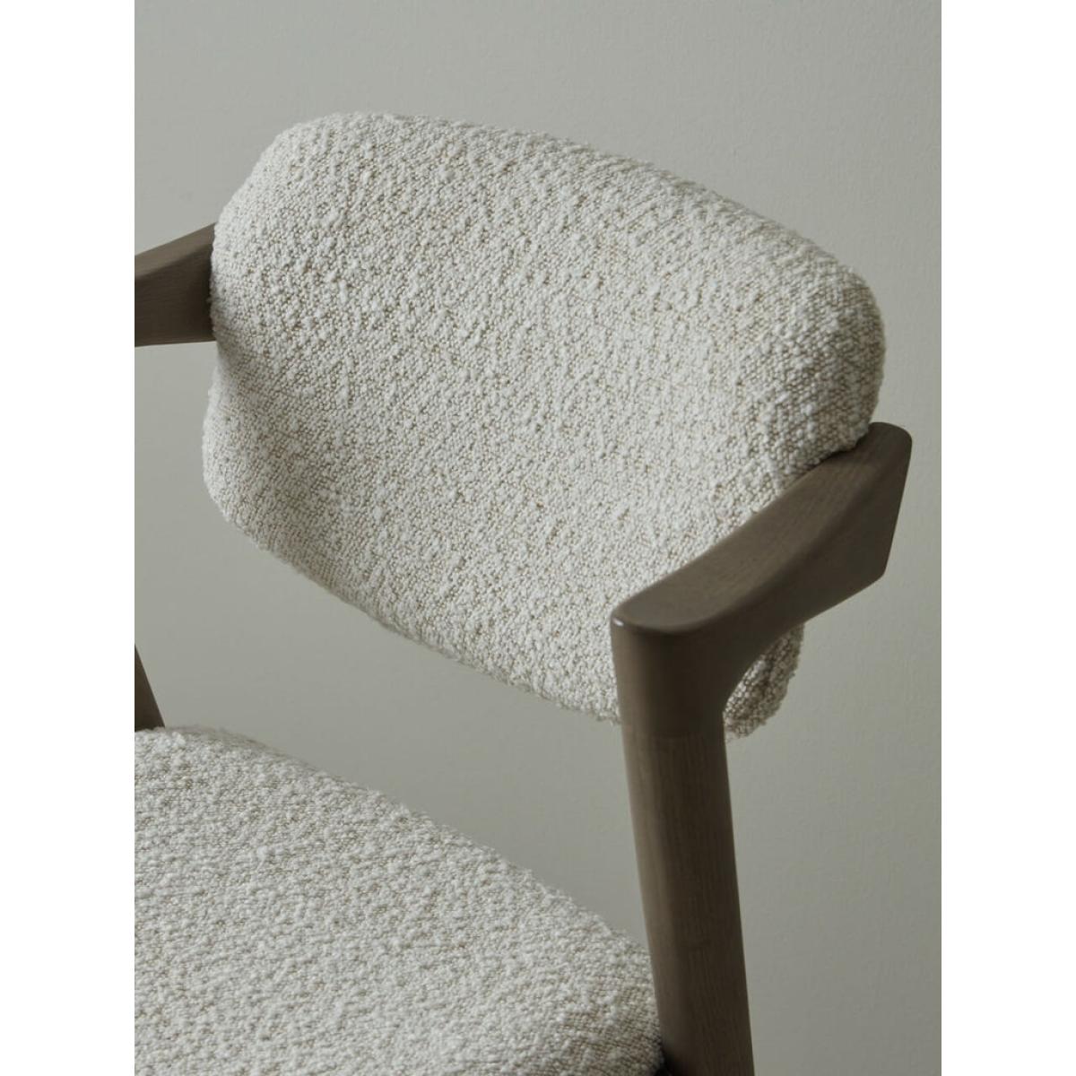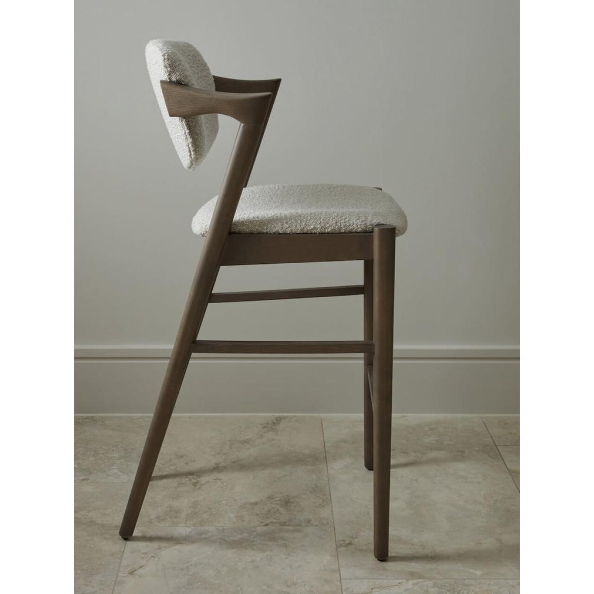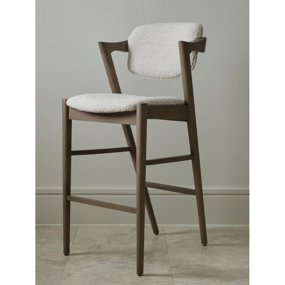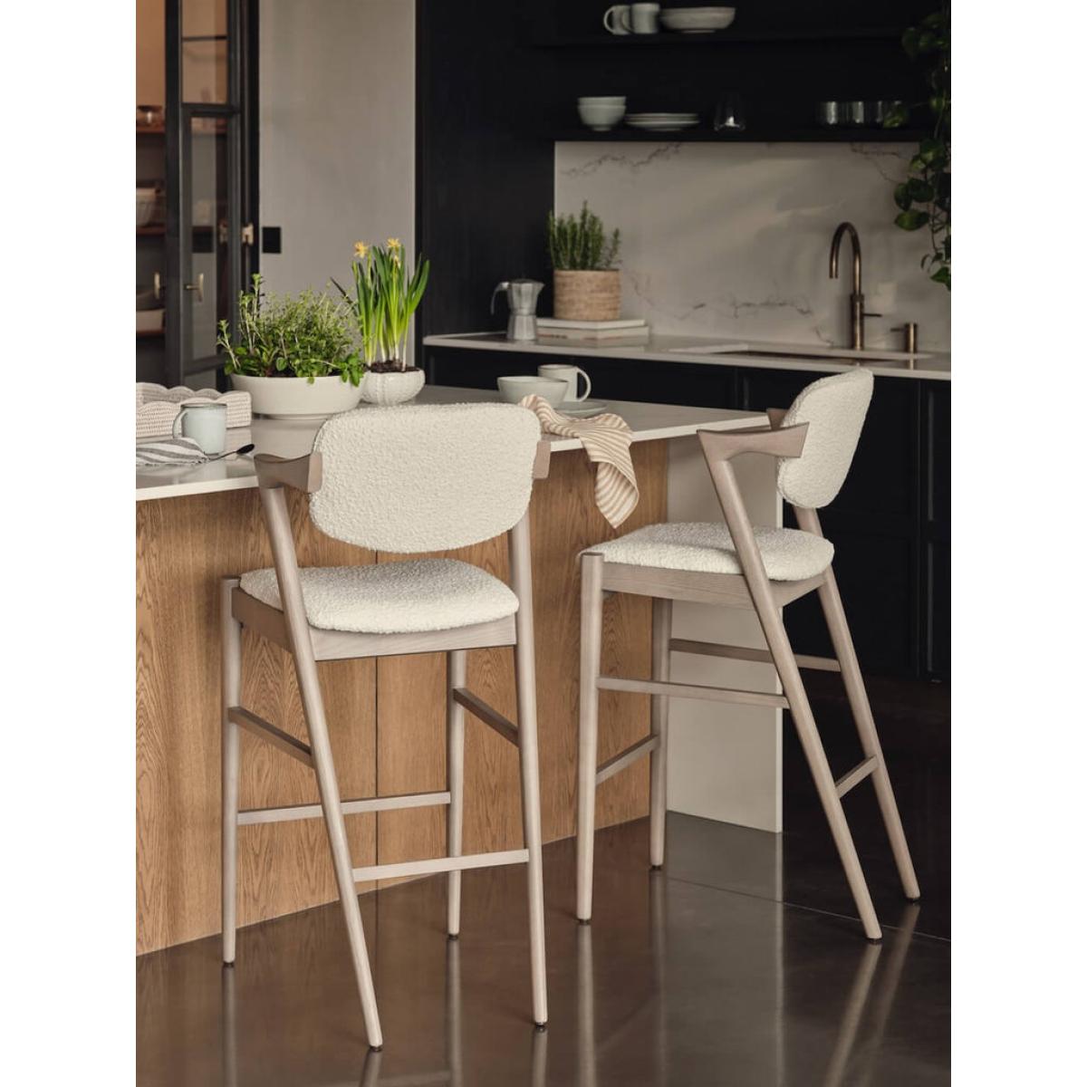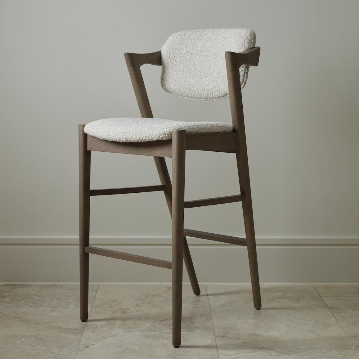 The Hoxton is a contemporary bar stool that combines a funky design with on trend boucle upholstery. The short arms of the chair are an ergonomic design perfect for resting your elbows on and the sloping back and seat pad make this a highly comfortable seat. When it comes to style, the grey wash to the ash wood provides a perfect compliment to the soft cream tone of the textile ensuring the modern design will become a timeless classic.