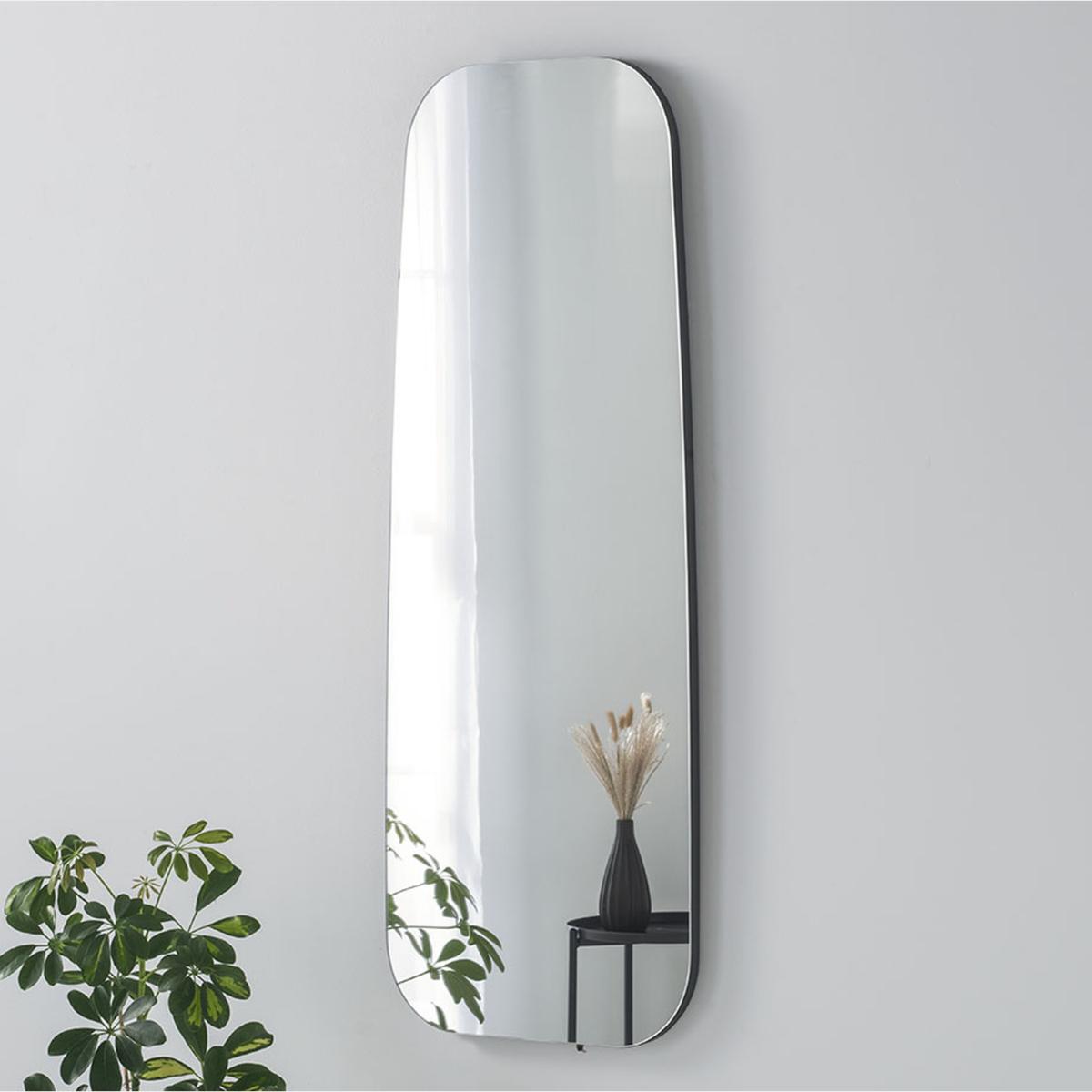 Simple and understated yet oozes sophistication. This timeless organic shaped mirror would make a great addition to the interior. The unique full-length shape will allow for the room to feel much bigger and help reflect light. Hanging hooks come attached to the back ready for vertical or horizontal wall hanging. This beautifully crafted mirror has a frameless look with the frame only visible form a side view which shows approx. 2cm and finished in black. The glass itself is real mirror glass which offers a high quality, crisp reflection without any distortions. Hand crafted in the UK by skilled artisans.