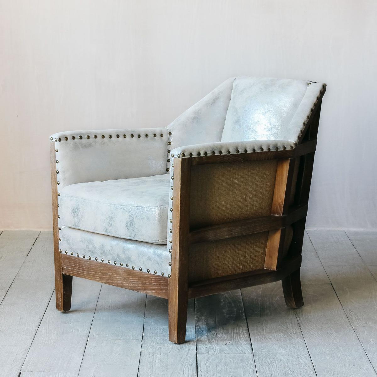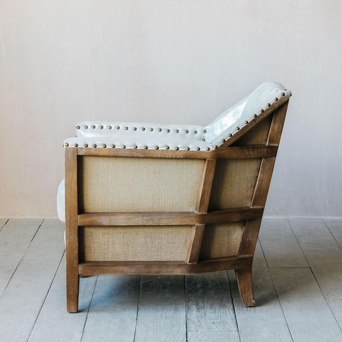 A luxurious armchair upholstered in decadent silver leather, featuring an exposed ash wood frame, natural hessian backing and brass stud details. The high padded arms and deep seat make this chair perfect for relaxing and sinking into. H76 x W69 x D59cm. Made of ashwood. Upholstered in leather with a silver finish. Due to the handmade nature of this product, the exact colour and finish may vary. Exclusive to G&G.