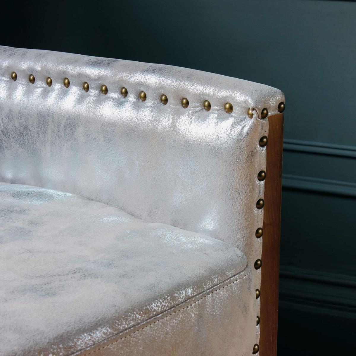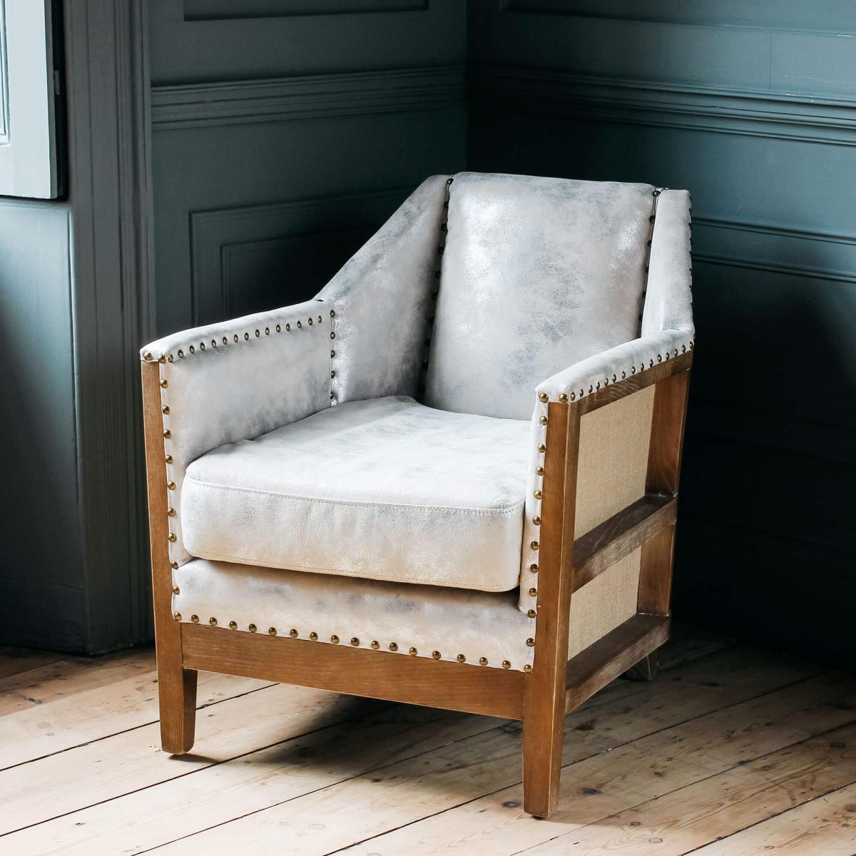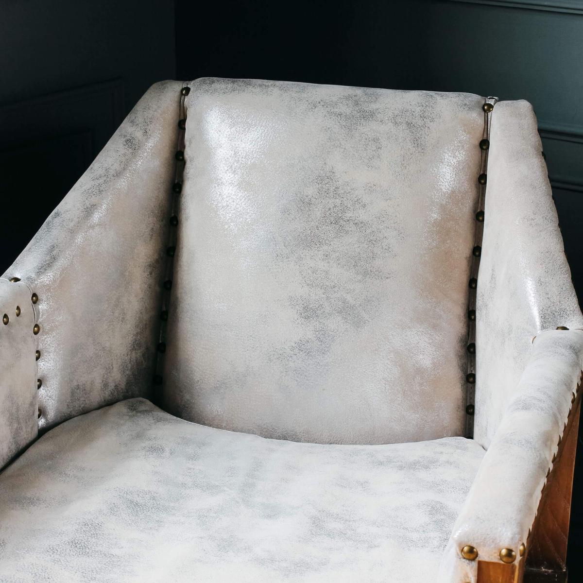 I love this armchair because of its blend of classic and contemporary appeal. The silver leather adds a subtle touch of luxury, while the wooden frame keeps it grounded and versatile. It works particularly well in both modern and vintage-inspired interiors, serving as an elegant accent piece in living rooms, bedrooms, or even cosy reading nooks. For styling tips, consider pairing it with textured cushions or a soft throw to soften its sleek look, and place it near a side table with a good reading lamp for an inviting vignette. Its neutral tones make it adaptable, so it can easily be incorporated into a colour scheme with muted shades or used as a statement piece with bolder hues nearby.