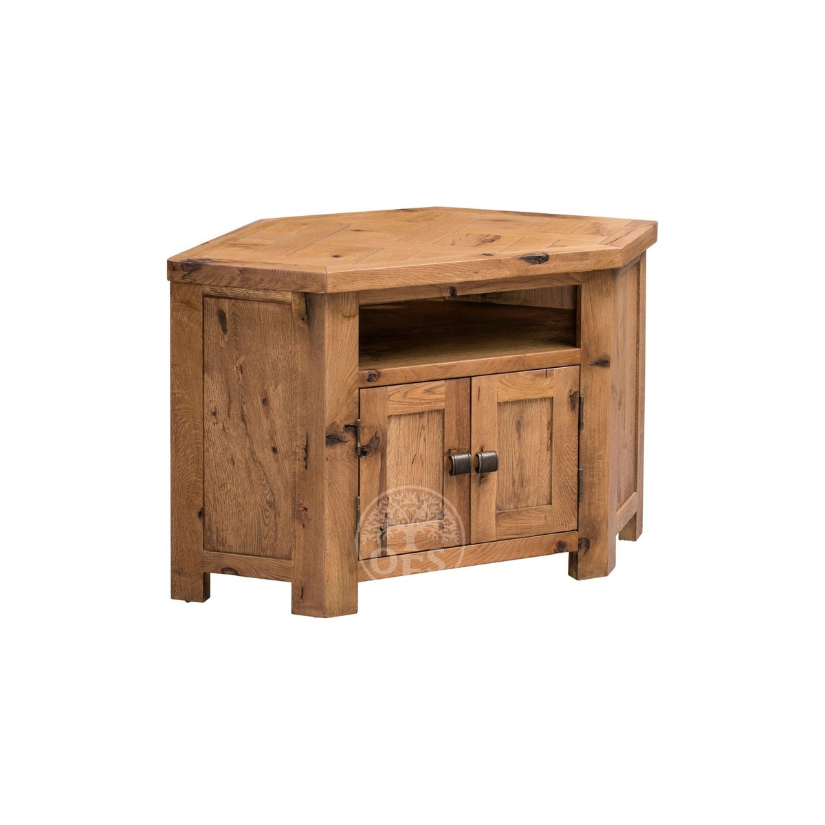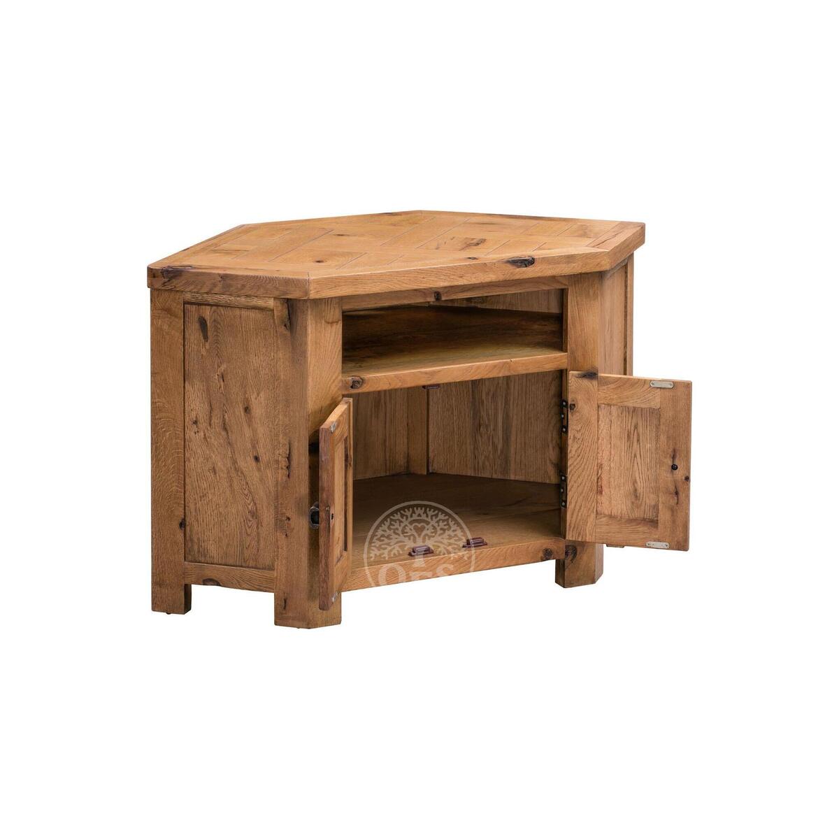 Charmingly compact and chunky, the Huari Corner TV Cabinet has a hexagonal shape that will help it fit comfortable into any corner while still leaving room for wires at the back. Displaying lovely natural wood grain, meaning that each piece of furniture is fully individual, this cabinet also features a crosshatch pattern on top that adds to its warm, rustic feel. Featuring two doors and one shelf, this unit is ideal for storing DVD players and consoles in a simple but stylish manner. It is finished with flattering, chic metal handles that add the final touch to this unit.