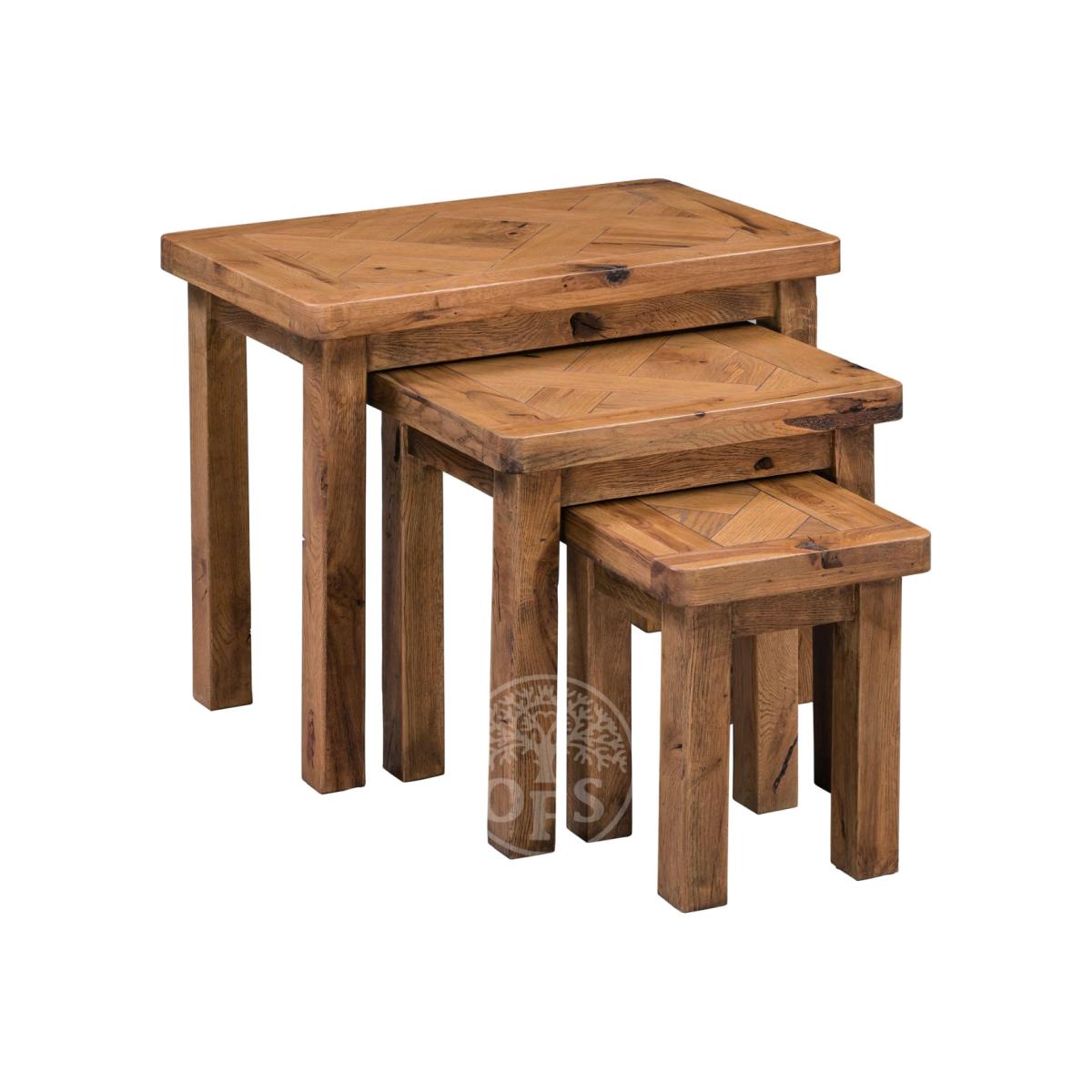 I love this set of nesting tables because of their versatile, rustic appeal and practical design. They work particularly well in cosy, country-style interiors or spaces where natural textures are celebrated. The warm oak finish adds visual interest without overpowering other elements in the room, making them a flexible choice for various colour schemes. For styling, I suggest grouping them together for a dynamic visual effect or using them separately for side or accent tables across different areas. They are perfect for hosting drinks, displaying books, or holding small decor pieces, and their nesting feature is great for saving space when needed. Overall, they bring a functional yet organic touch to both traditional and contemporary settings.