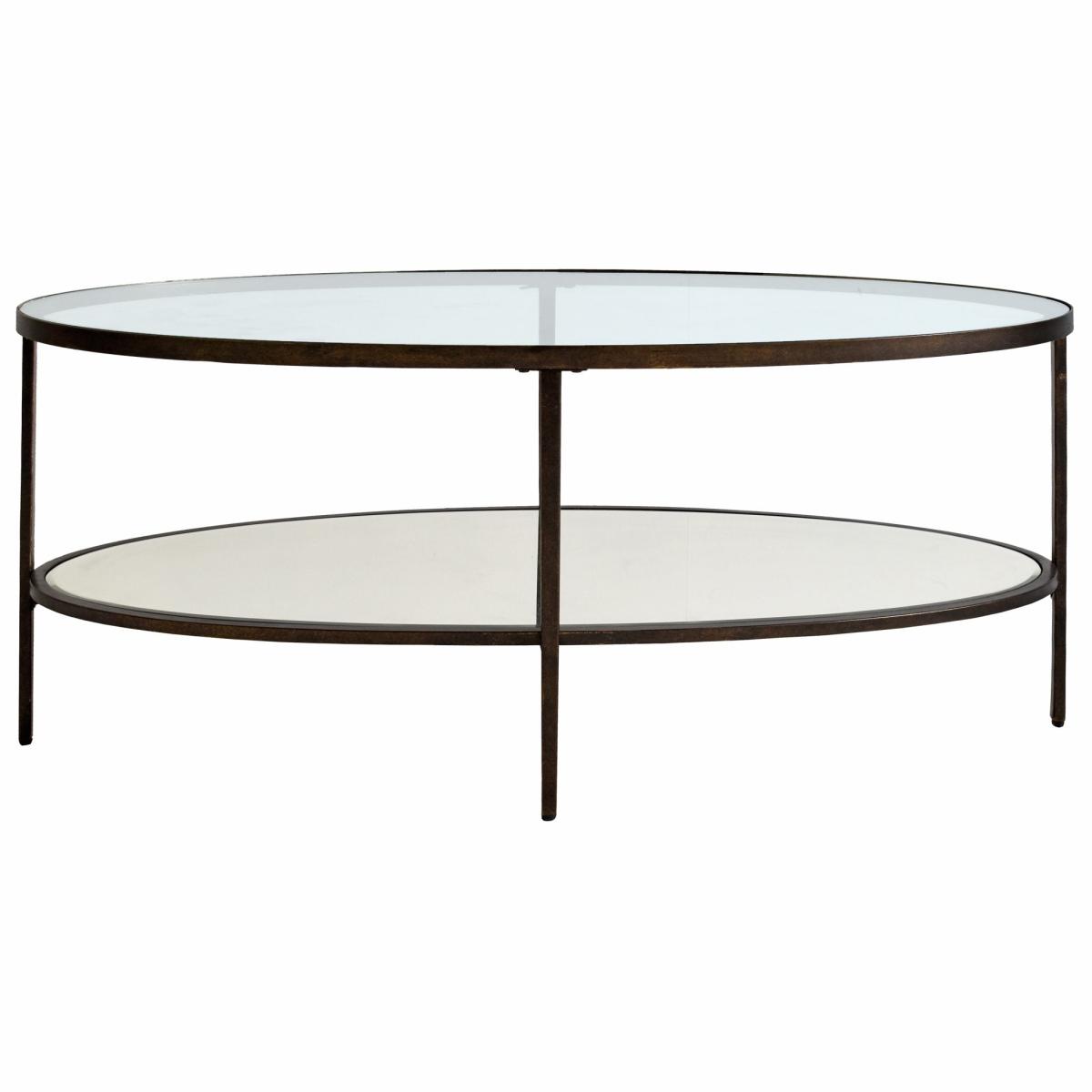 Stunning oval metal coffee table in an aged bronze finish with inlaid, tempered glass top and mirrored shelf. Some assembly required.