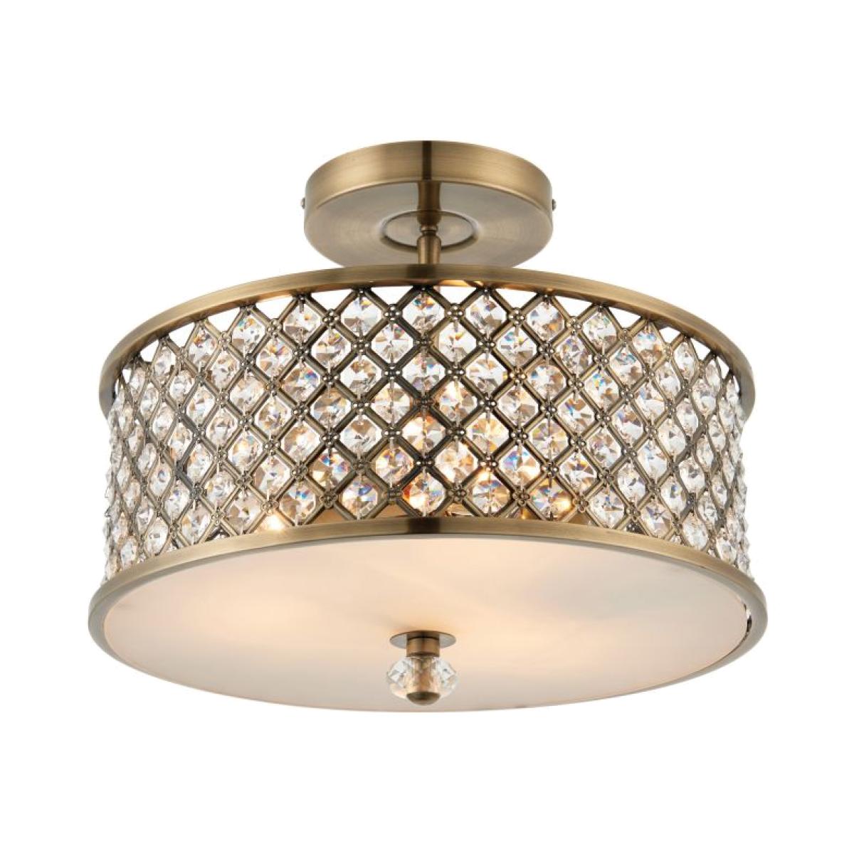 A flush ceiling pendant with an antique brass finish. The shade is made of crystal beads and an opal diffuser to the bottom. Both dimmable and suitable for use with LED lamps. Matching items available.