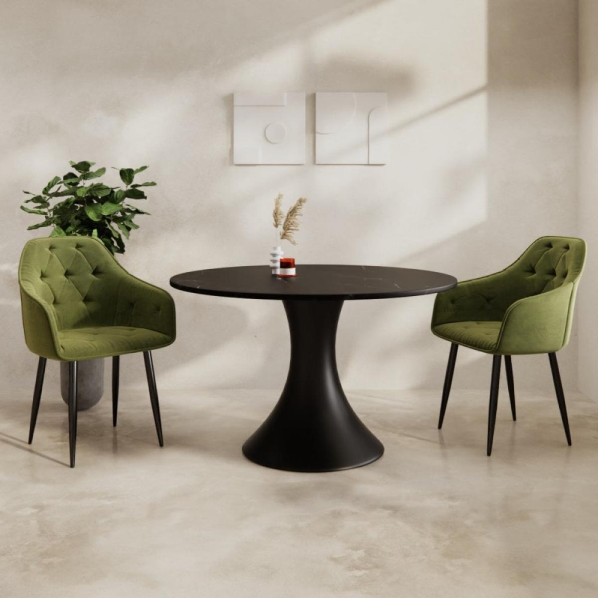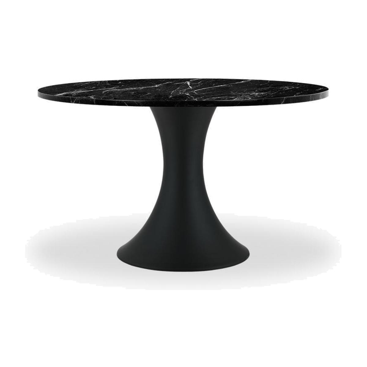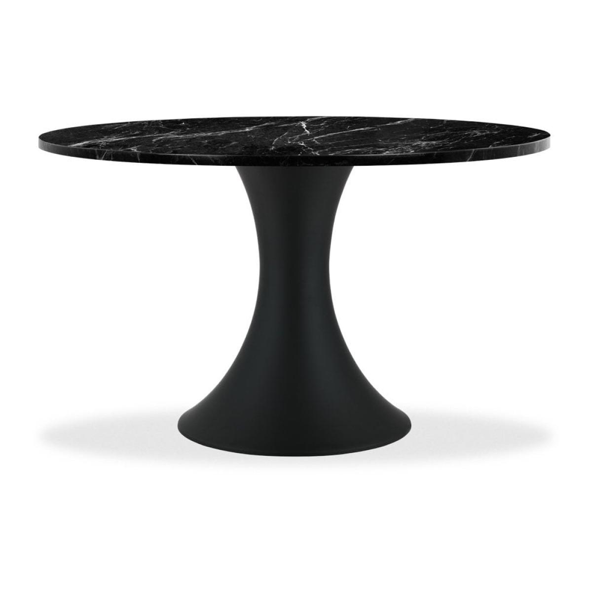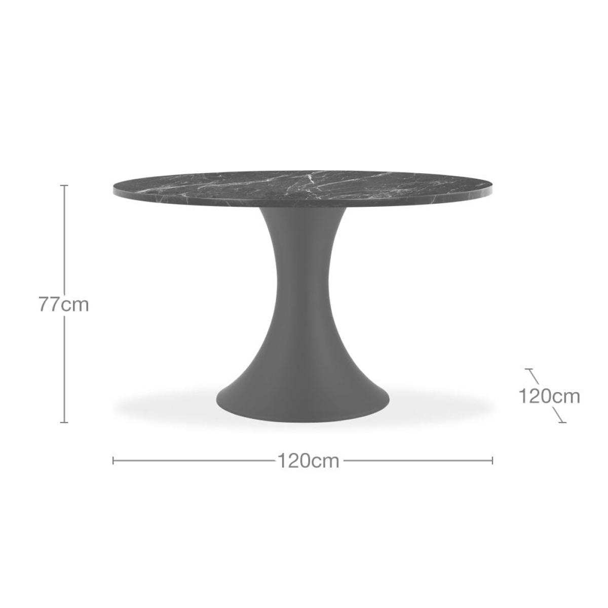 I love this table for its sleek, contemporary look and versatile colour palette. The black marble surface adds a sophisticated touch and works beautifully in modern, minimalist or industrial-inspired interiors. The pedestal base creates a clean, uncluttered feel, making it ideal for smaller dining spaces where practicality is key. To style around it, consider pairing with matte black or metallic chairs for a cohesive look, or introduce textured or coloured accessories like vibrant placemats or ceramics to soften the dark tones. Its bold design makes it a statement piece, so keep surrounding decor simple to let the table shine, while ensuring the room feels balanced and inviting.