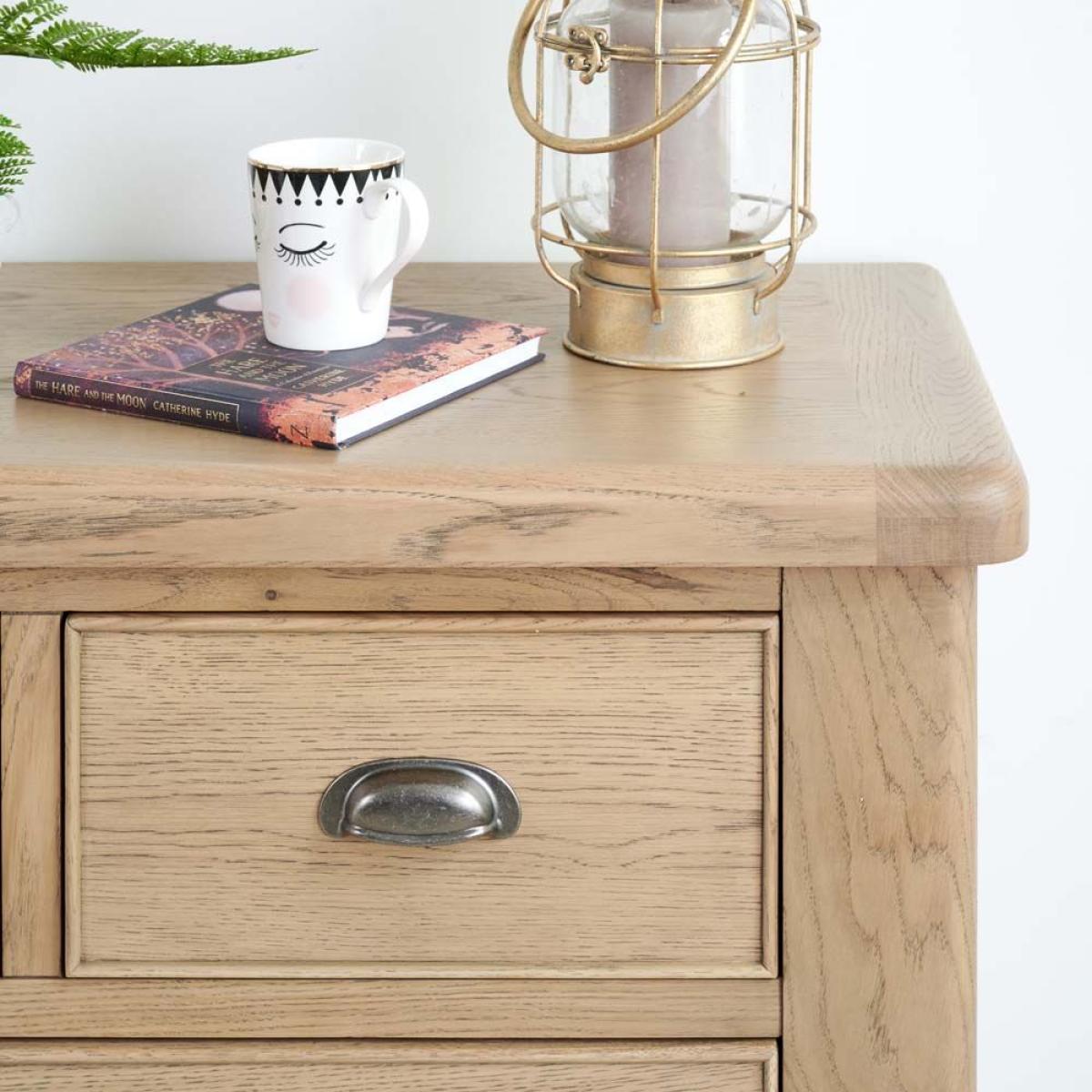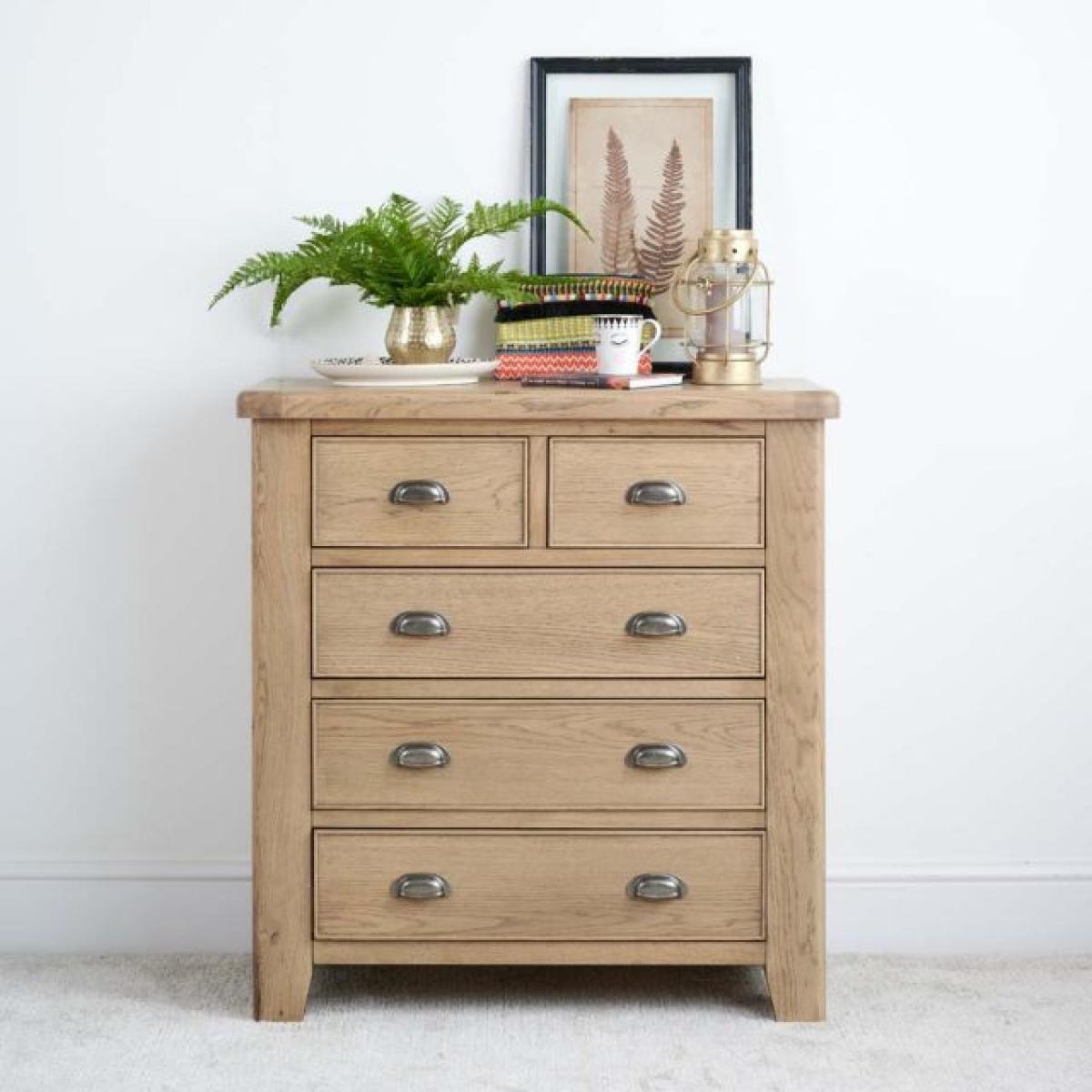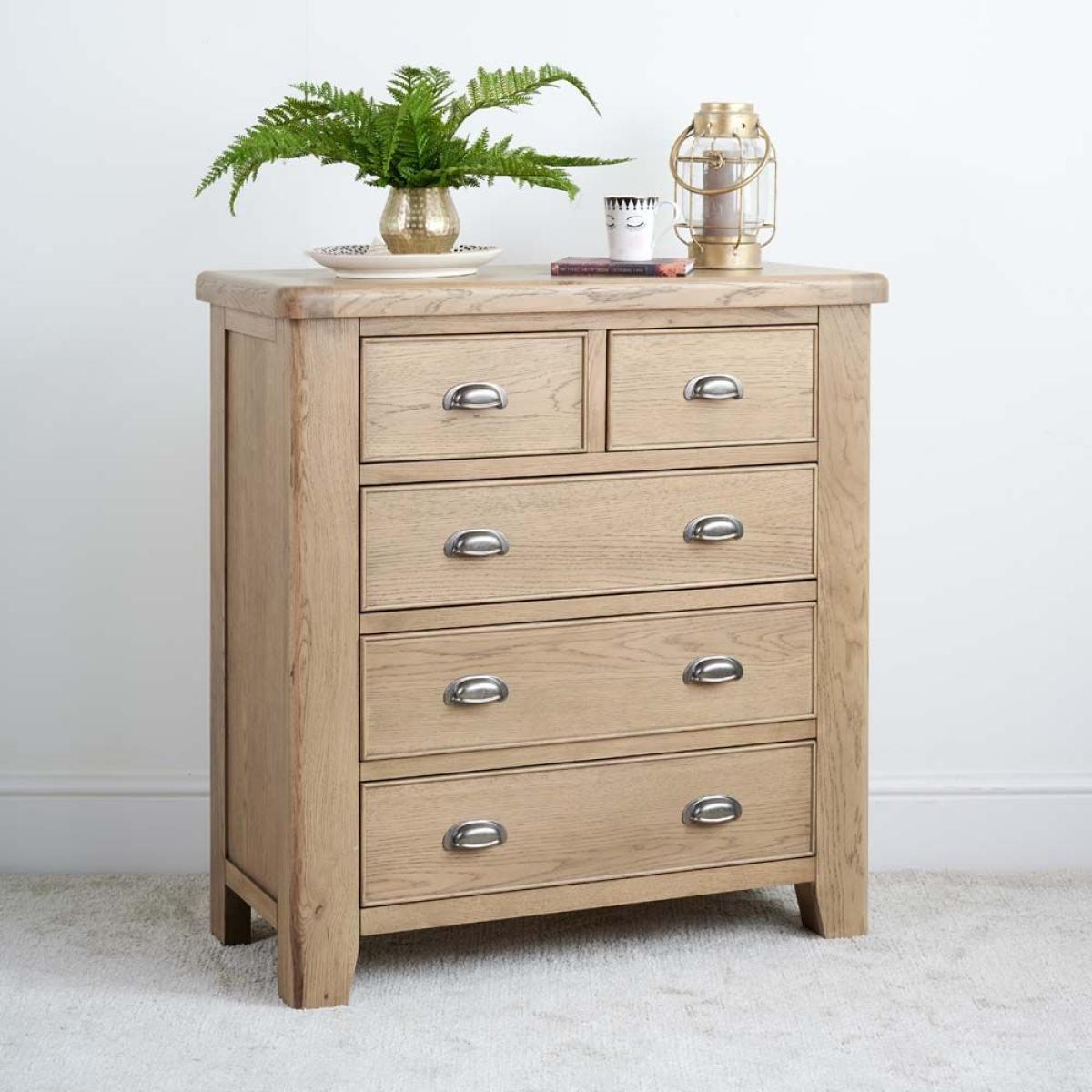 The Hudson 5 drawer or, two over three chest of drawers is classically proportioned and perfect for the bedroom or indeed the living room. Each drawer features smooth cup handles made from distressed chrome and the chest itself is constructed from a perfect mix of solid oak and oak veneers.. The five drawers offer ample storage, and the piece works perfectly alongside a wardrobe from the same collection. Solid Oak amp; Oak Veneers construction. Two small drawers and three large drawers. Dimensions: H105cm x W100cm x D45cm. Simple self assembly
