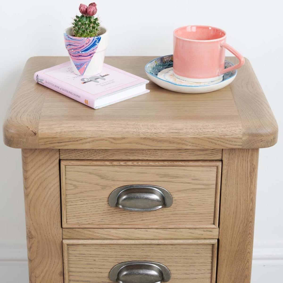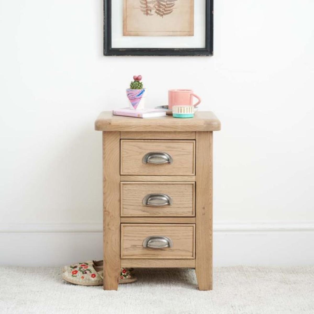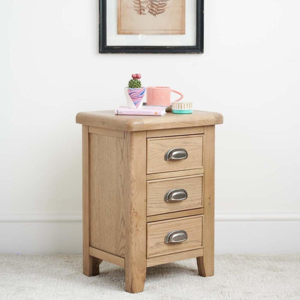 The Hudson Bedside Chest is a small chest, perfect for use where space around the bed is at a premium. It features three small drawers with cup handles and is crafted from solid oak and oak veneers. The corners are smoothed into curves and this little piece really lets the natural wood tones shine through. Three drawers. Solid Oak amp; Oak Veneers construction. Dimensions: H58cm x W42cm x D32cm Simple self assembly