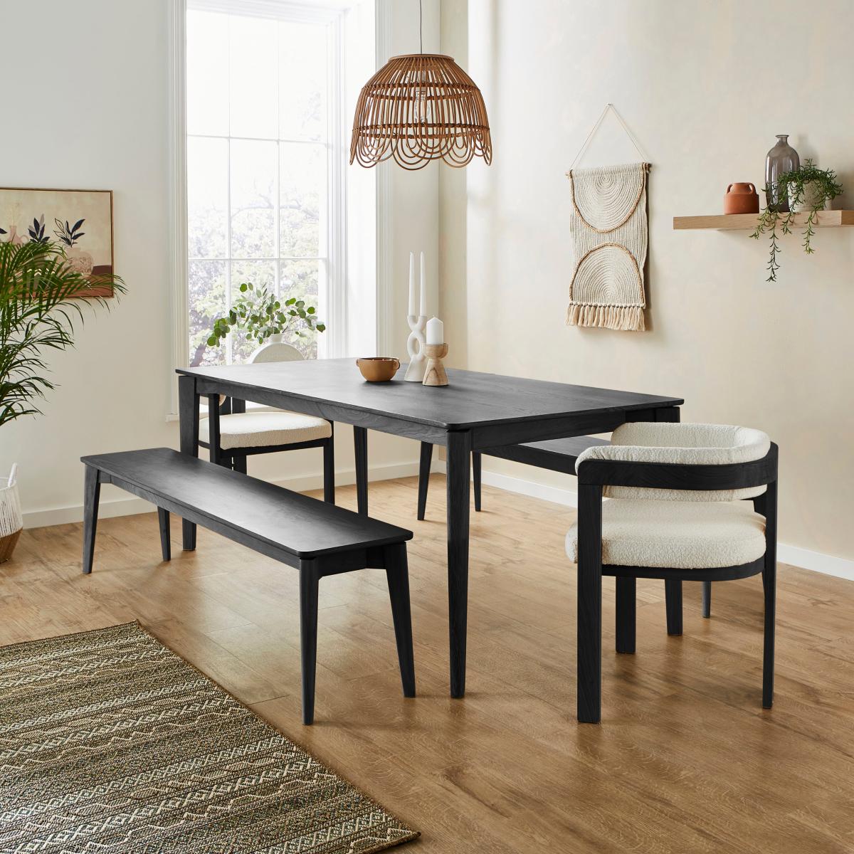 I’m a fan of this bench for its clean lines and matt-black finish, which anchor everything from Scandi-inspired to modern-industrial dining spaces. Its slim profile tucks neatly under the table when not in use, making it ideal for narrower rooms or open-plan layouts. For a pulled-together look, layer a neutral linen cushion or a simple woollen throw across the seat, then mix in a pair of contrasting chairs at the table ends. If you’re short on storage, slide woven baskets underneath to keep extra napkins or placemats close to hand.