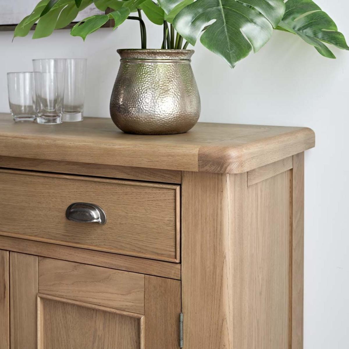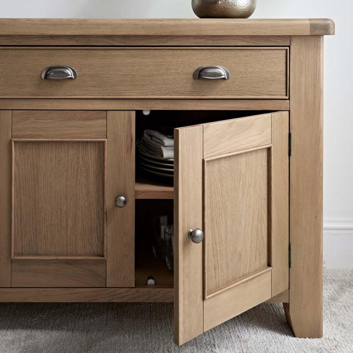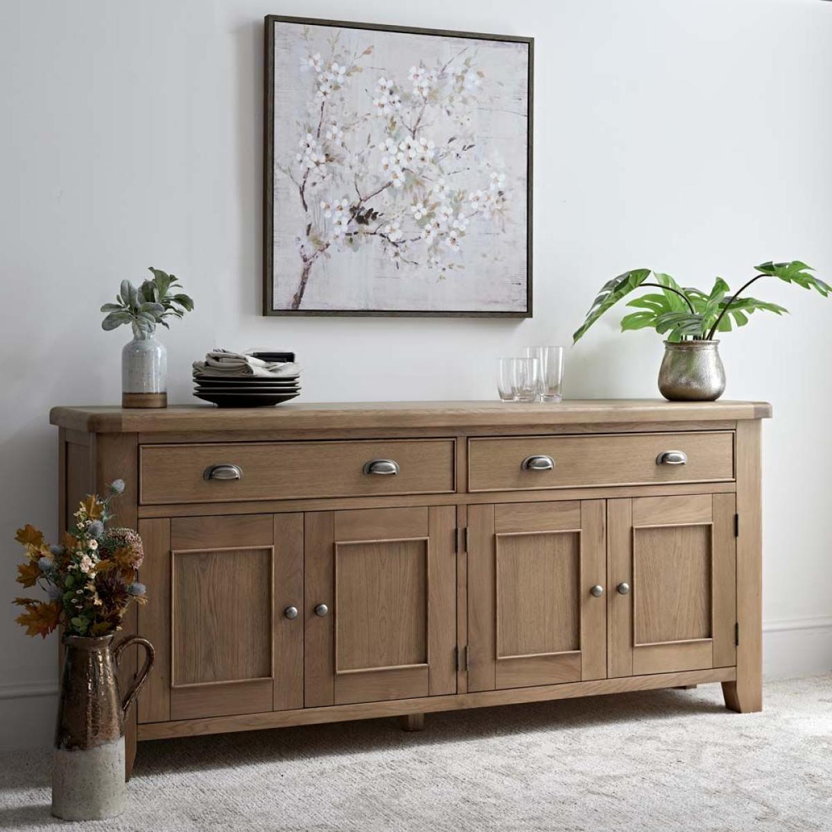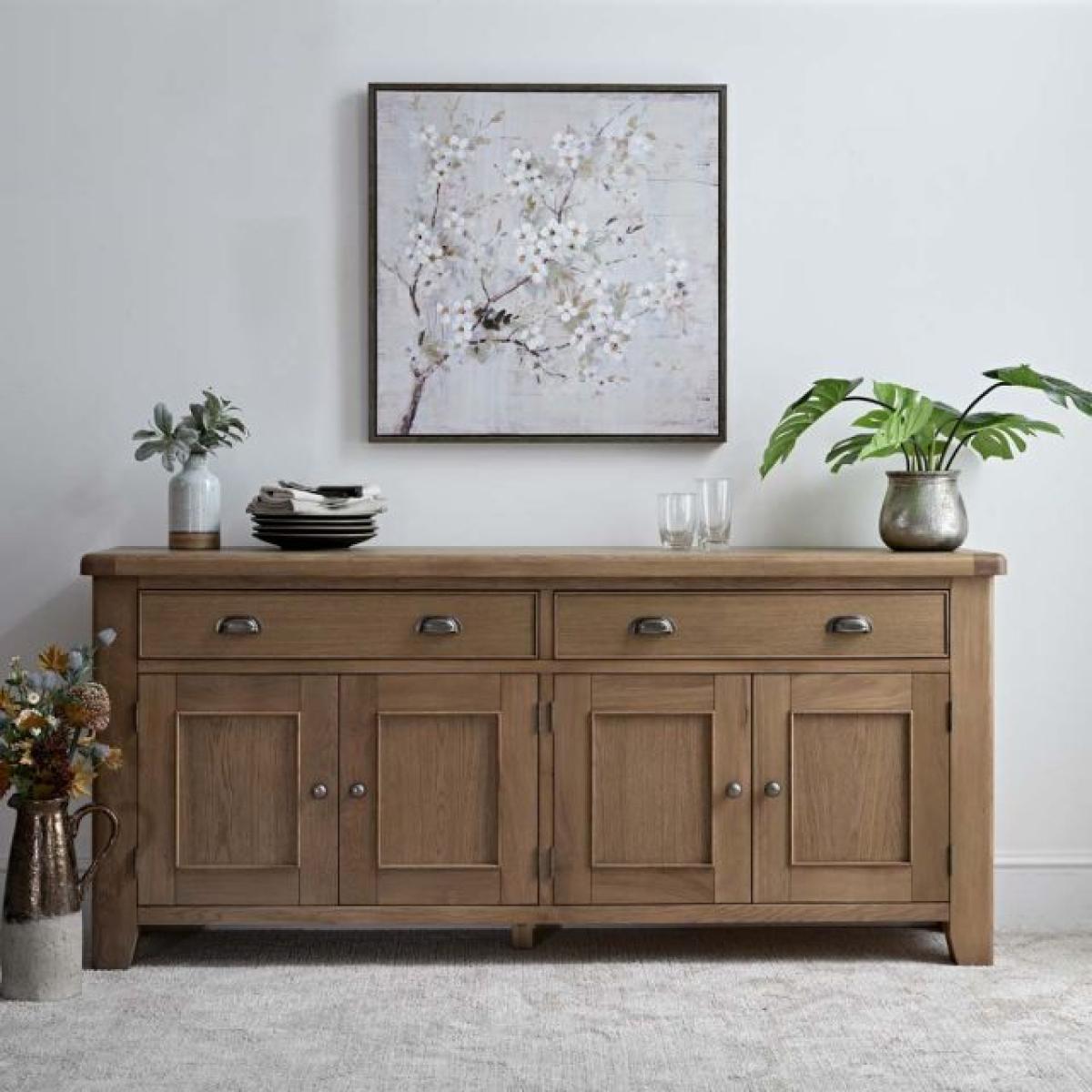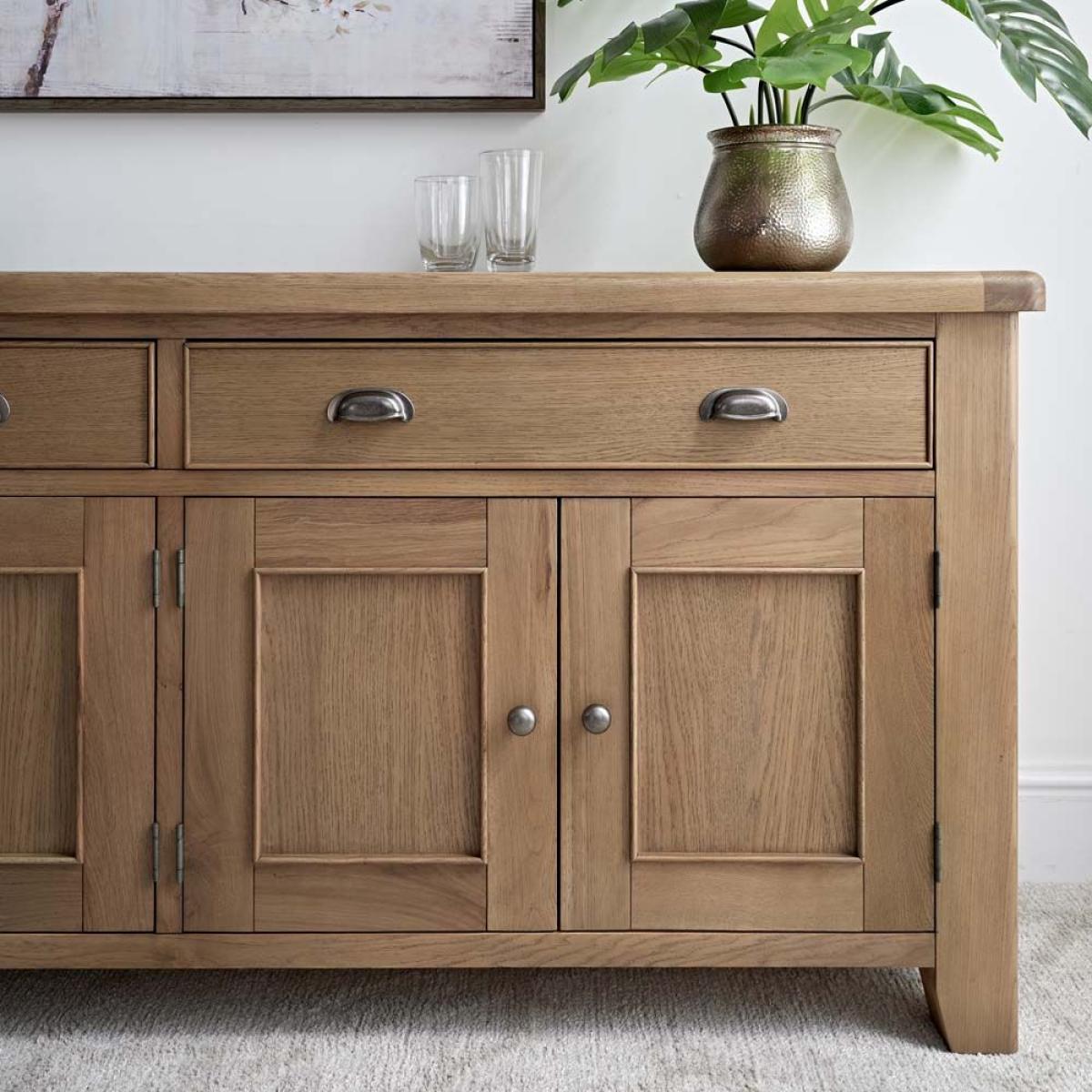 This huge four door sideboard is the ultimate storage solution for the dining room. Boasting four generous cupboards and two wide drawers all fronted with antiqued metal work, this sideboard can easily hold all of your crockery and serving items. The piece is in the traditional hudson style and built from heavy hard-wood and oak veneers. It's a truly solid piece of furniture.