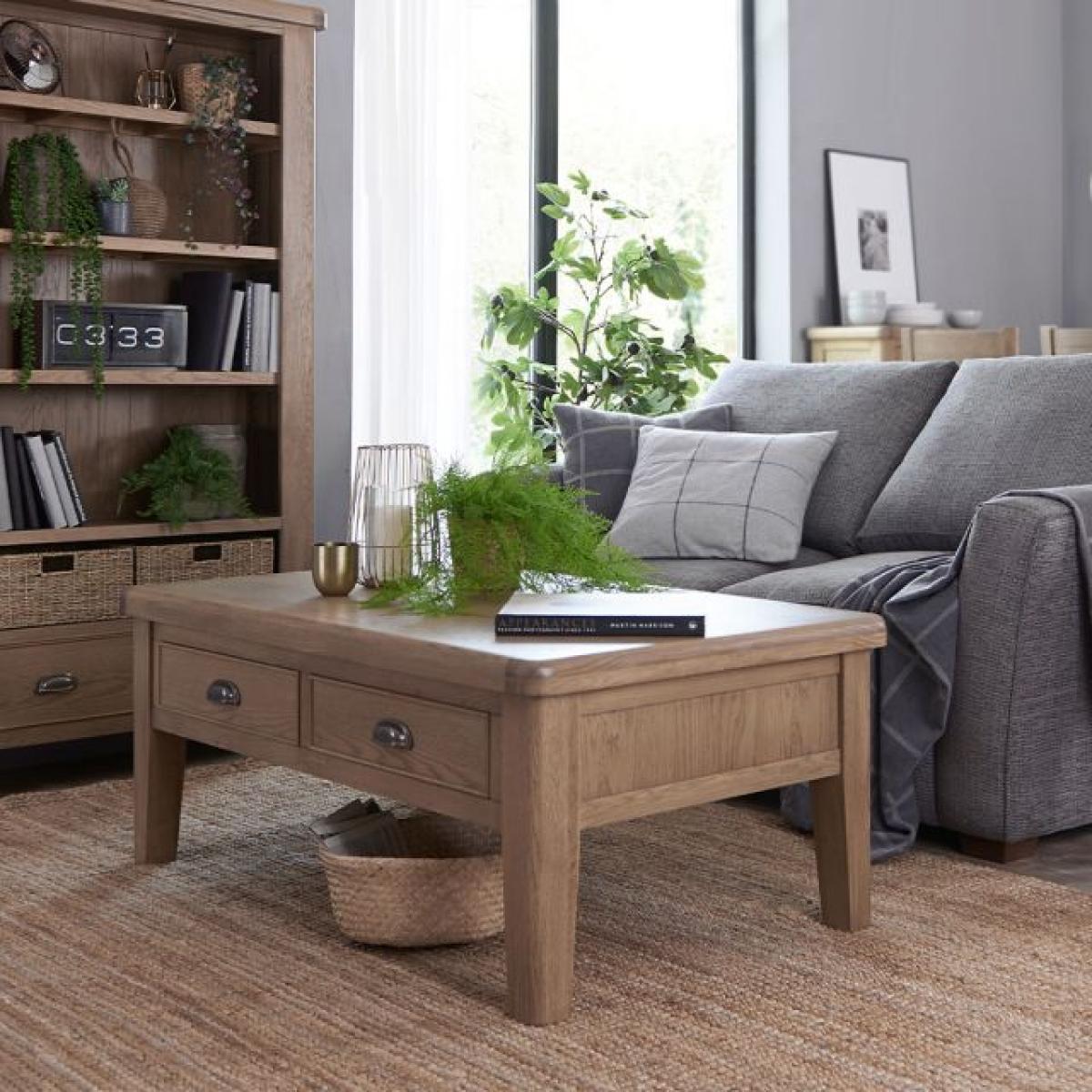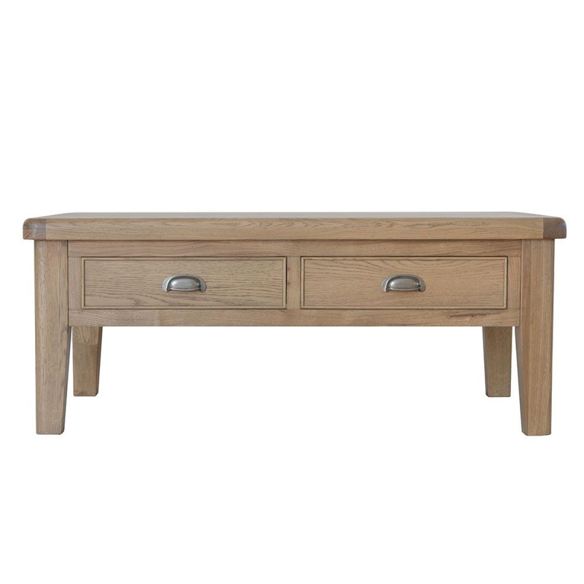 The Hudson Large Coffee table is perfectly proportioned with two large drawers fronted with antiqued metal cup handles. Built from a mix of solid oak and oak veneers with a smooth finish and curved corners, this coffee table is sure to suit so many homestyles.