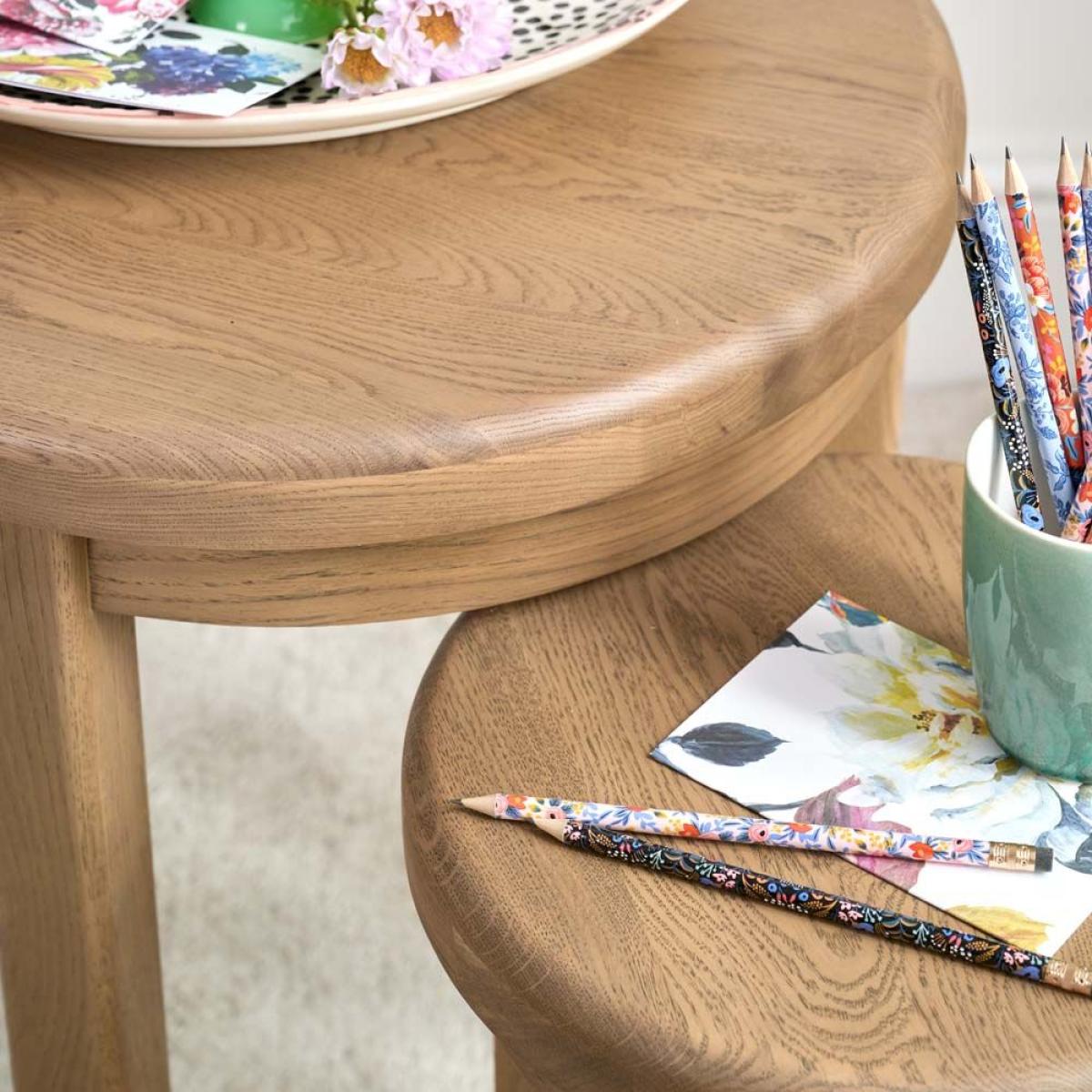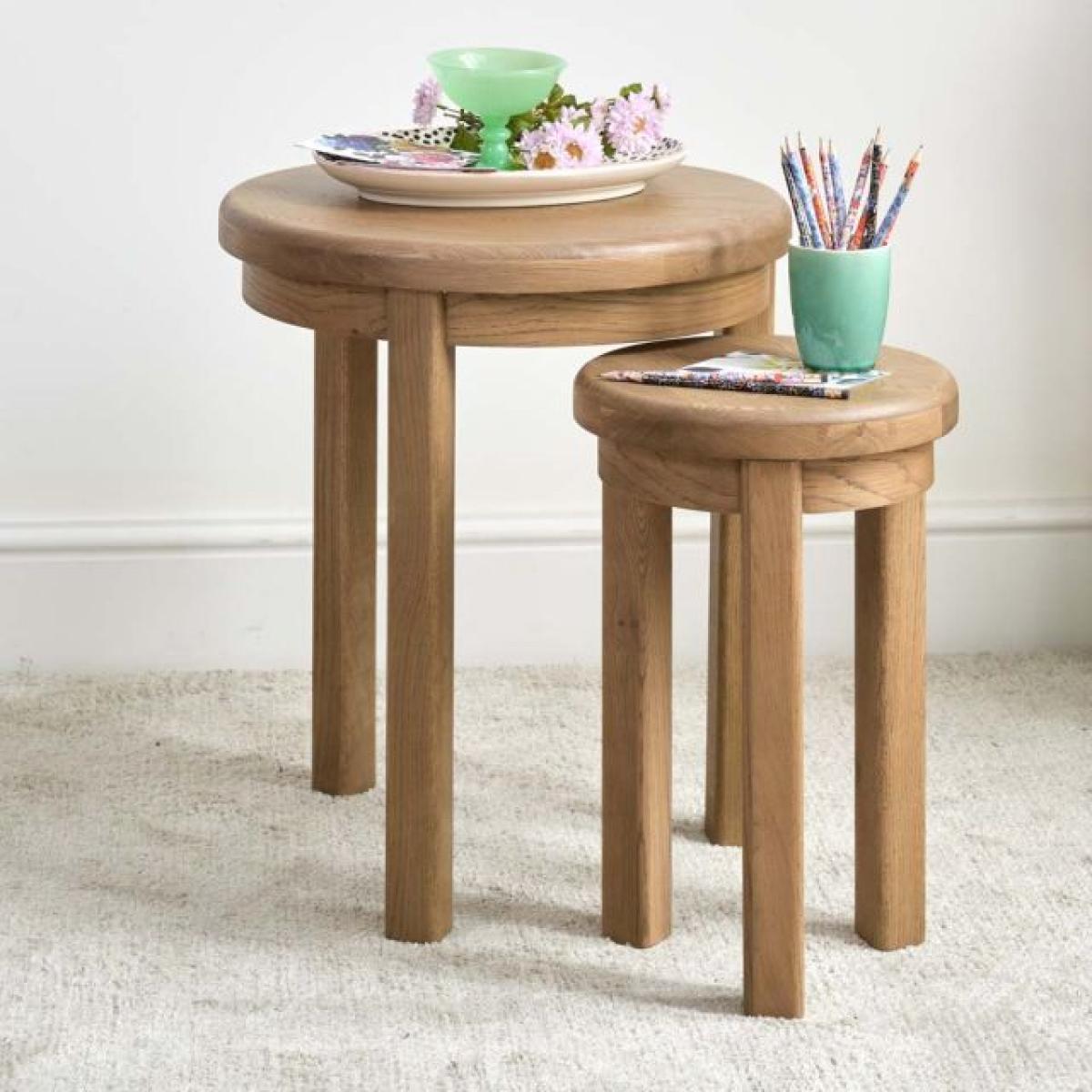The Hudson Nest of Two Round Tables is a cute pair of small sidetables that next inside each other so they take up little room when not in use. The nest consists of one large round topped table with three legs and a smaller with the same design. Showcasing the beauty of natural wood, these tables are built from a mix of solid oak and oak veneers. Solid Oak amp; Oak Veneers construction. Two nesting tables. Dimensions when nested: H60cm x W52cm x D52cm. Simple self assembly