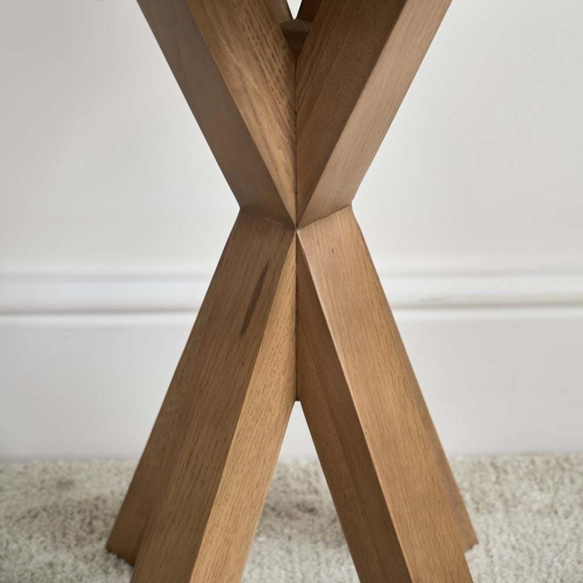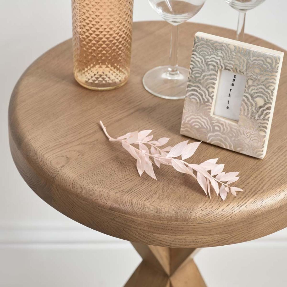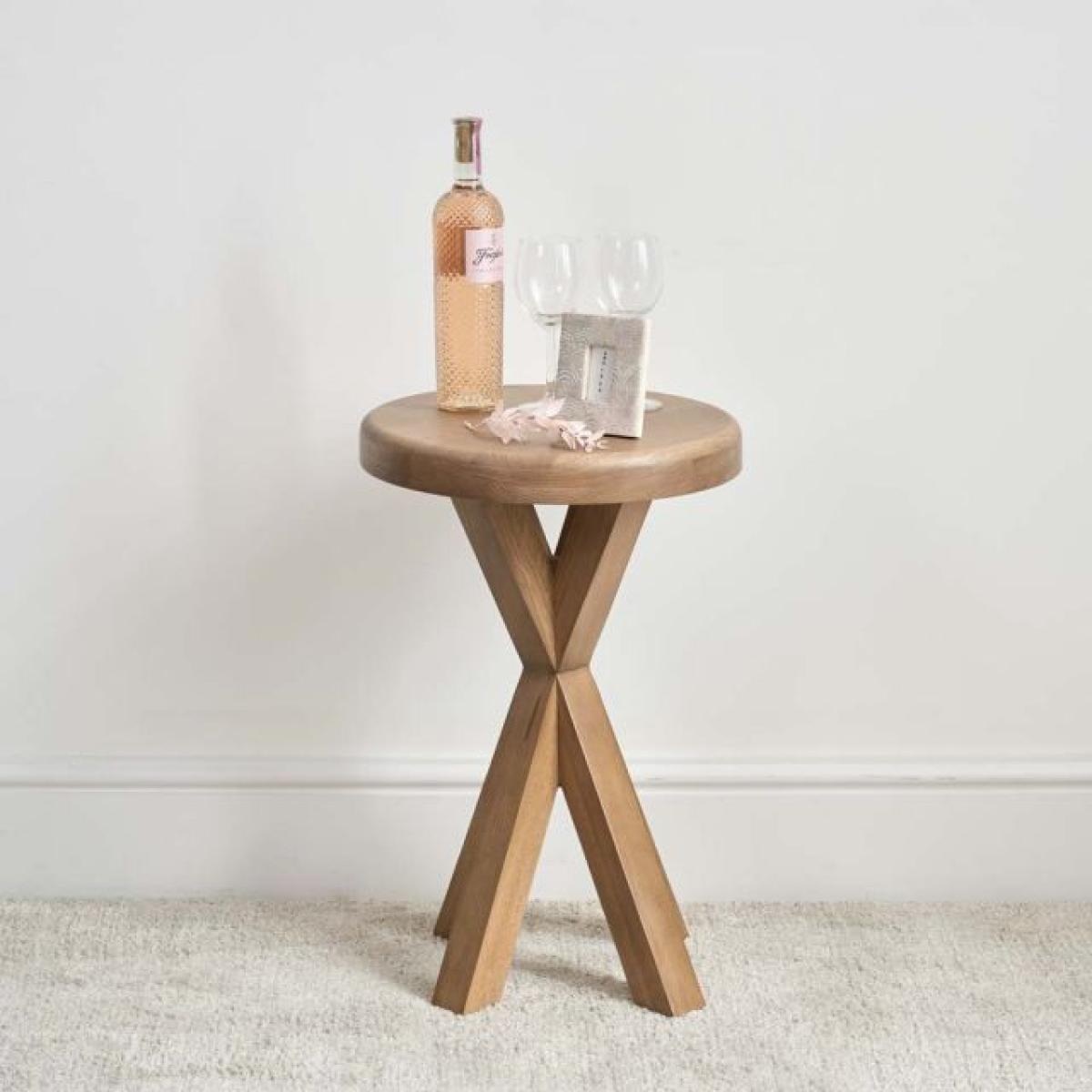The Hudson Round Lamp Table is a useful little table perfect for placement next to an armchair, occasional chair or sofa. The smooth round oak top is supported by a crossed leg design which gives this piece its signature look. Showcasing the beauty of natural wood, the side table is built from a mix of solid oak and oak veneers. Solid Oak amp; Oak Veneers construction. Criss cross leg design. Dimensions: H60cm x W40cm x D40cm. Simple self assembly