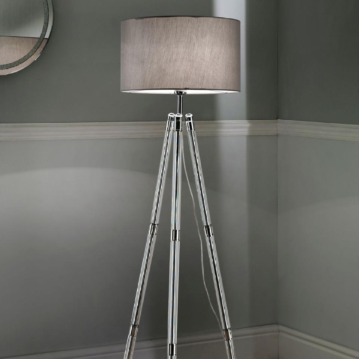 Hudson tripod floor lamp with crystal legs, chrome fixings and light grey linen shade. Explore contemporary elegance with the Hudson floor lamp, a fusion of modern design and timeless luxury. The cyrtal legs exude a radient brilliance, creating a stunning interplay of light and transparency. Combined with the sleek chrome fixings, the sleek and glamorous aesthetic effortlessly enhance any room. This lamp is a real showstopper. Hudson tripod floor lamp with crystal legs, chrome fixings and light grey linen shade. Explore contemporary elegance with the Hudson floor lamp, a fusion of modern design and timeless luxury. The cyrtal legs exude a radient brilliance, creating a stunning interplay of light and transparency. Combined with the sleek chrome fixings, the sleek and glamorous aesthetic effortlessly enhance any room. This lamp is a real showstopper.