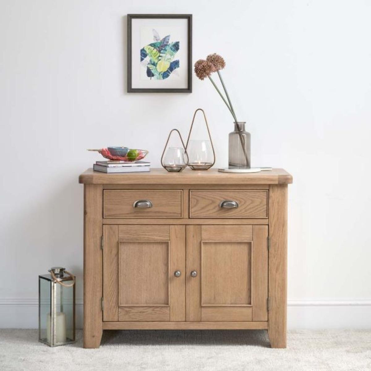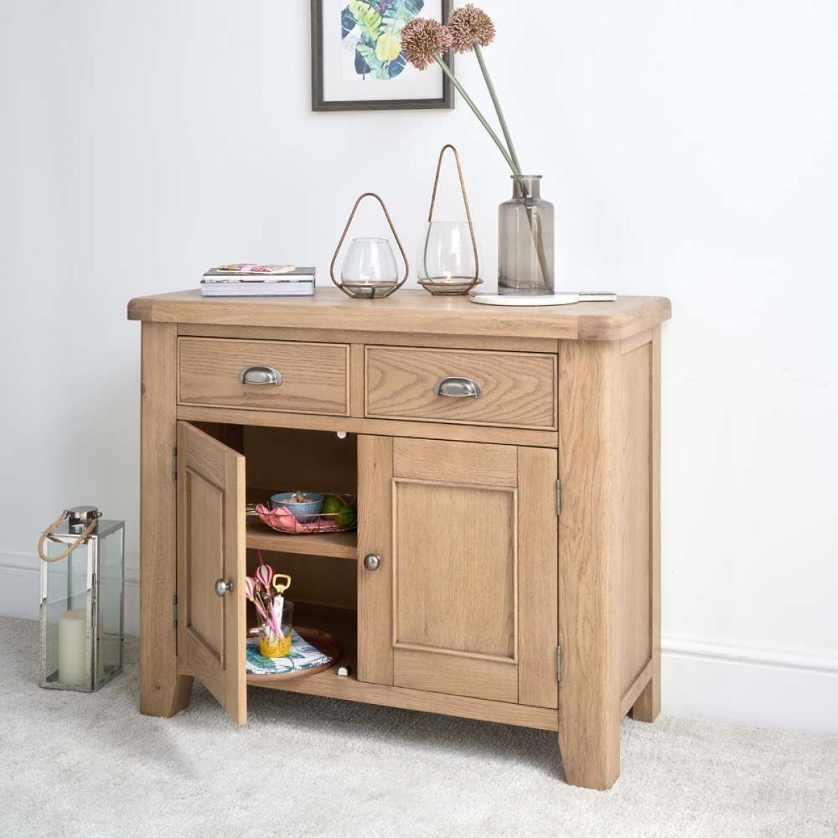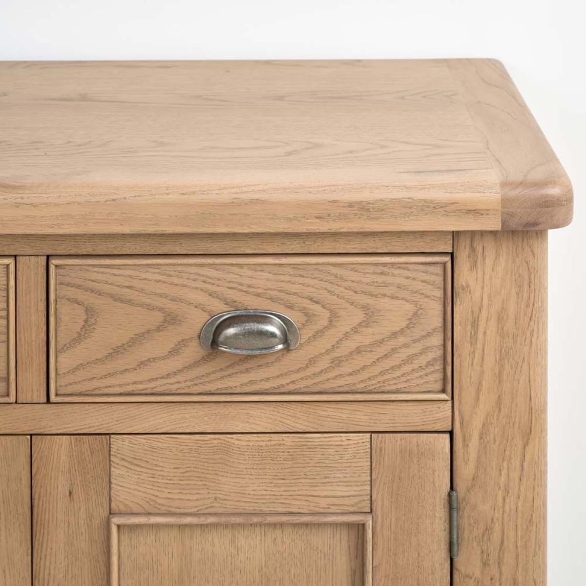 The Hudson Two Door Sideboard is a smaller alternative to the larger version, but still hosts a great amount of storage for typical dining essentials such as crockery, cutlery or textiles like napkins and tablecloths. The sidboard features two drawers with cup handles and a two door cabinet with internal shelf. Showcasing the beauty of natural wood, the side table is built from a mix of solid oak and oak veneers.