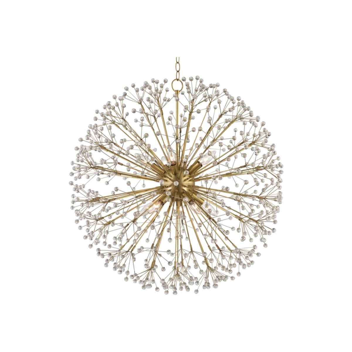 Densely populated with the highest-quality beveled crystal beads available, Dunkirk explodes on the scene. Candelabra bulbs from deep within illuminate the crystal-laden branches from behind for an effect that is both dazzling and mesmerizing. With a firework feel, Dunkirk is sure to become the centerpiece of any space, destined to cause oohs and ahhs. Available as a flush mount in two sizes and a chandelier in three, these fixtures can be used alone or together in scale for a breathtaking effect. Choose from Aged Brass or Polished Nickel.