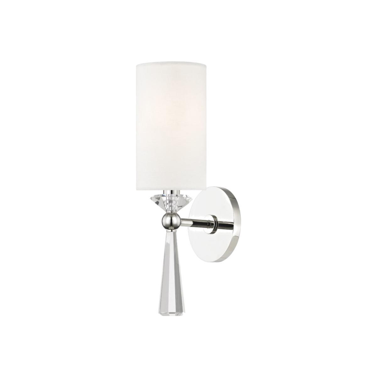 Clean-lined classical elegance in a sconce, Birch pairs a cinched arm of thick faceted crystal with a tall linen shade. Both materials do beautiful things with the light.