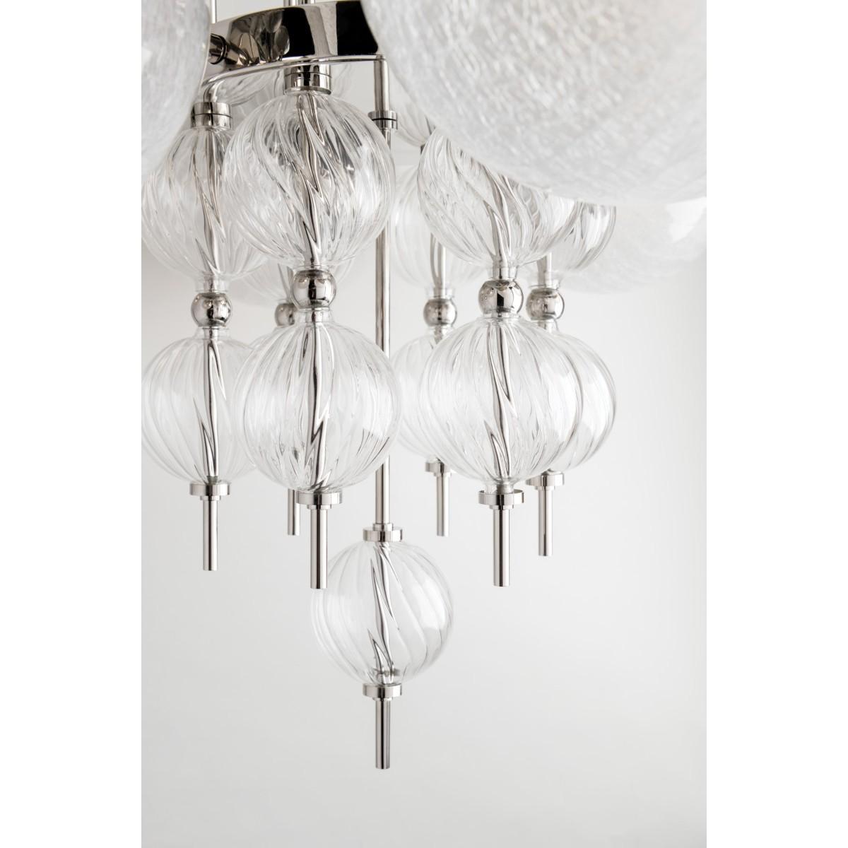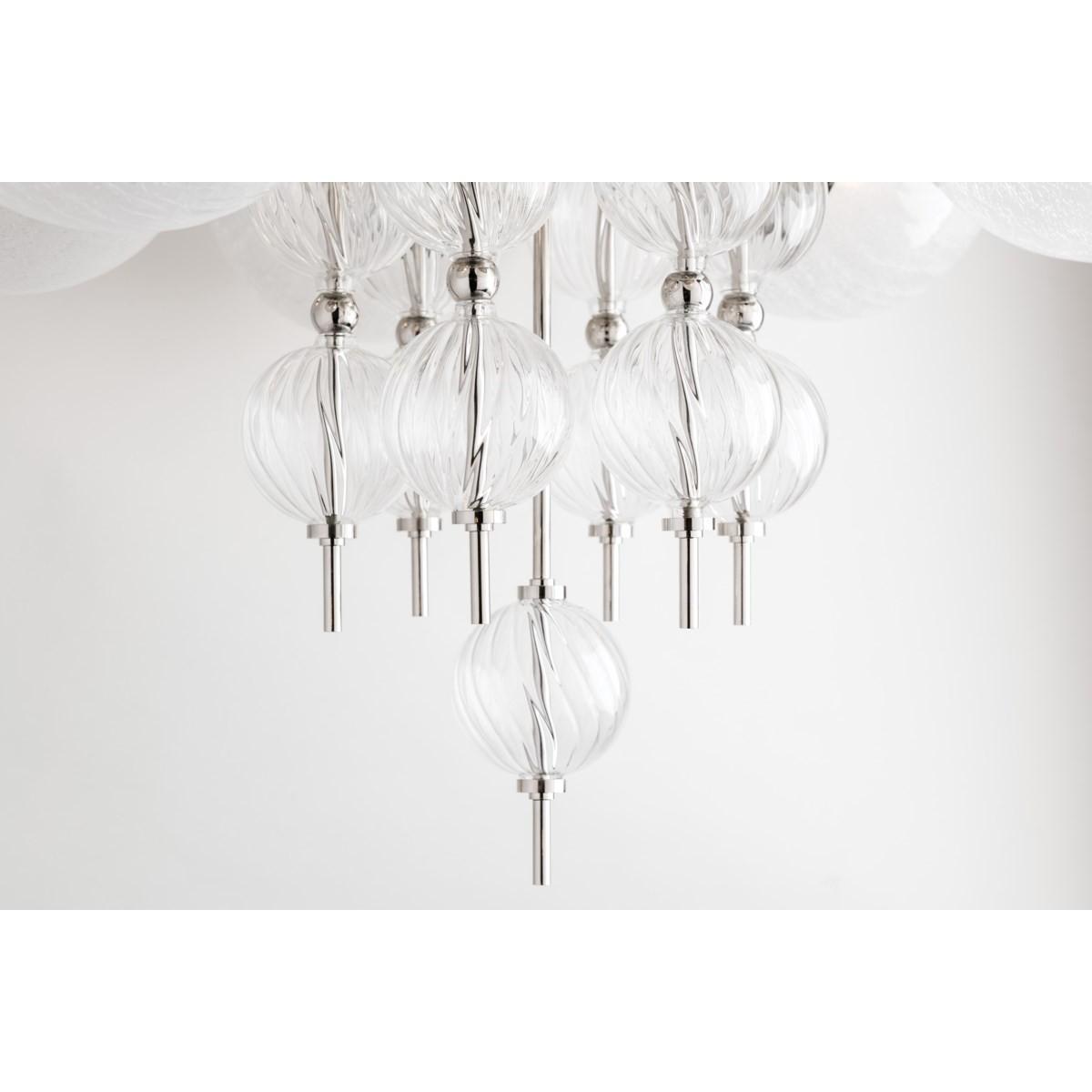 Whimsical and youthful, fresh and modern, Calypso brings big top flair to the space it lights up. A celebration of fun and geometry, its maximalist aesthetic with fluted-spiral hollow glass orbs and crackle-glass sphere diffusers makes it a wow-factor fixture which will stand out in a room with more restrained design.
