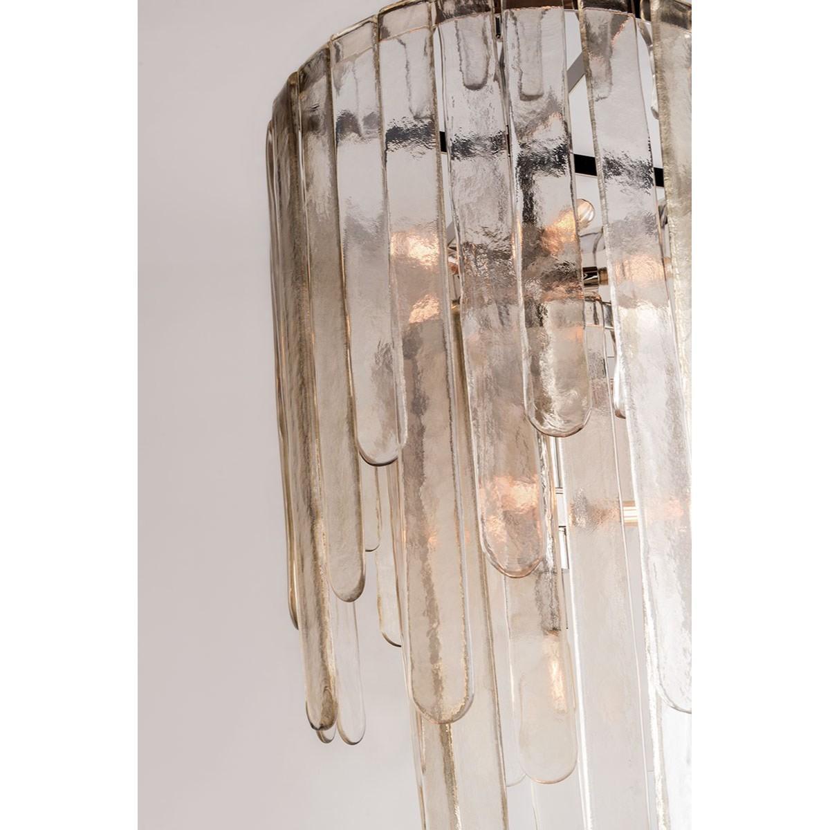 The trial-and-error nature of our creative process made Fenwater a delightful discovery, where the end product exceeded its initial intent. Here’s how it works: our artisans pour molten glass into molds of three different lengths. By design, the glass is rough and champagne-hued to suggest a degree of antiquity. The hooked glass panels hang in a three-layered cascade in staggered lengths. The resulting appearance is at once warm and woozy, watery and icy.