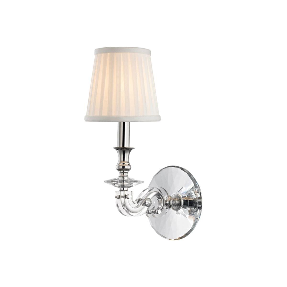 Fine silk pleated shades, crystal bobeches, and acrylic side-mounted planes along the arms make Lapeer a texturally rich and luxurious sconce. A faceted mirror backplate of cut crystal adds to the piece’s grand allure.