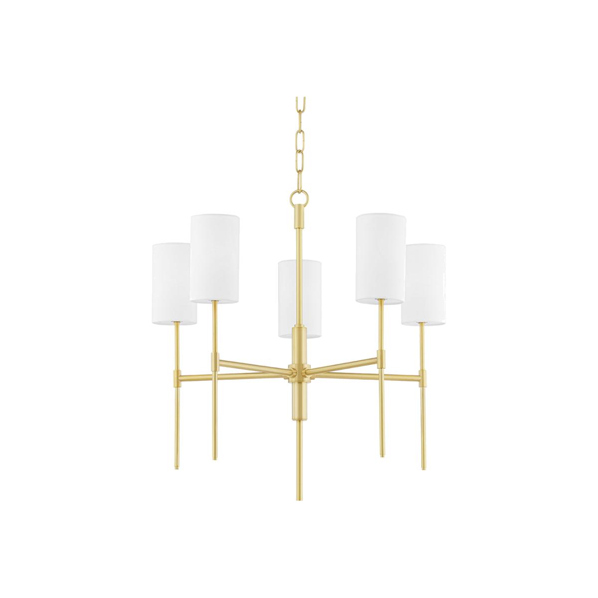 Add some elegance and luxury to your home with this stylish Olivia chandelier from Hudson Valley Lighting. This beautiful chandelier has a minimal design and is made from brass. Hanging from the ce. View More. Add some elegance and luxury to your home with this stylish Olivia chandelier from Hudson Valley Lighting. This beautiful chandelier has a minimal design and is made from brass. Hanging from the ceiling with a central brass chain, the chandelier has five spokes which each support a shade made from white linen to conceal the bulb. It has a simple but elegant style which makes it suitable for a number of interior design styles. This chandelier is suitable for a lounge or dining room, where the room is sufficiently large to accommodate a chandelier taking five bulbs. It measures 62. 23cms high.