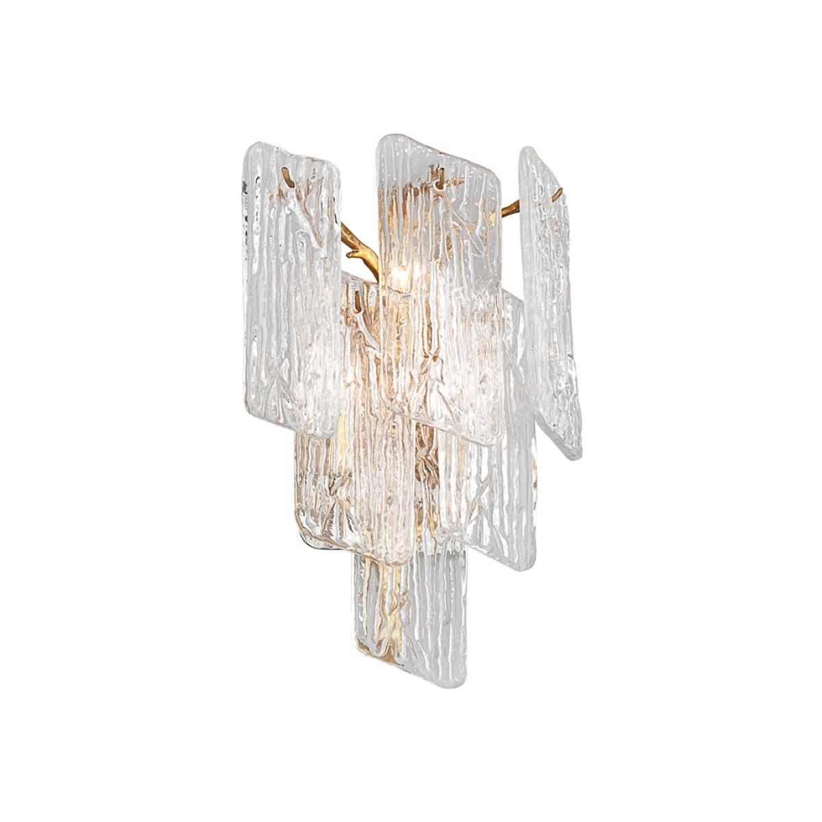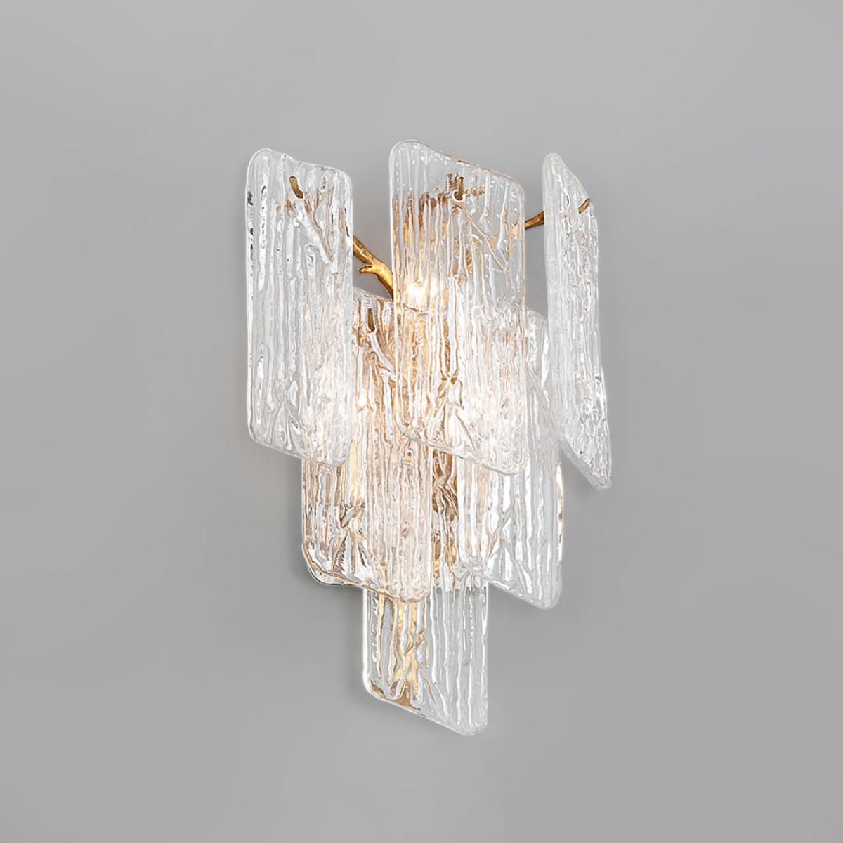 This beautiful wall light is made from patterned clear glass and is reminiscent of icicles hanging from a tree in winter. The shade is back lit by three bulbs, making the piece look stunning and pr. View More. This beautiful wall light is made from patterned clear glass and is reminiscent of icicles hanging from a tree in winter. The shade is back lit by three bulbs, making the piece look stunning and providing a focal point for your room. This piece is held to the wall with a copper support that reminds the viewer of the branches of a tree. You will feel as if you are in a winter wonderland if you have this stunning piece in your home. It will look equally magnificent in your living room, dining room or hallway, and be a talking point for all your visitors.
