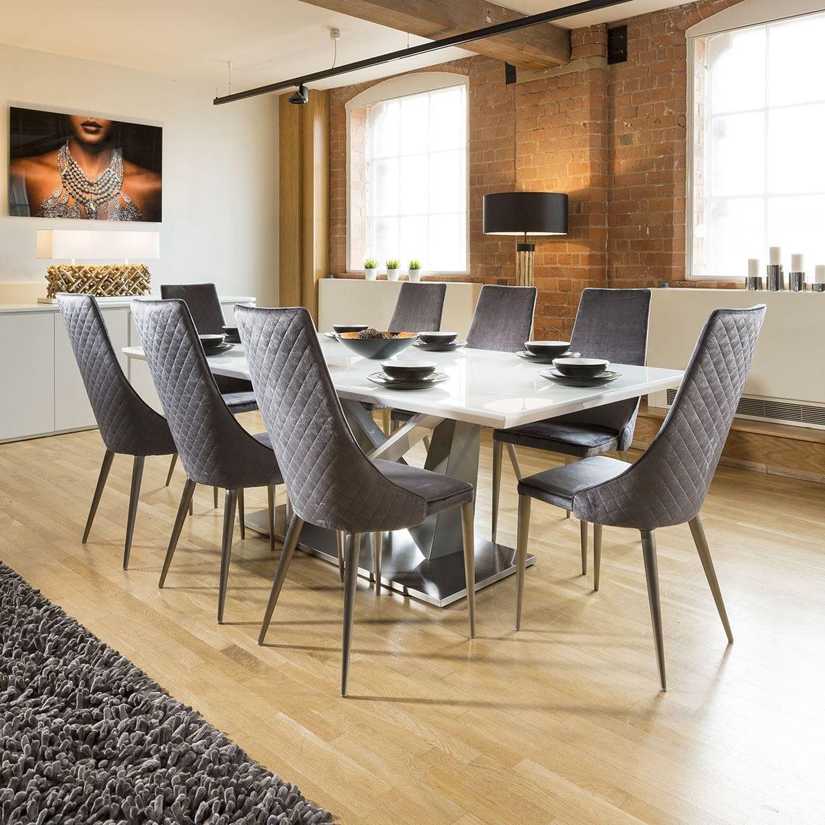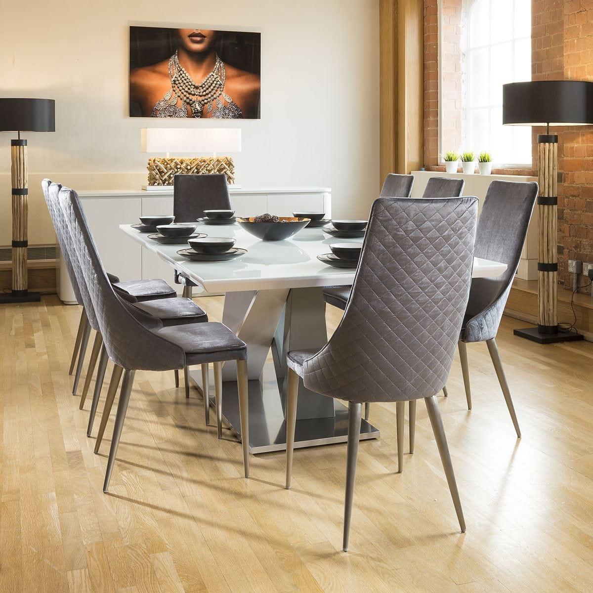 Huge 8 Seater Dining Set 2.2 White Glass Top Table 8 Grey Velvet Chair