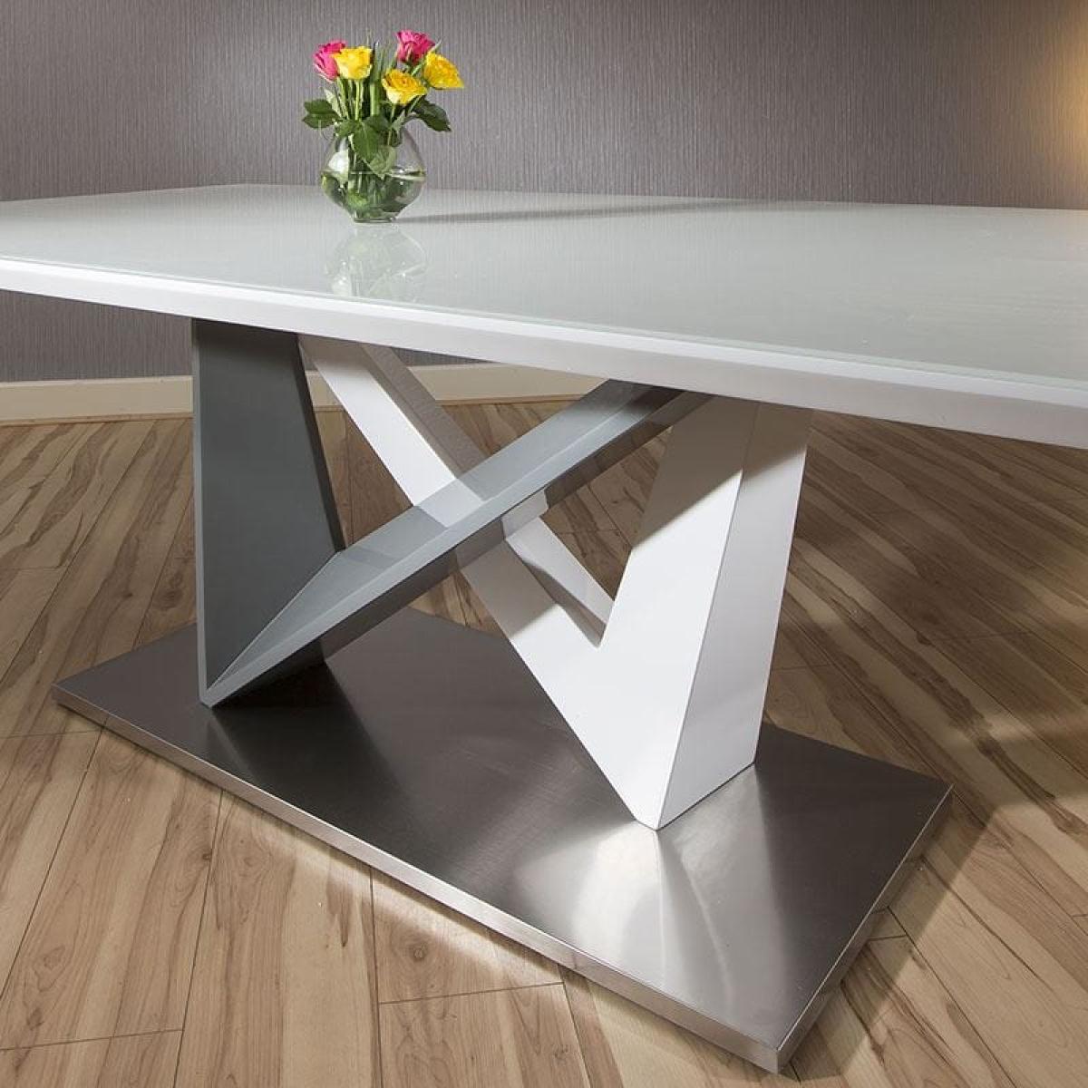 Luxury White Dining Set, Rectangular Table with Super-White Glass Top and 8 high Back Grey Velvet Chairs. Stunning table features beautiful white glass top, strong white and grey gloss stem and brushed stainless steel heavy base. All tables and chairs have nylon feet under to protect your floor. Extremely high qualiy chairs have feature stitching on the seat back and stainless steel legs. W110cm D220cm H75cm Set includes 1 x dining table and 8 chairs Mix and Match any of our tables and chairs