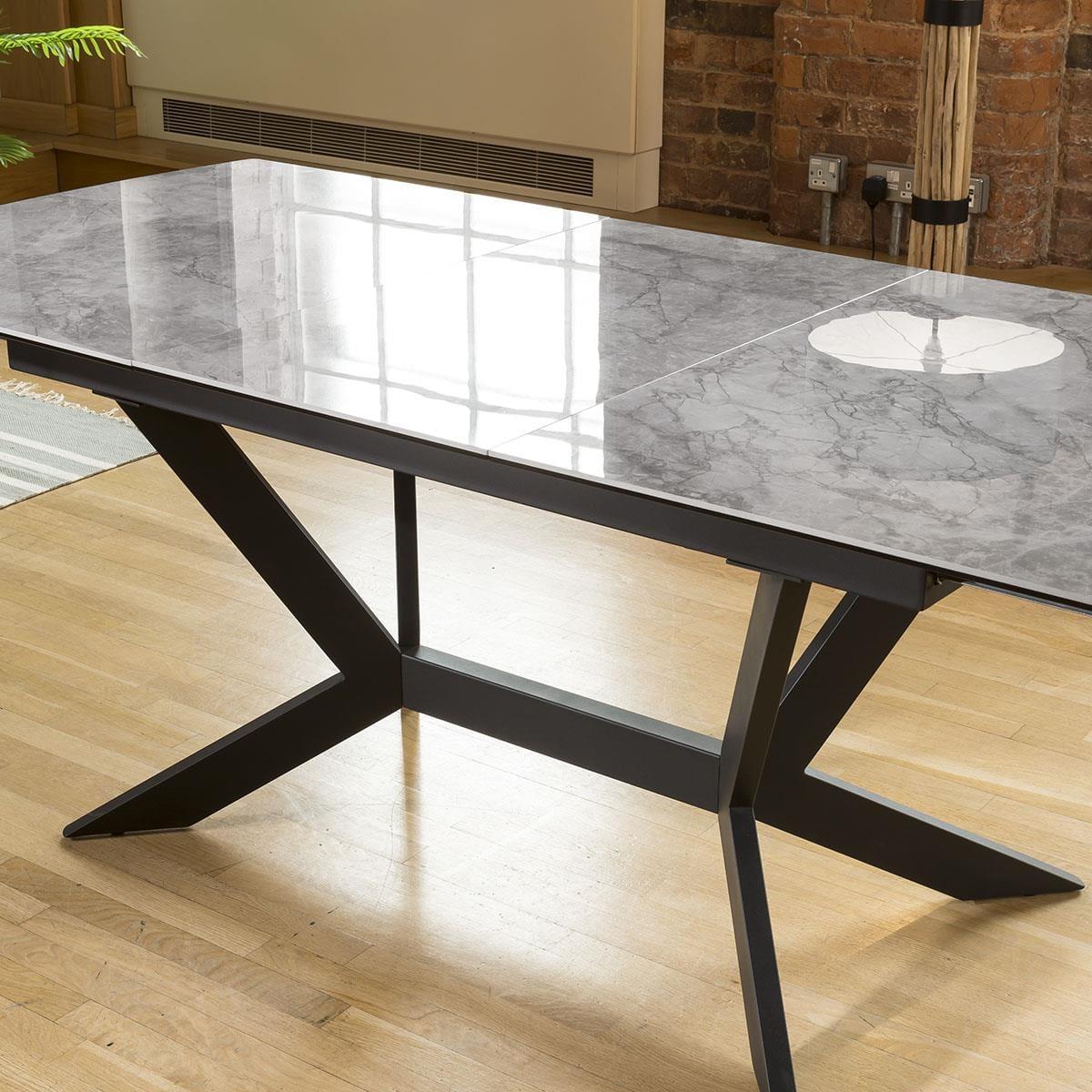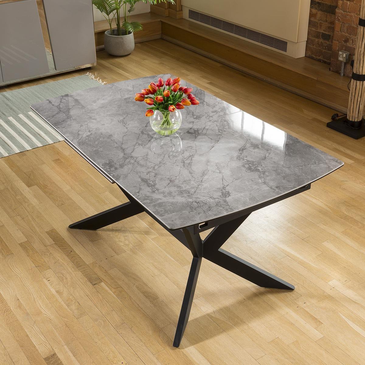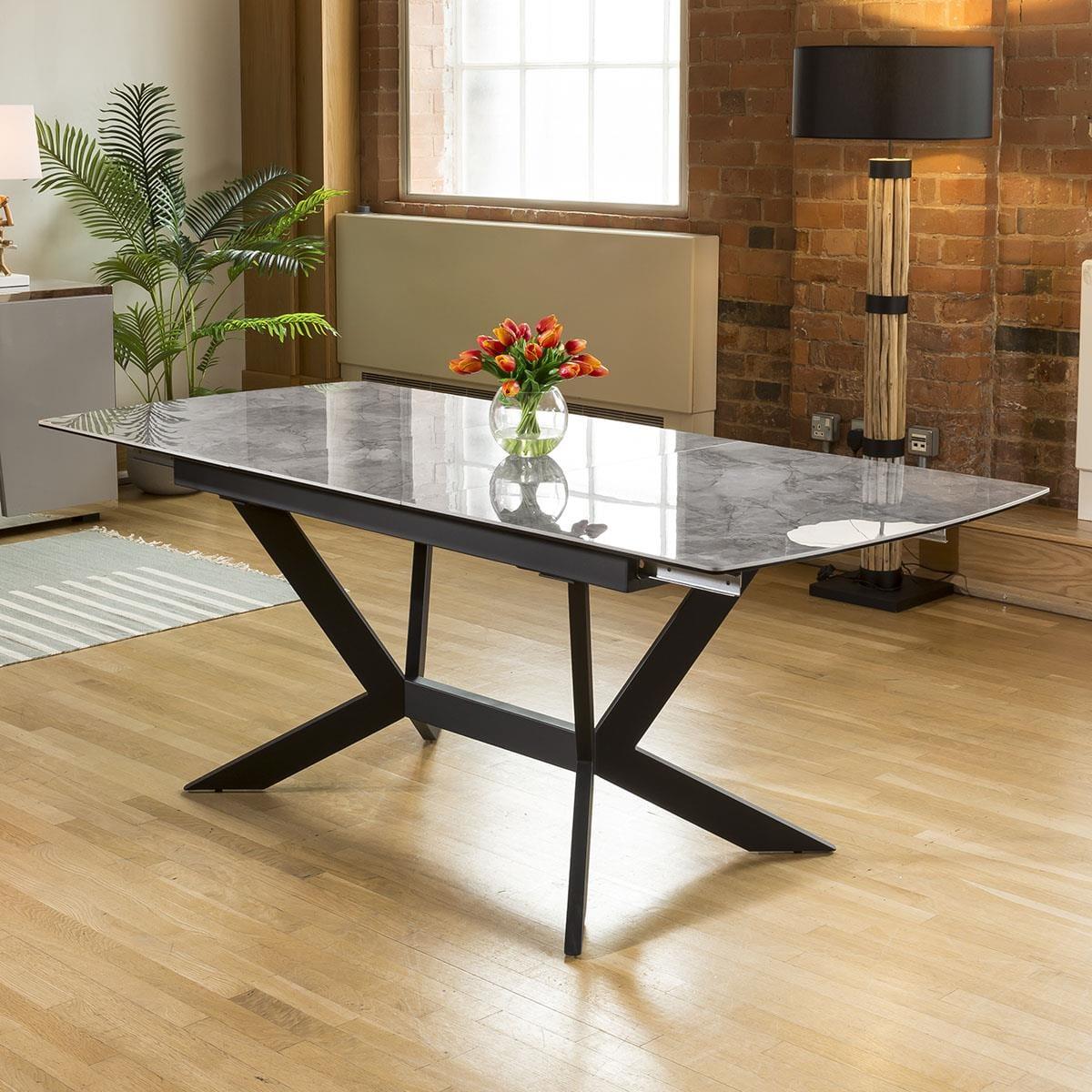 1500-2000mm extending ceramic table with an automatic extension lifting function. Stunning grey ceramic top with auto extending function enabling one person to extend alone. The frame and angled legs are a steel construction with a black powder coating which really does give this table the wow factor. Quatropi Premium Dining tables are among the highest quality designer tables in the world, with a wide choice of in-stock and made to order options. Our tables come in many forms including; round, oval, glass, marble effect, ceramic, concrete, solid oak, as well as wooden veneers in a chosen finish. Choose your size; from small, large, to extra large when extended with our extendable options that include extension leaves and folding mechanisms. Get the family together with our large 12 seater, 8 seater, and 6 seater dining sets with a large choice of dining chairs available, or for smaller dining rooms our 4 seater dining table and chair sets are the perfect choice! W200cm D90cm H75cm Grey marble effect ceramic with a smooth polished finish Ceramic is scratch, stain and heat resistant