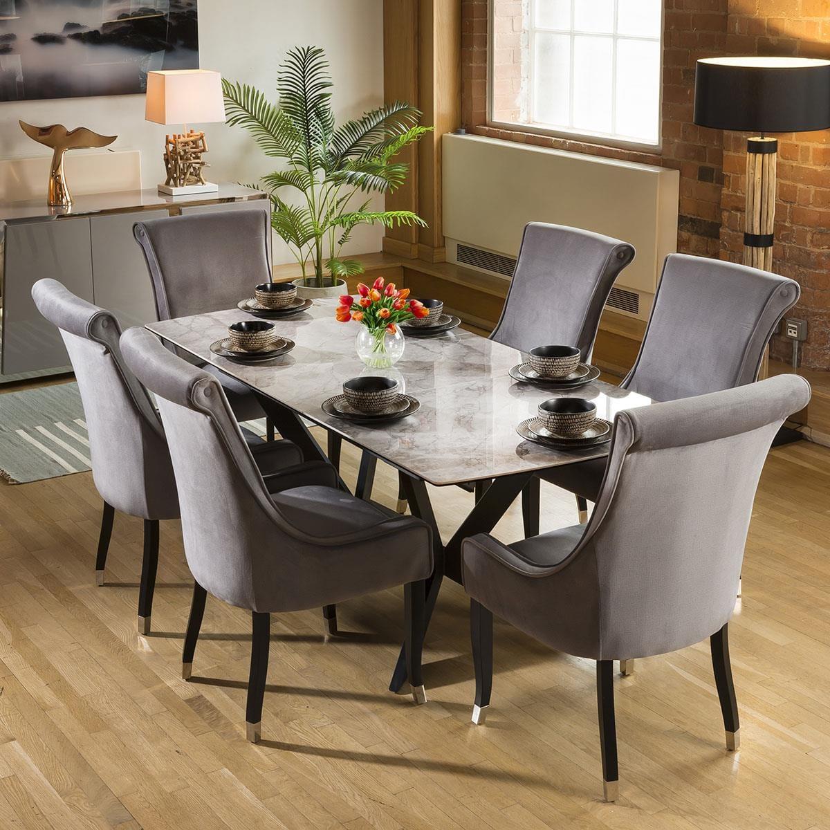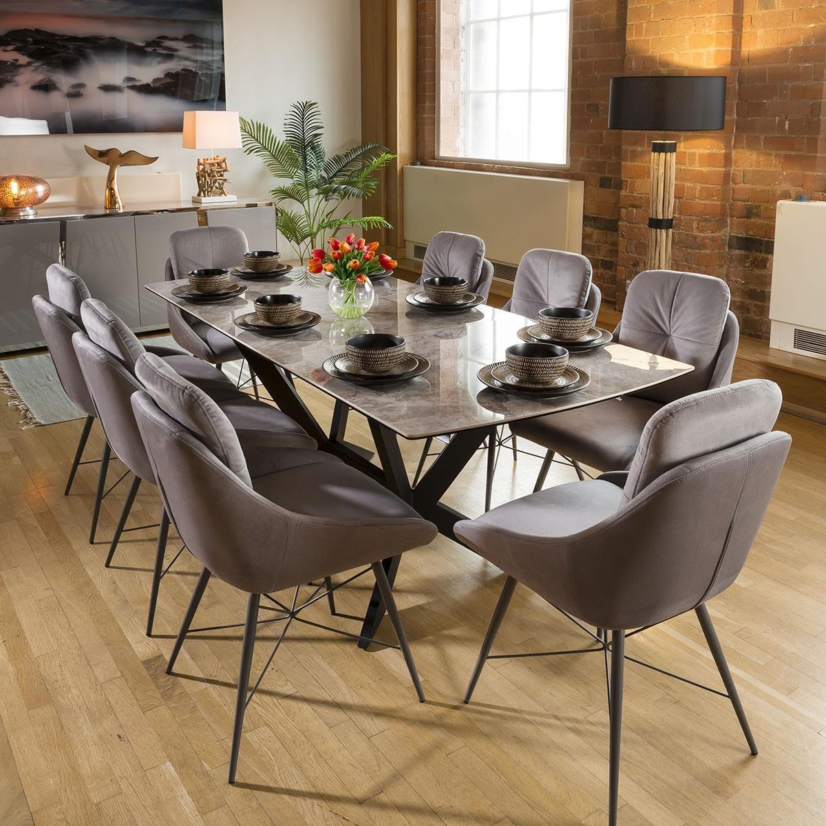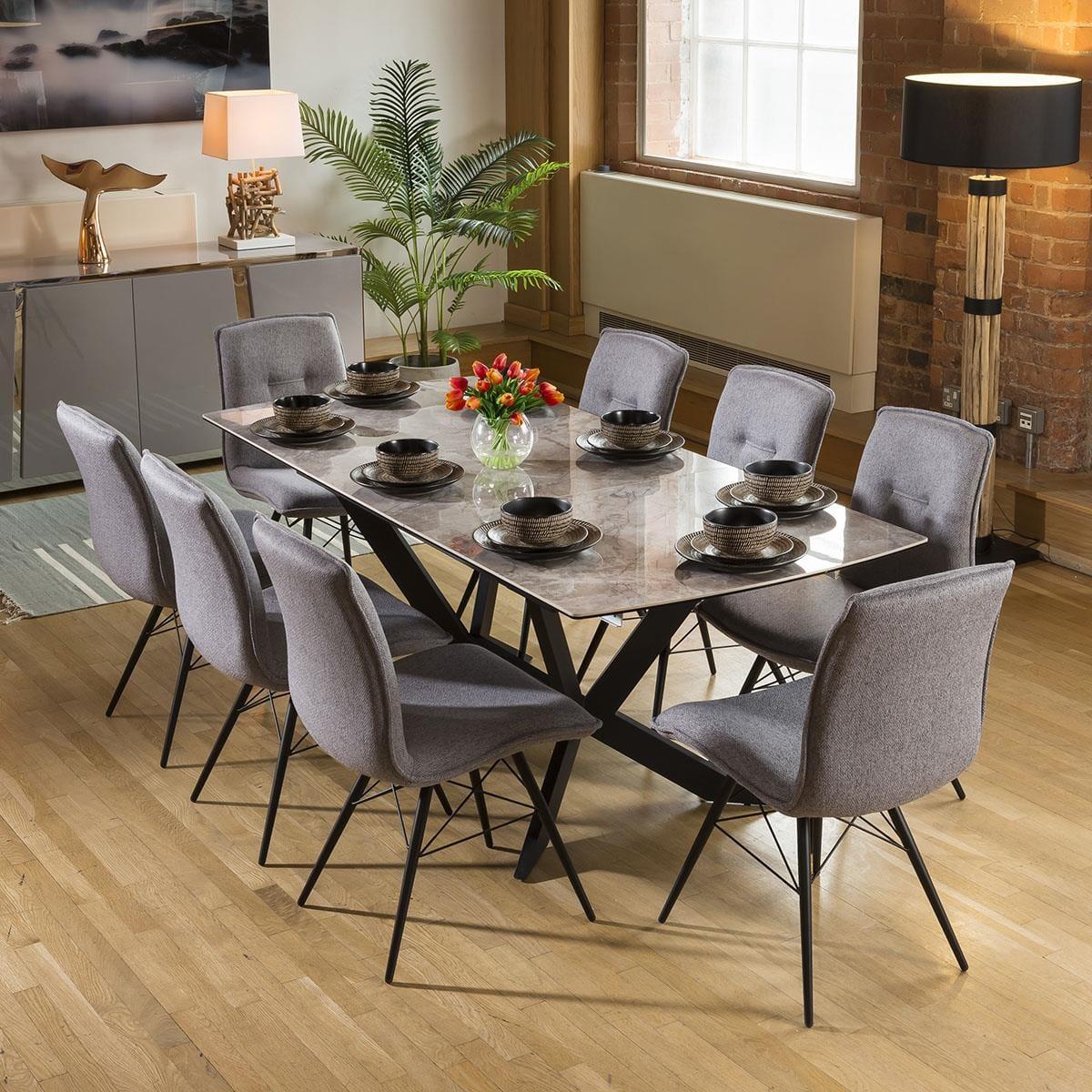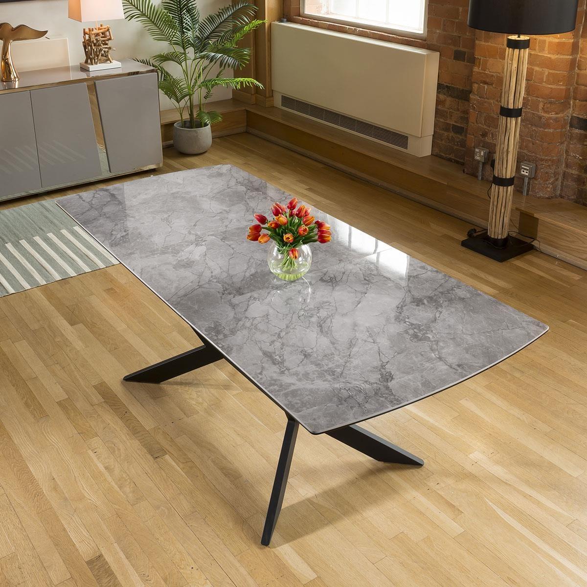1500-2000mm extending ceramic table with an automatic extension lifting function. Stunning grey ceramic top with auto extending function enabling one person to extend alone. The frame and angled legs are a steel construction with a black powder coating which really does give this table the wow factor. Quatropi Premium Dining tables are among the highest quality designer tables in the world, with a wide choice of in-stock and made to order options. Our tables come in many forms including; round, oval, glass, marble effect, ceramic, concrete, solid oak, as well as wooden veneers in a chosen finish. Choose your size; from small, large, to extra large when extended with our extendable options that include extension leaves and folding mechanisms. Get the family together with our large 12 seater, 8 seater, and 6 seater dining sets with a large choice of dining chairs available, or for smaller dining rooms our 4 seater dining table and chair sets are the perfect choice! W200cm D90cm H75cm Grey marble effect ceramic with a smooth polished finish Ceramic is scratch, stain and heat resistant