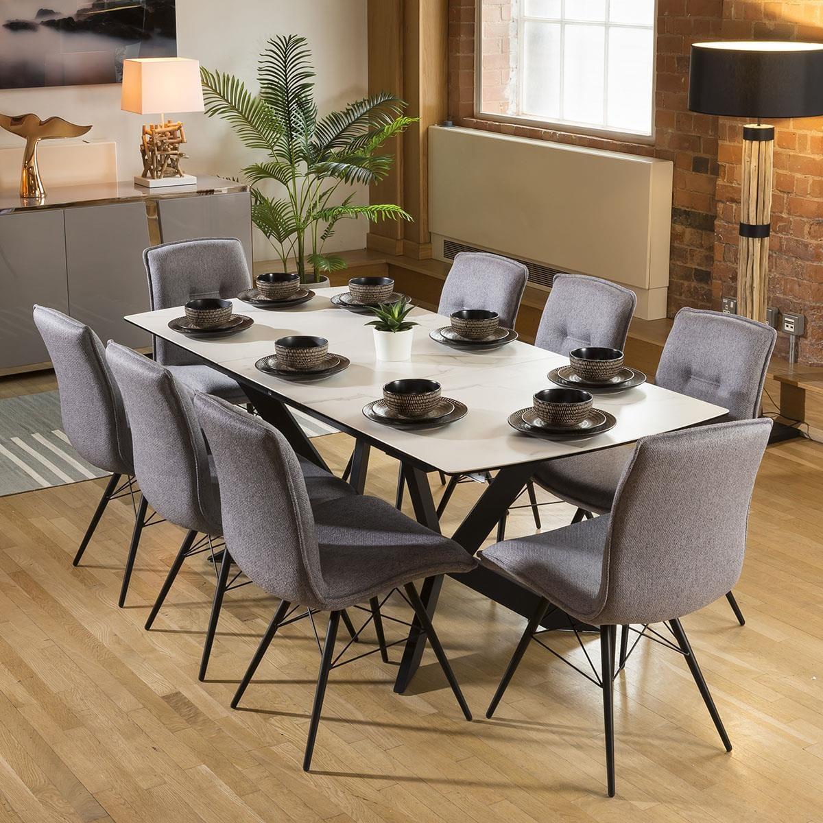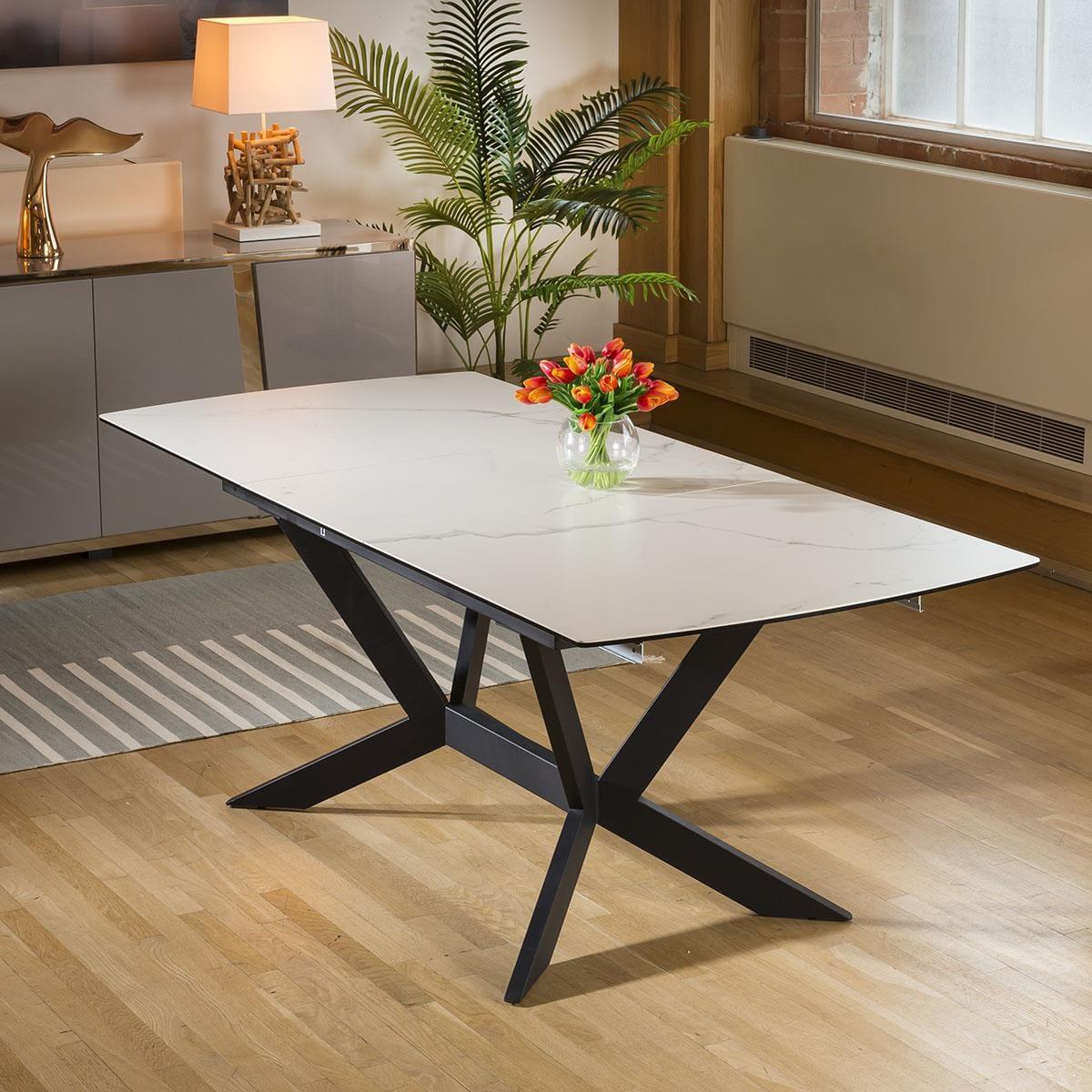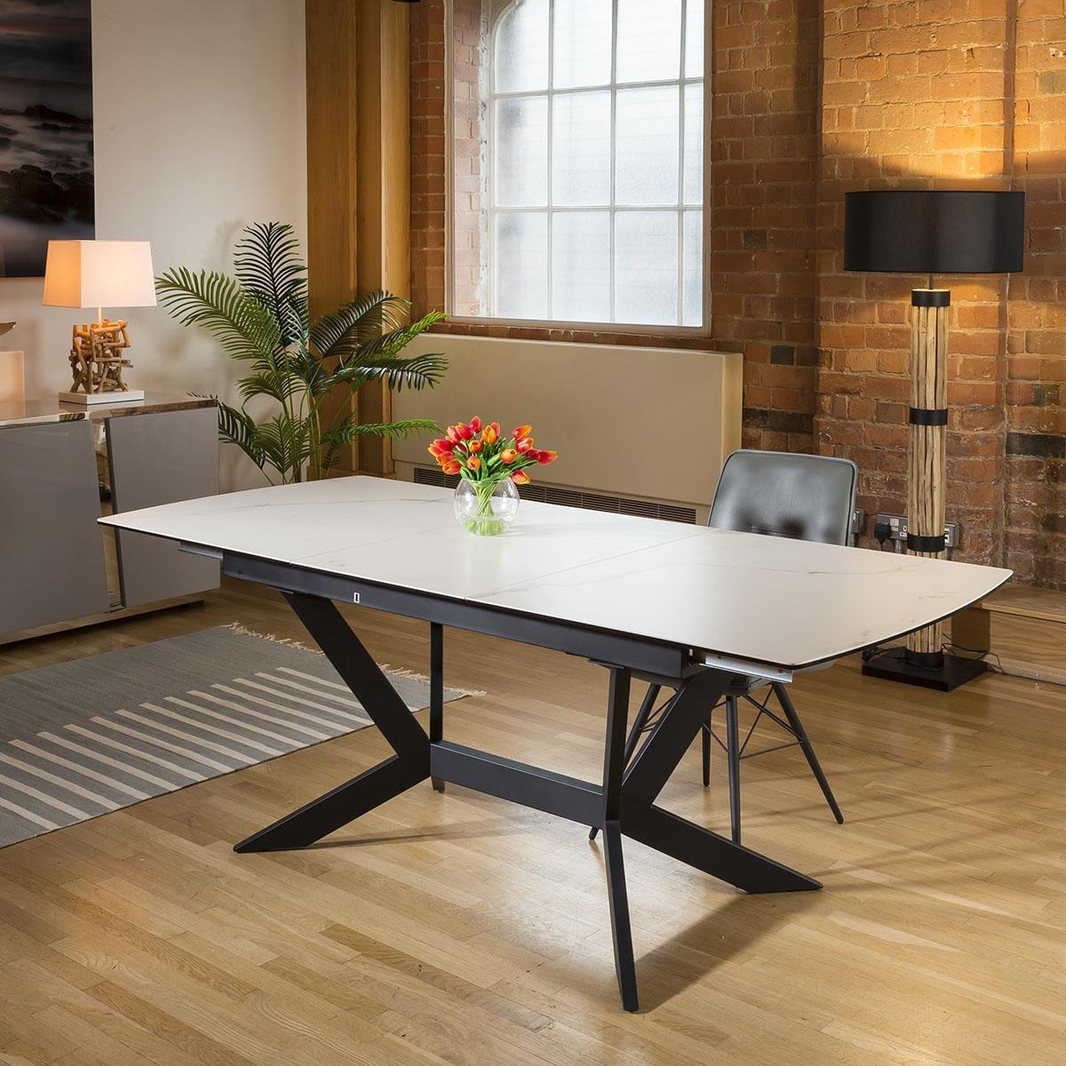 1500-2000mm extending ceramic table with an automatic extension lifting function. Stunning Spanish white ceramic top with auto extending function enabling one person to extend alone. The frame and angled legs are a steel construction with a black powder coating which really does give this table the wow factor. Quatropi Premium Dining tables are among the highest quality designer tables in the world, with a wide choice of in-stock and made to order options. Our tables come in many forms including; round, oval, glass, marble effect, ceramic, concrete, solid oak, as well as wooden veneers in a chosen finish. Choose your size; from small, large, to extra large when extended with our extendable options that include extension leaves and folding mechanisms. Get the family together with our large 12 seater, 8 seater, and 6 seater dining sets with a large choice of dining chairs available, or for smaller dining rooms our 4 seater dining table and chair sets are the perfect choice! W200cm D90cm H75cm White marble effect ceramic with a textured matte finish Ceramic is scratch, stain and heat resistant