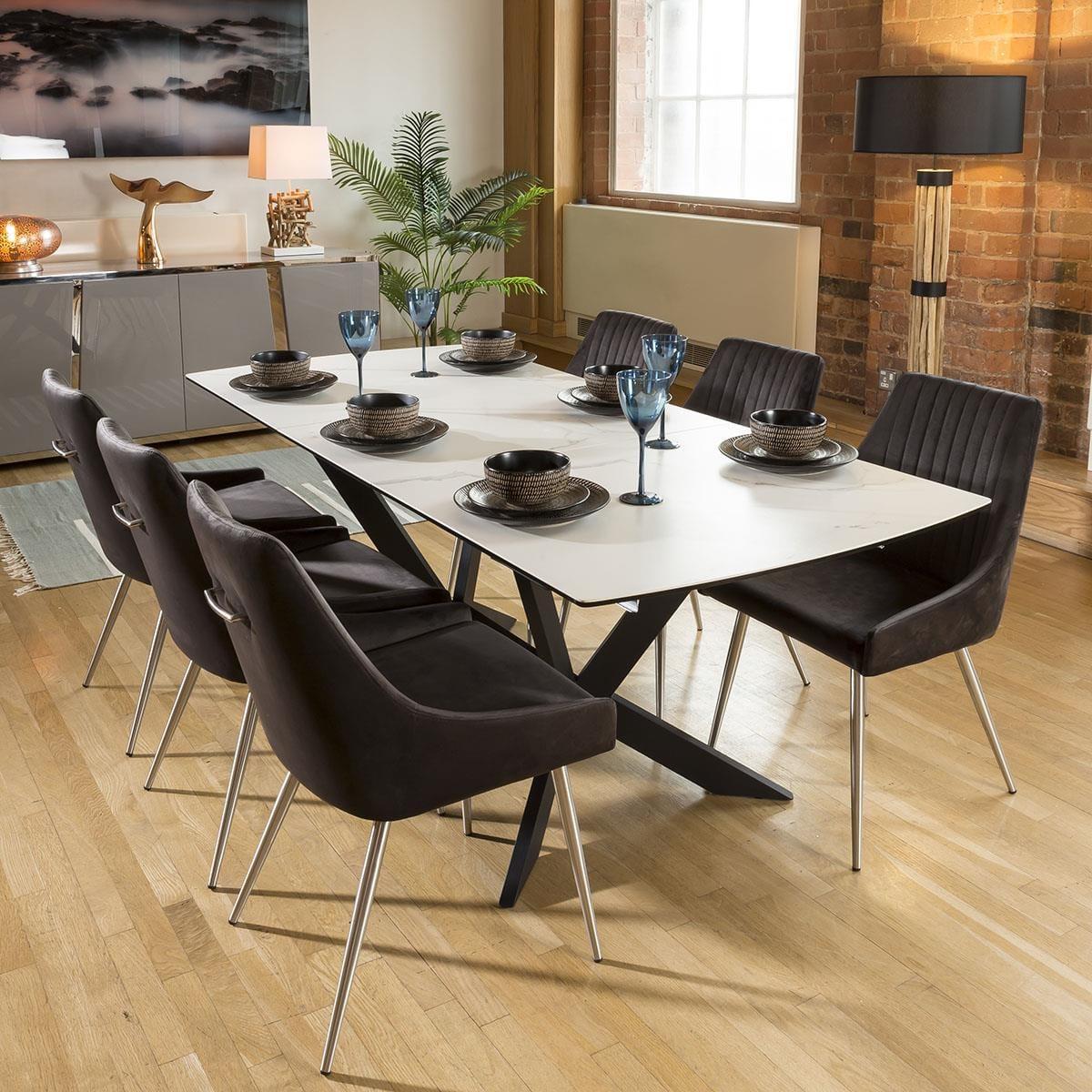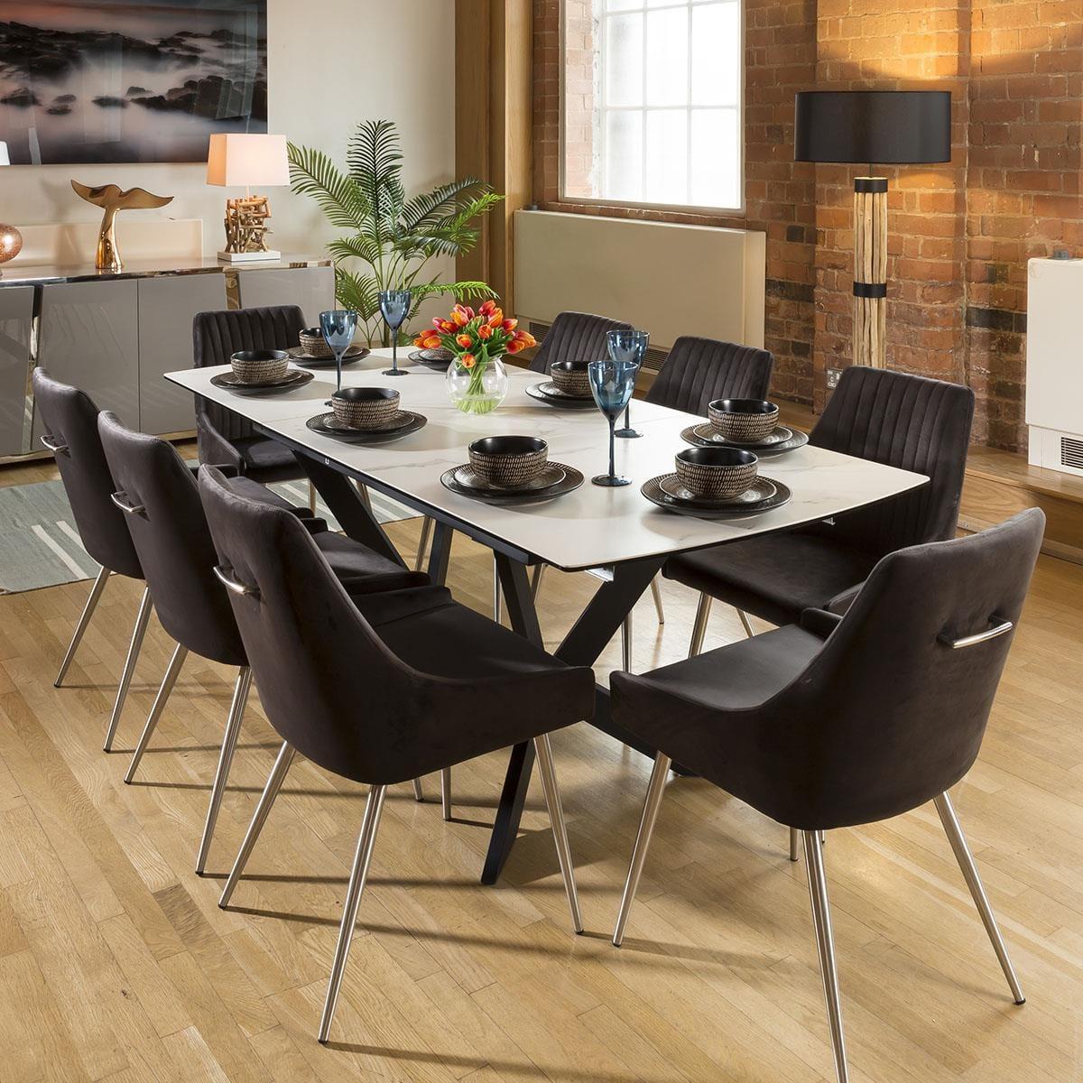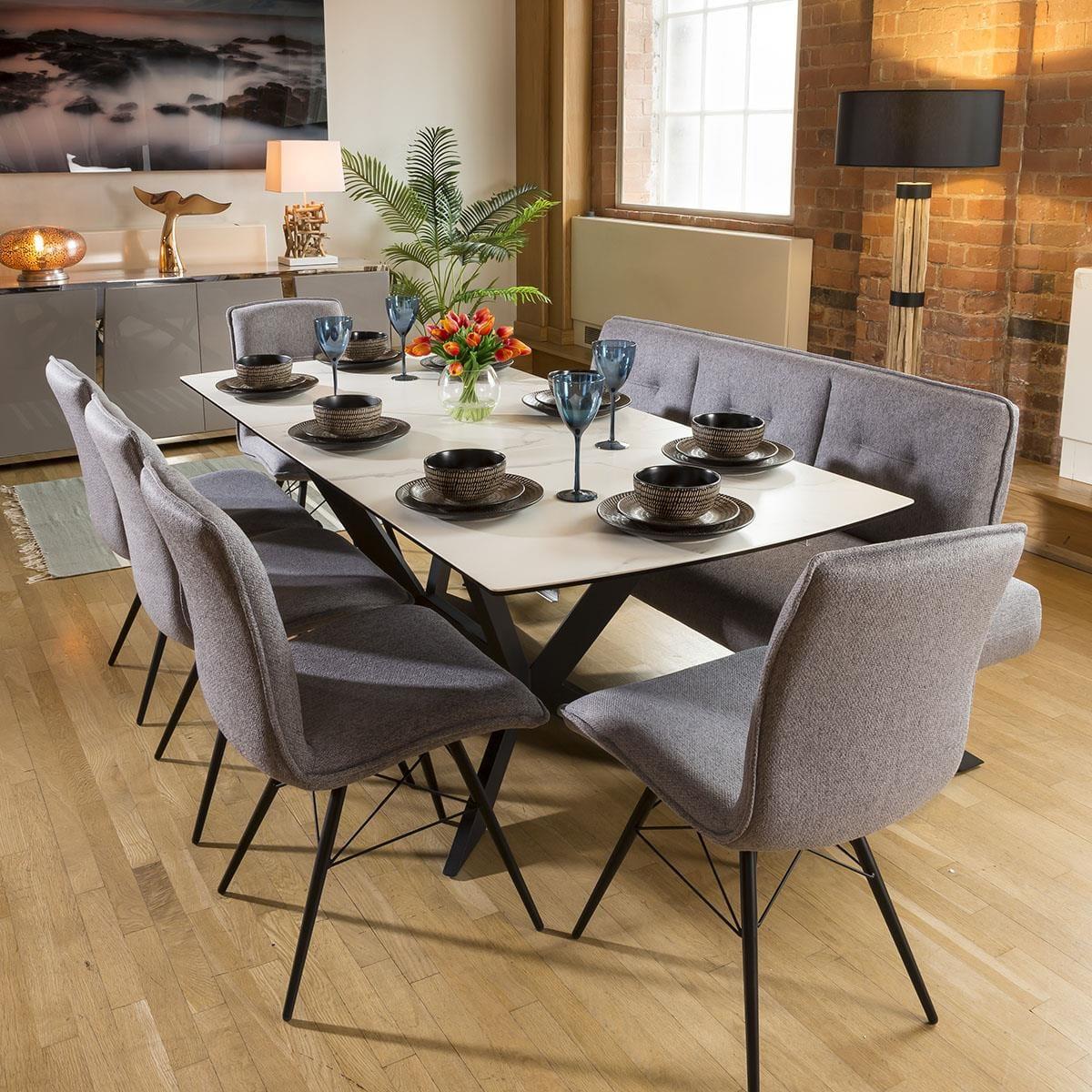 1500-2000mm extending ceramic table with an automatic extension lifting function. Stunning Spanish white ceramic top with auto extending function enabling one person to extend alone. The frame and angled legs are a steel construction with a black powder coating which really does give this table the wow factor. Quatropi Premium Dining tables are among the highest quality designer tables in the world, with a wide choice of in-stock and made to order options. Our tables come in many forms including; round, oval, glass, marble effect, ceramic, concrete, solid oak, as well as wooden veneers in a chosen finish. Choose your size; from small, large, to extra large when extended with our extendable options that include extension leaves and folding mechanisms. Get the family together with our large 12 seater, 8 seater, and 6 seater dining sets with a large choice of dining chairs available, or for smaller dining rooms our 4 seater dining table and chair sets are the perfect choice! W200cm D90cm H75cm White marble effect ceramic with a textured matte finish Ceramic is scratch, stain and heat resistant
