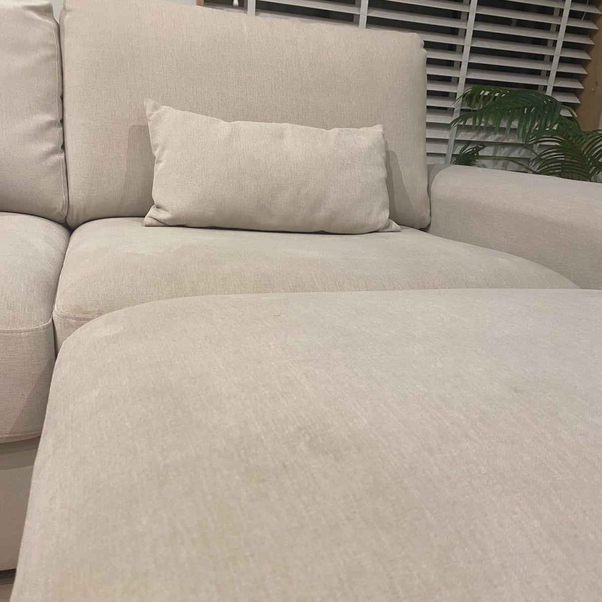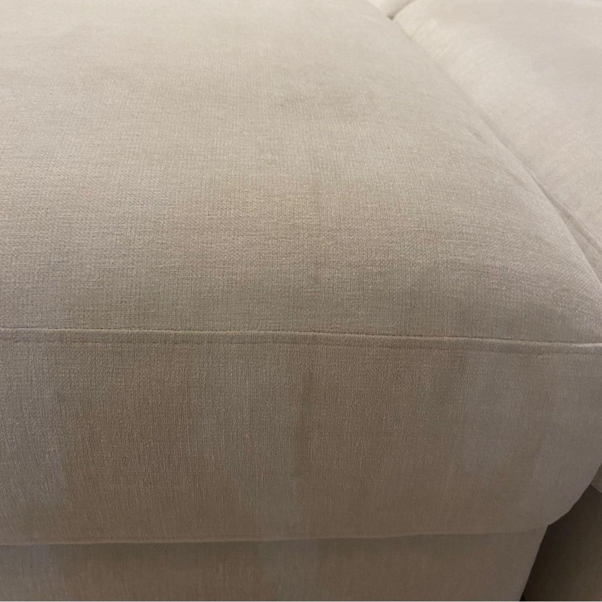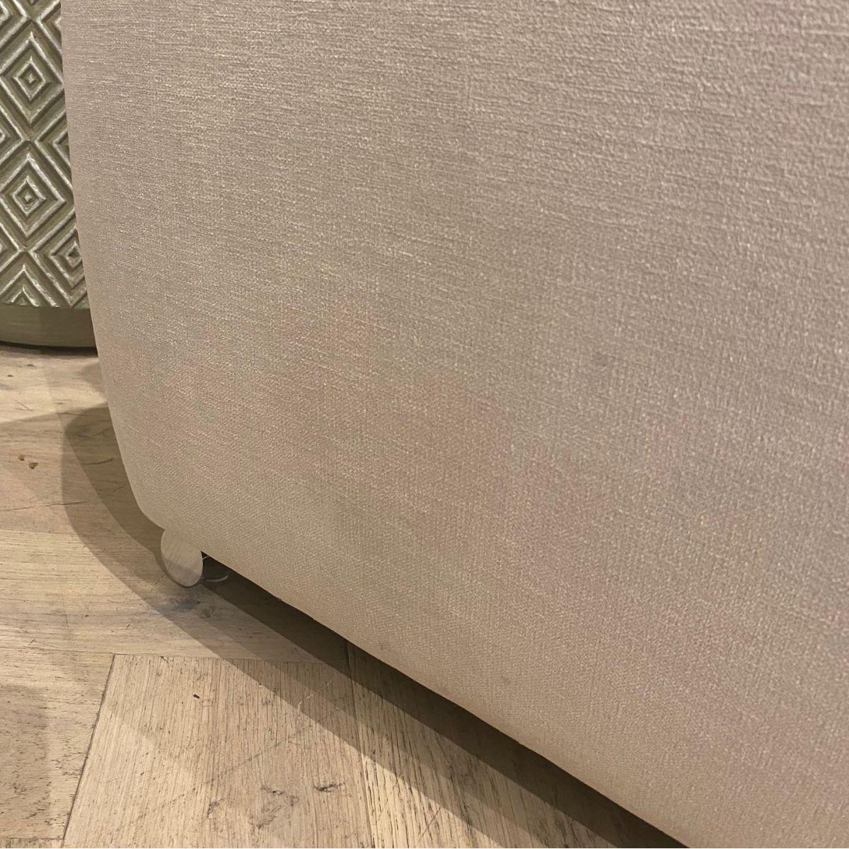 A beautiful Exdisplay sofa which can be arranged with the footstool making a chaise end on which ever section you prefer or just left as a stand alone stool. Four bolster cushions are also included. Please note this is an Ex Display sofa and does carry some noticeable marks on the light ivory coloured fabric. Additional images are shown to show an example of the marks Incredible comfort is derived from superior Nosag springs in the seat frame and the pocket springs with high quality foam and fibre seat and back cushions. One touch of the thick heavy duty fabric will confirm that you can have a fabric that combines strength, style and comfort. Superwide arms, stainless steel feet, oversize proportions. All this is built on a strong solid wood frame and will be delivered in a few sections that easily clip together. THIS IS A NONE RETURNABLE ITEM DUE TO IT BEING MARKED, EXDISPLAY AND SUCH A GREAT PRICE.
