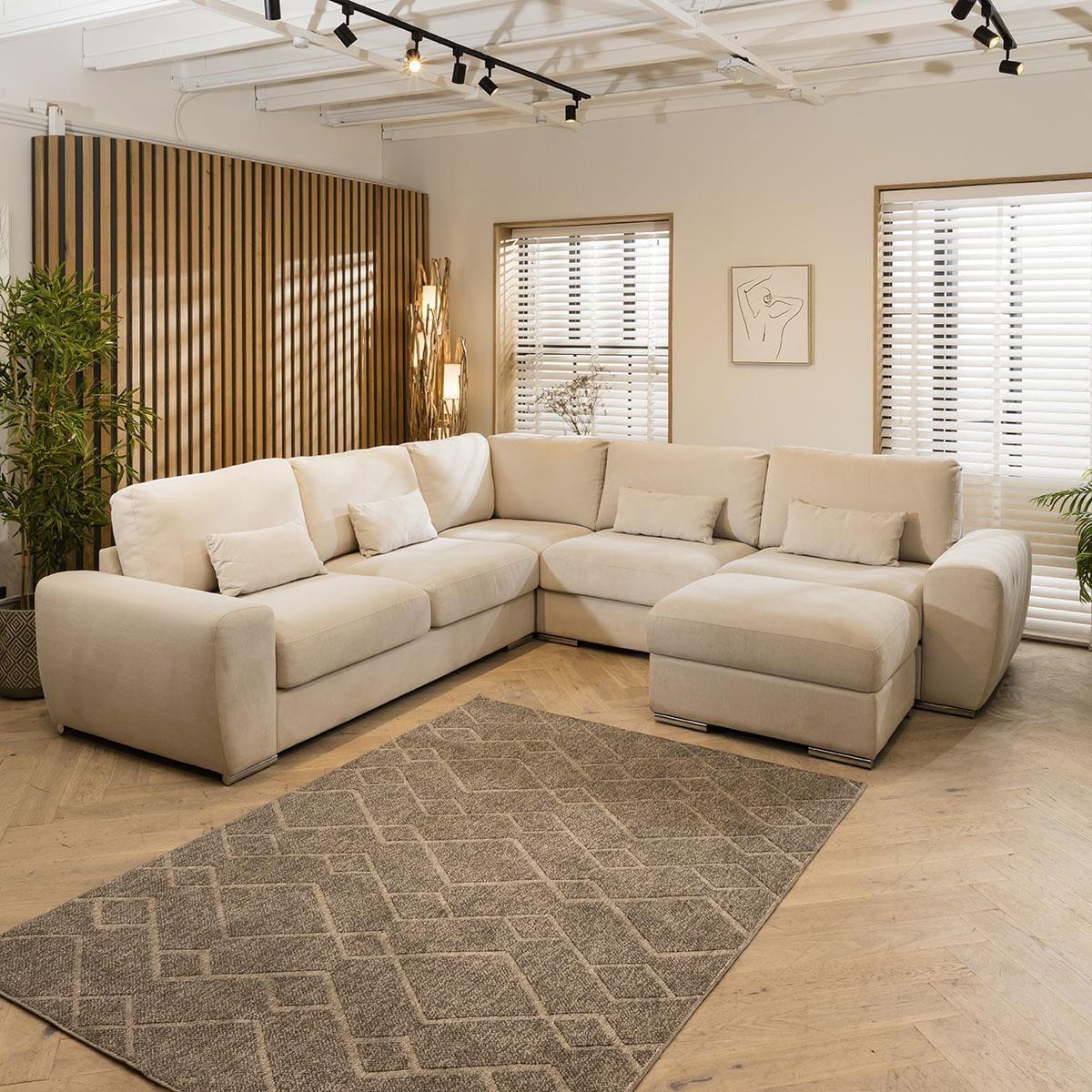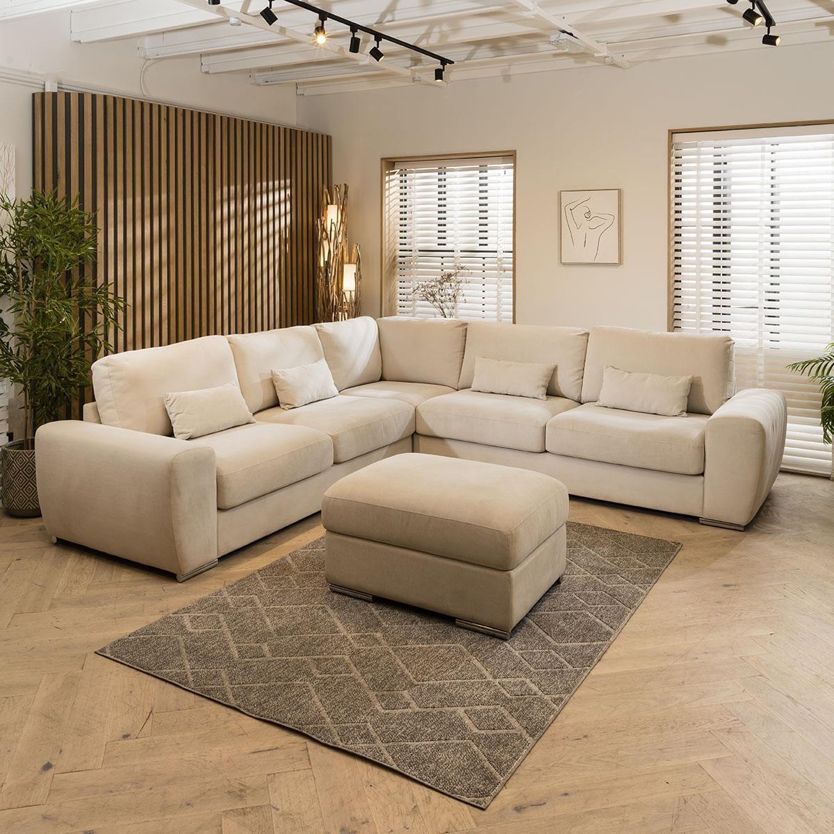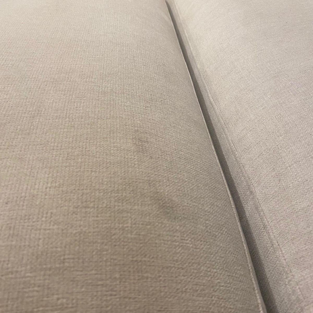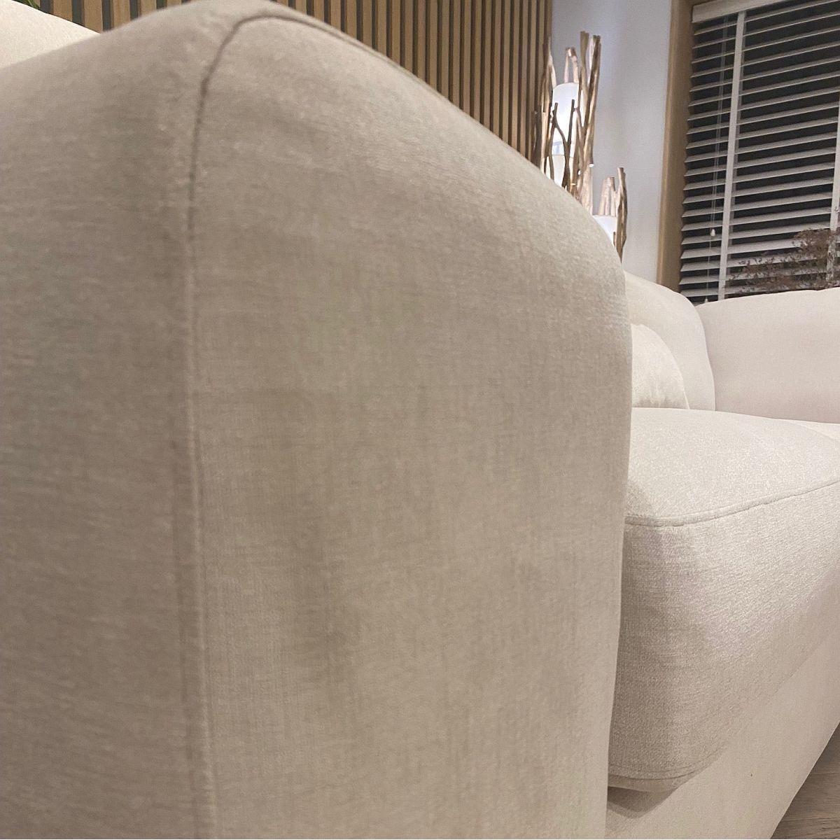 A beautiful Exdisplay sofa which can be arranged with the footstool making a chaise end on which ever section you prefer or just left as a stand alone stool. Four bolster cushions are also included. Please note this is an Ex Display sofa and does carry some noticeable marks on the light ivory coloured fabric. Additional images are shown to show an example of the marks Incredible comfort is derived from superior Nosag springs in the seat frame and the pocket springs with high quality foam and fibre seat and back cushions. One touch of the thick heavy duty fabric will confirm that you can have a fabric that combines strength, style and comfort. Superwide arms, stainless steel feet, oversize proportions. All this is built on a strong solid wood frame and will be delivered in a few sections that easily clip together. THIS IS A NONE RETURNABLE ITEM DUE TO IT BEING MARKED, EXDISPLAY AND SUCH A GREAT PRICE.
