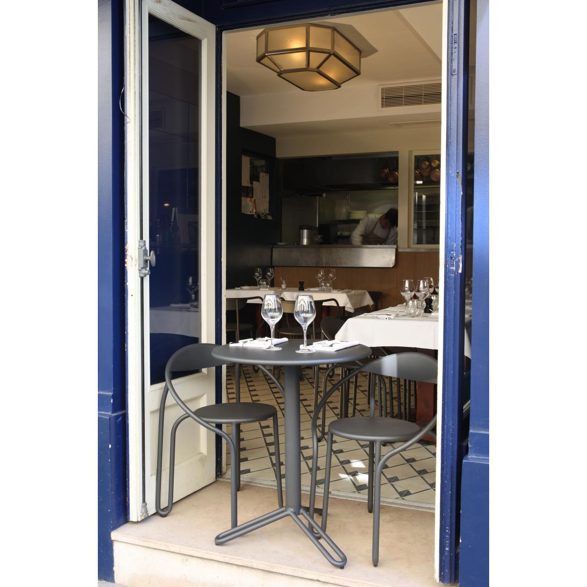 An ultra-graphic style for this elegant little aluminium armchair. Discrete at first glance, Huggy stands out due to its wonderful set of legs! From a stripped-back design, French designer Antoine Lesur has created a collection of chairs and tables in an up-to-date bistro style. The curved, sensual lines split, playing with solid and empty spaces to form a structure that is both airy and full of character. Equally as suitable indoors and out, the Huggy collection is made completely from aluminium. This furniture is characterised by its extreme lightness and great robustness. This small armchair, with its industrial chic style, happily adapts to all interiors. Weather-resistant, it can be moved from the kitchen to the garden with the seasons to match your requirements! Complying with NF (French) standards, all the items in the Huggy collection are compatible with professional use (hotels, restaurants, local authorities etc). With its compact dimensions, the Huggy Bistro Chair stackable armchair will find its place in the smallest spaces at home as well as in restaurants or bars. It stacks for easy storage. It matches perfectly with the round bistro table 75 and the rest of the models in the collection. A reversible foam cushion covered with resistant canvas on the outside and washable, adapts perfectly to the seat thanks to the optional straps (contact us to order).