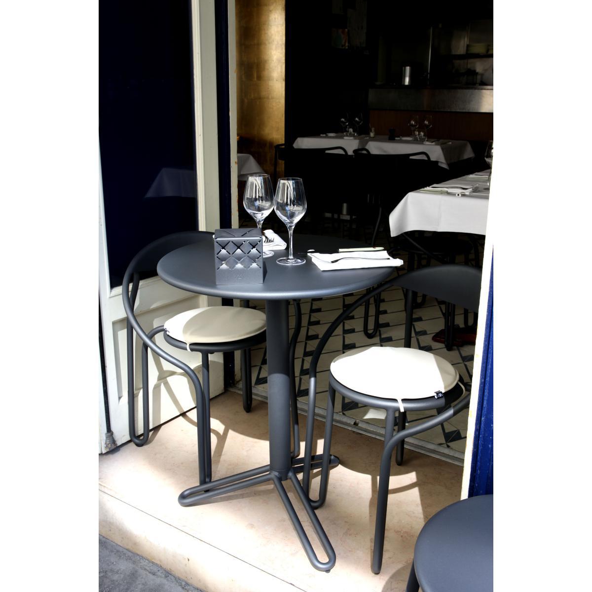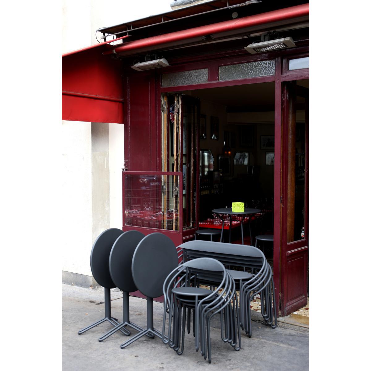 An ultra-graphic style for this small round aluminium table. Discrete at first glance, Huggy stands out due to its wonderful set of legs! From a stripped-back design, French designer Antoine Lesur has created a collection of chairs and tables in an up-to-date bistro style. The curved, sensual lines split, playing with solid and empty spaces to form a structure that is both airy and full of character. Equally as suitable indoors and out, the Huggy collection is made completely from aluminium. This furniture is characterised by its extreme lightness and great robustness. This table, with its industrial chic style, happily adapts to all interiors. Resistant to bad weather, it moves from the living room to the garden according to the seasons and your requirements! Complying with NF (French) standards, all the items in the Huggy collection are compatible with professional use (hotels, restaurants, local authorities etc). The Huggu Bistro table, surrounded by armchairs from the same collection, will easily fit on a terrace or balcony thanks to its ideal 75 cm diameter. The top folds away with its easy-to-use locking system to optimise storage.