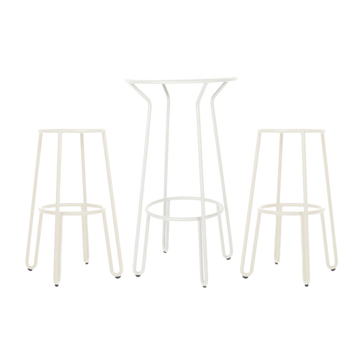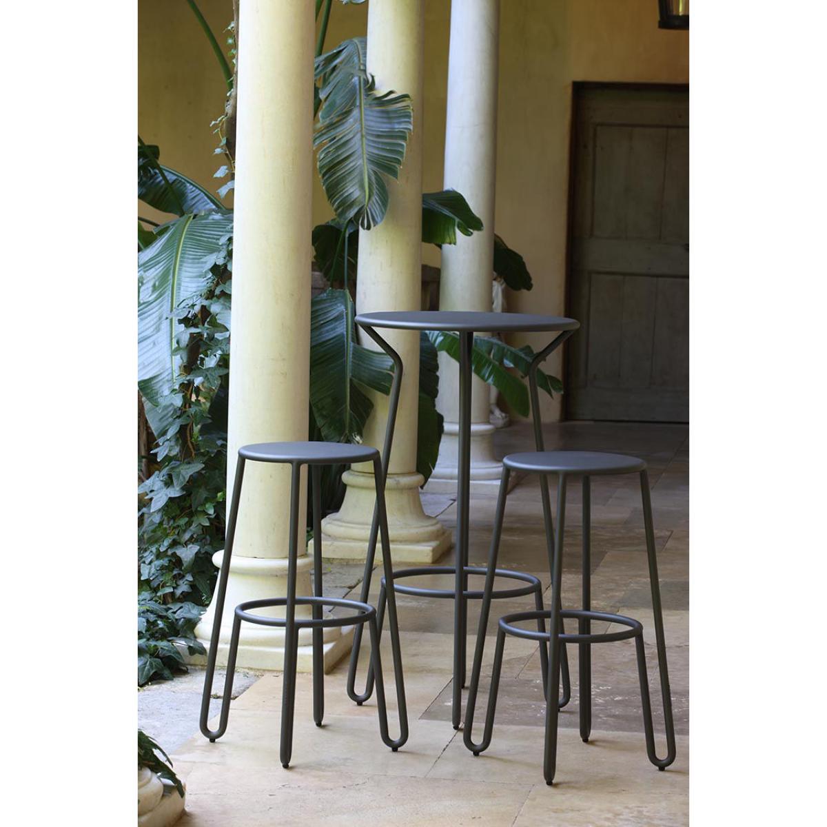 Create an original meal area indoors or outside with the Huggy collection. This set consists of a high table accompanied by two matching bar stools. An ultra graphic style for this metal furniture. Discrete at first glance, Huggy stands out due to its wonderful set of legs! From a stripped back design, the French designer, Antoine Lesur, designed a collection of seats and tables in a up-to-date bistro style. The curved and sensual lines split, playing with filled and empty spaces to form a structure that is both airy and full of character. Equally as suitable indoors and outside, the Huggy collection is made completely from aluminium. This furniture is characterised by its extreme lightness and its great robustness. Resistant to poor weather, it can be moved from the kitchen the garden with the seasons and your requirements! Complying with NF (French) standards, all the items in the Huggy collection are compatible with professional use (hotels, restaurants, local authorities, etc. ).