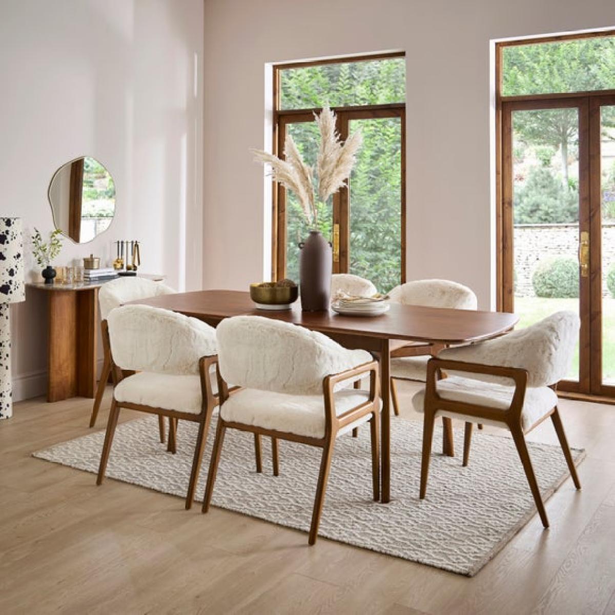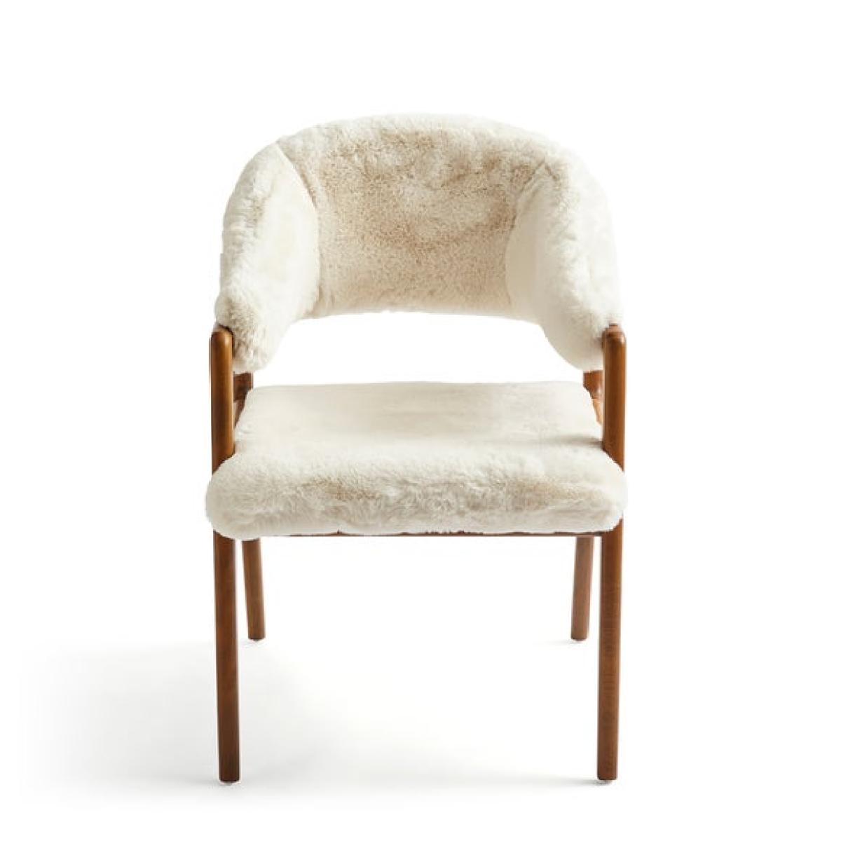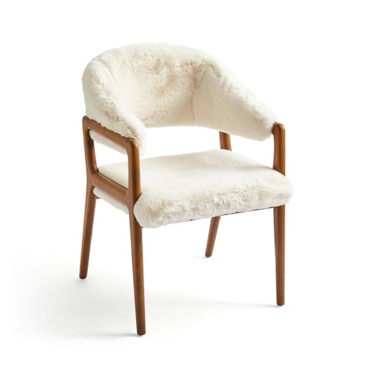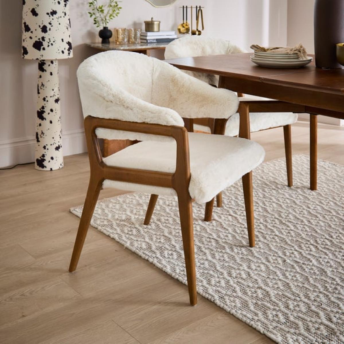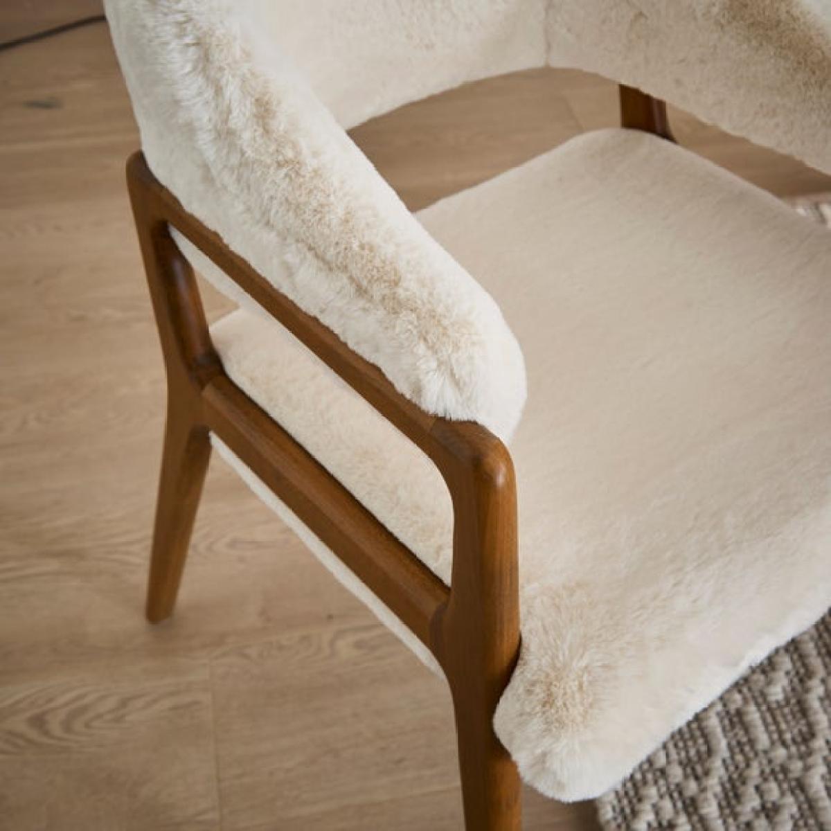 * Statement dining chair * Soft, faux fur upholstery * Beech wood legs The Hugh dining chair in an ivory faux fur is a soft and inviting addition to any room. With its plush faux fur upholstery and gently curved silhouette, it offers a warm and comfortable seat that’s perfect for winding down. Whether placed in a reading nook, bedroom corner, or living area, this chair brings a sense of calm and texture to your space, all while maintaining a clean and contemporary look.
