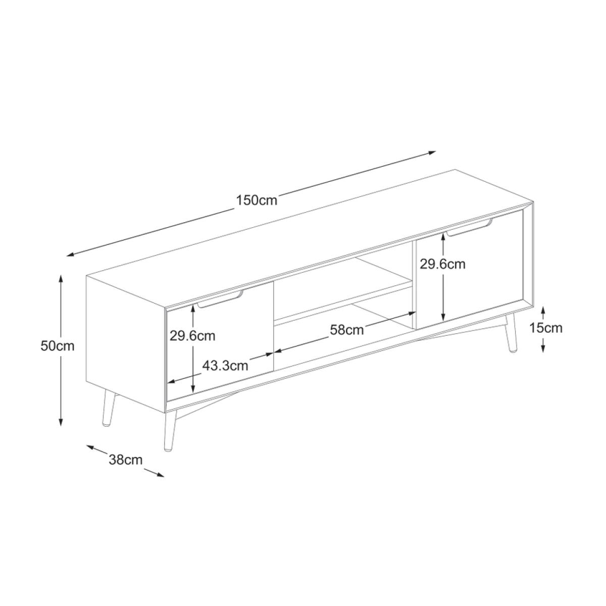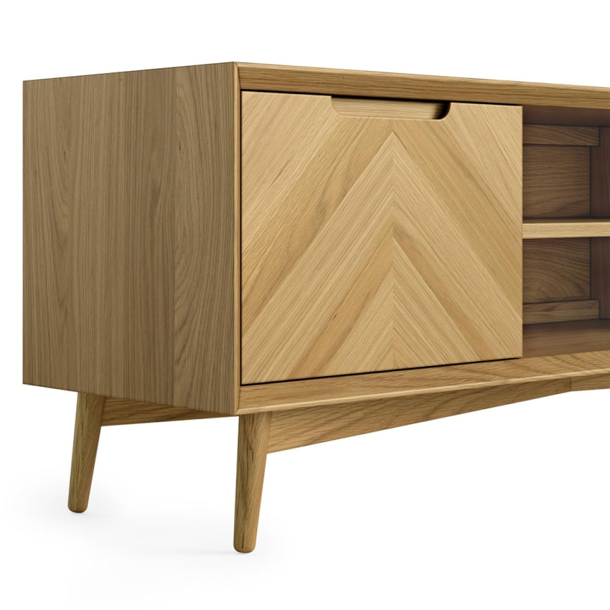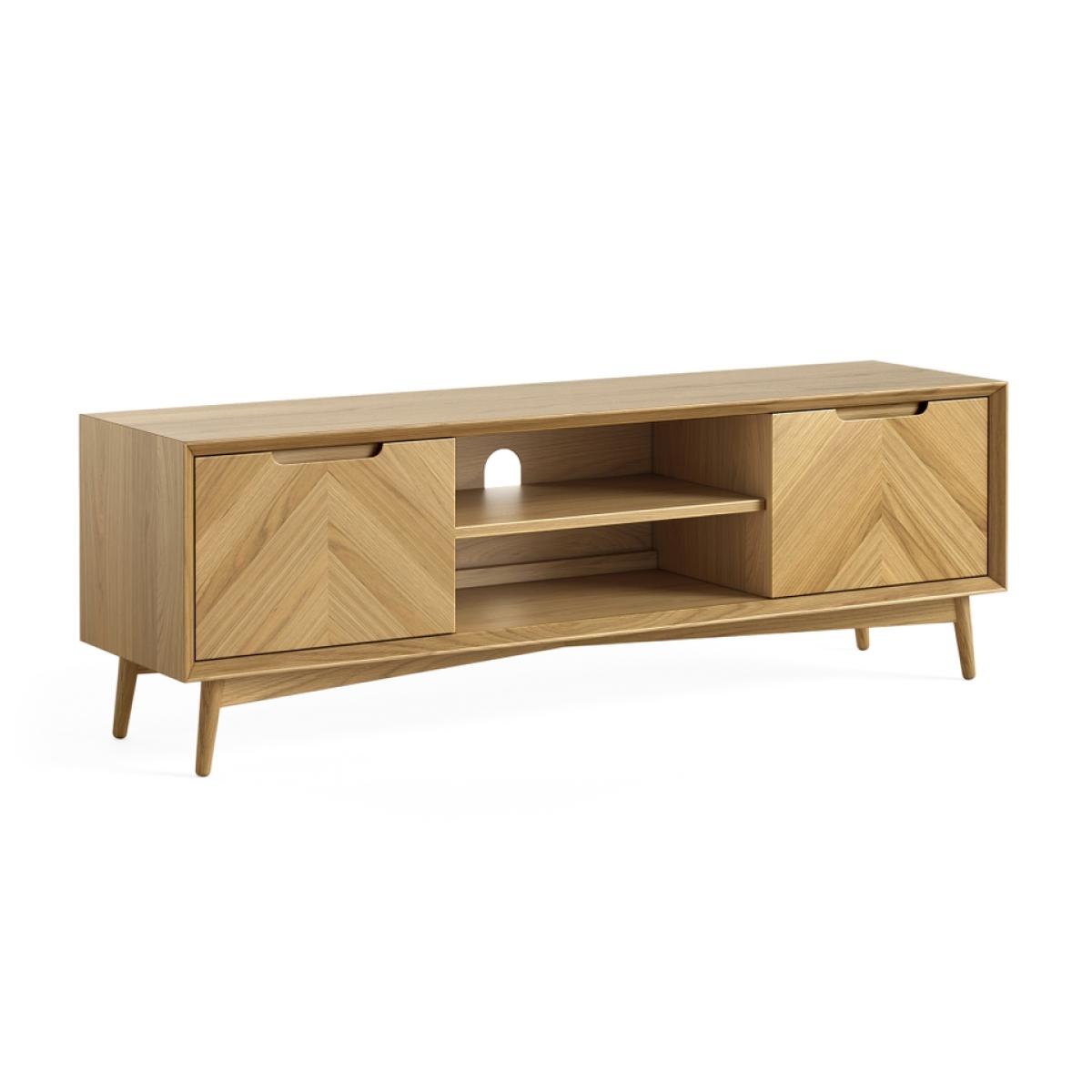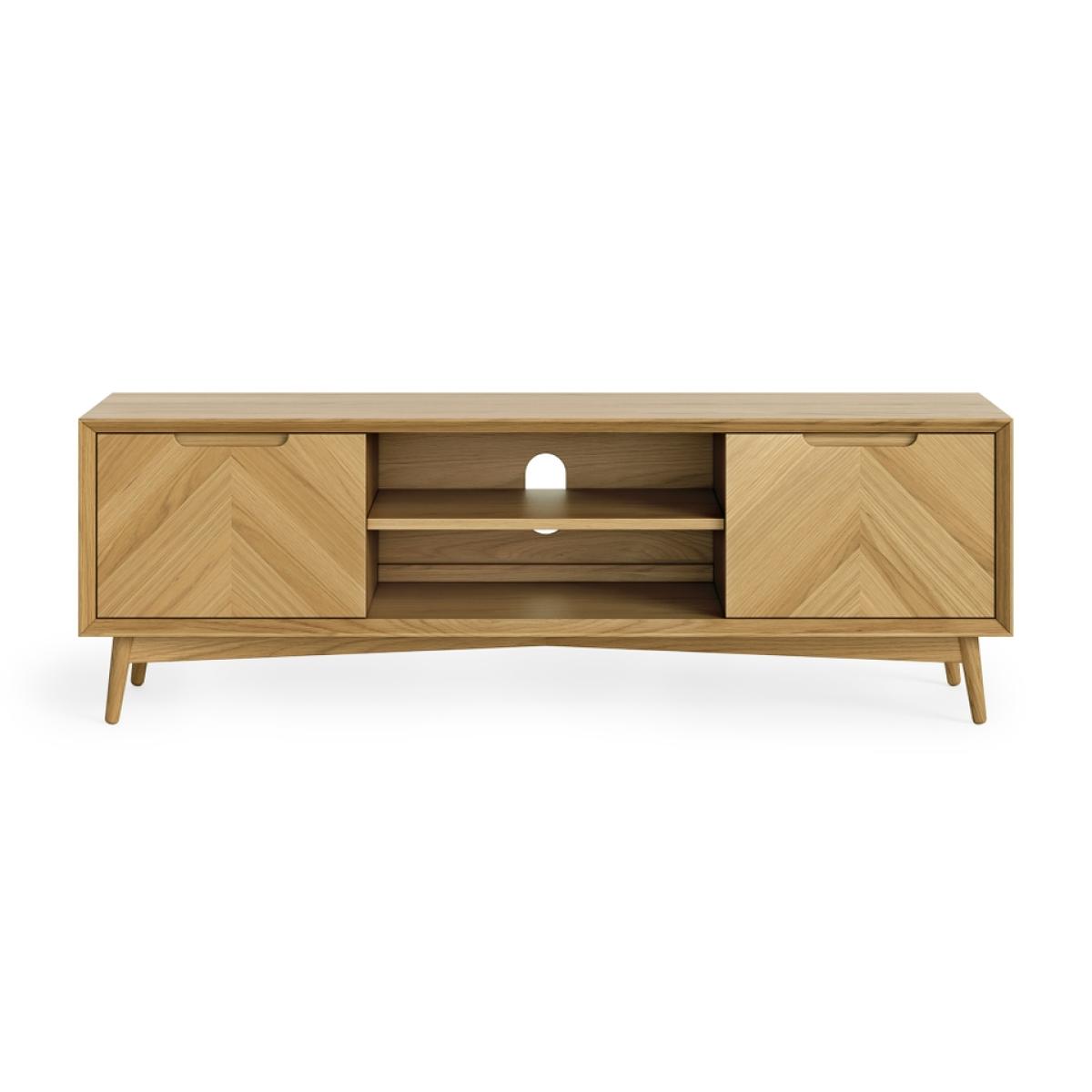 Simply put, the Hugh wide TV unit exudes elegance and mid century charm. The captivating chevron design of the two cupboard doors accentuate the natural grain and knots of the oak and oak veneers, making this TV stand a true visual treat. Raised on slender splayed legs with recessed handles, Hugh has a sleek silhouette. Boasting two cupboards and two open shelves with a rear cable hole, this TV stand has ample surface space for your television screen while keeping your video games, cables, and remote controls organised and hidden away.