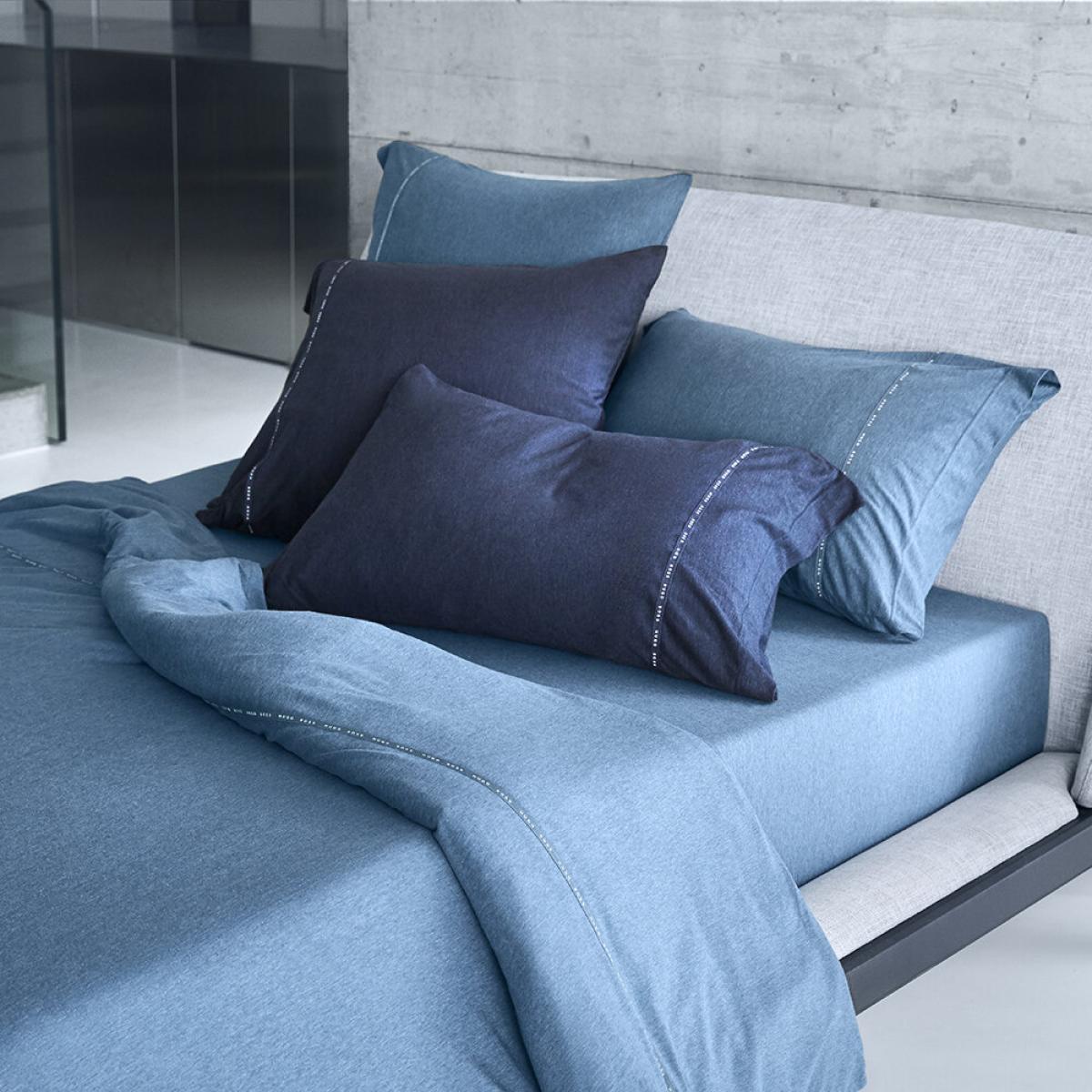 Sleep in ultimate comfort thanks to the soft cotton jersey fabric of the Sense duvet cover from Boss Home. In a denim blue shade, this design features ribbon applique detail with the Boss Home logo in a continuous line. Super soft and ultra-comfortable, style with the rest of the collection to complete the look.