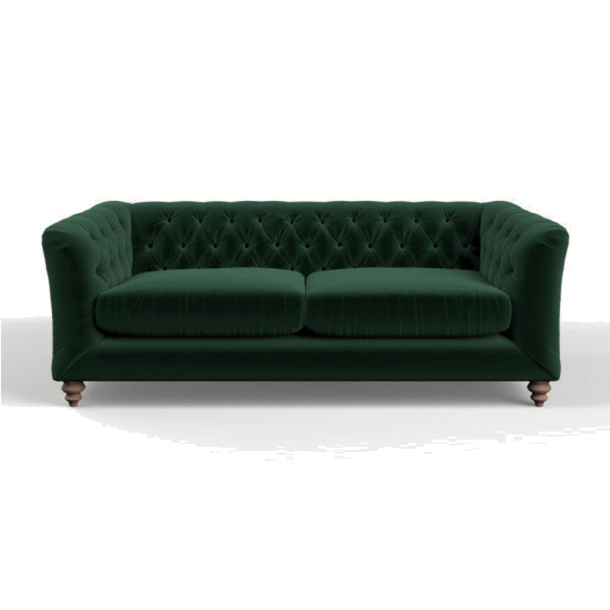 Looking for a slicker, more contemporary version of a Chesterfield sofa? Our Hugo (available as a two, three or four seater and a love seat or corner sofa) is the best-selling sofa in our entire range, thanks to its versatility. Perfectly combining a classic look with more modern touches, this stylish Chesterfield looks just as good in neutral colours as it does in more vibrant hues. Featuring the same comfy and squishy cushions that the rest of our Snuggle collection is known for, the Hugo offers the perfect juxtaposition of comfort and style. We have 1 Hugo Chesterfield Sofa in perfect condition - Shade Emerald Green with legs in shade Dark Mahogany. Available now for a swift delivery, please get in touch with any questions you may have!