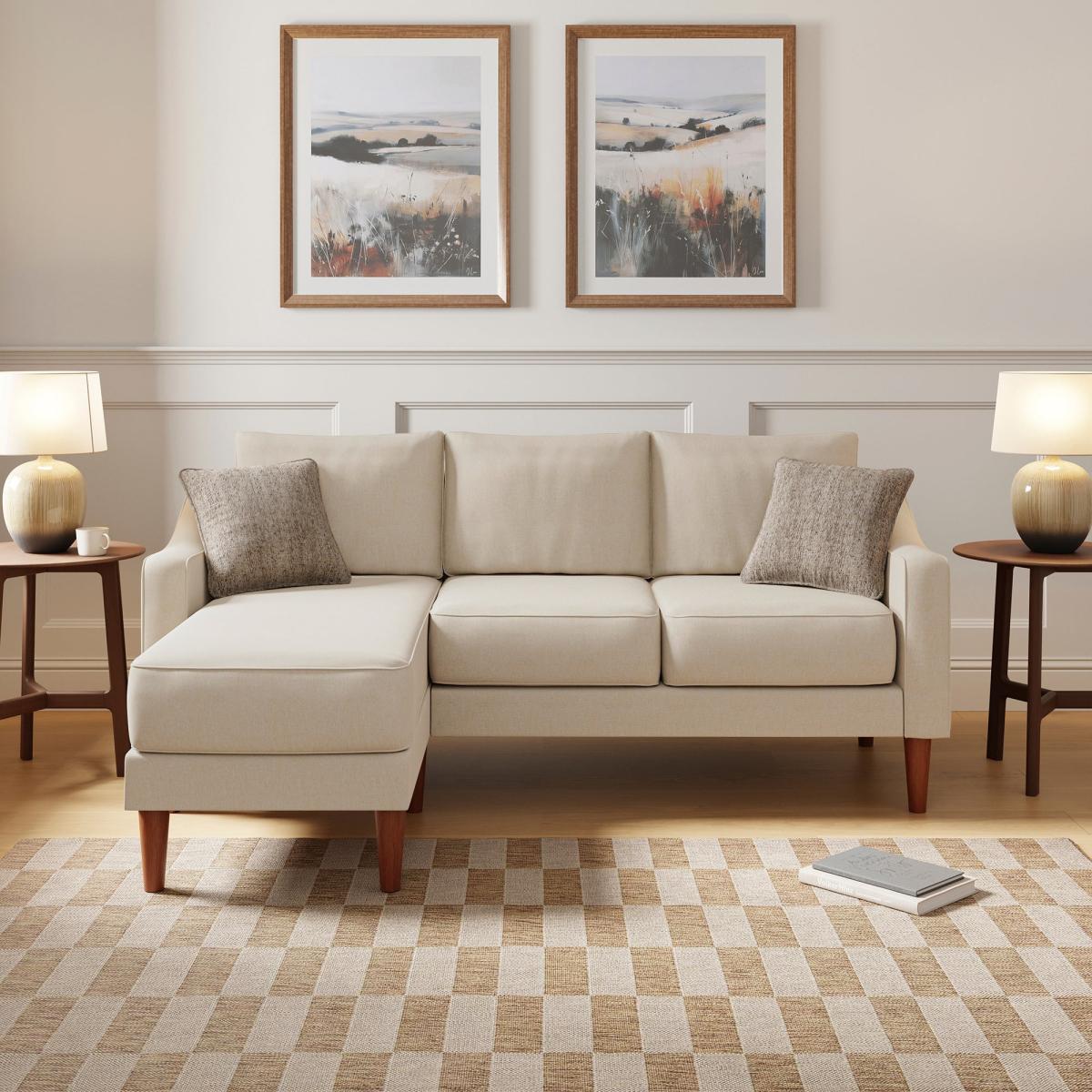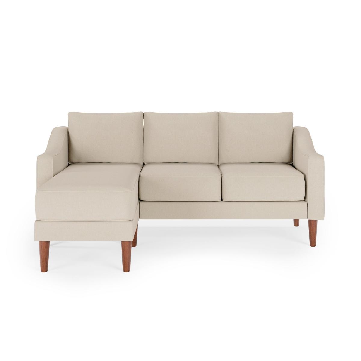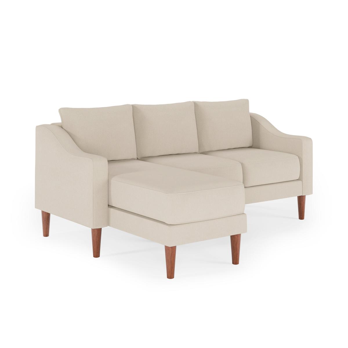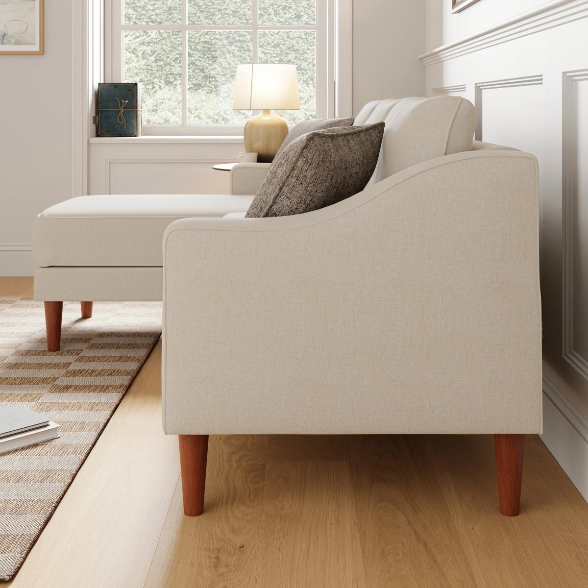 * Classic sofa * Soft upholstery * Square arms * Rubberwood legs * Adjustable orientation This three-seater corner chaise sofa offers a perfect balance of comfort and contemporary style. Upholstered in durable flatweave fabric, it features a textured finish that adds depth and character. The spacious design includes a chaise extension for ultimate relaxation, while the structured square arms and tailored cushions maintain a refined silhouette.