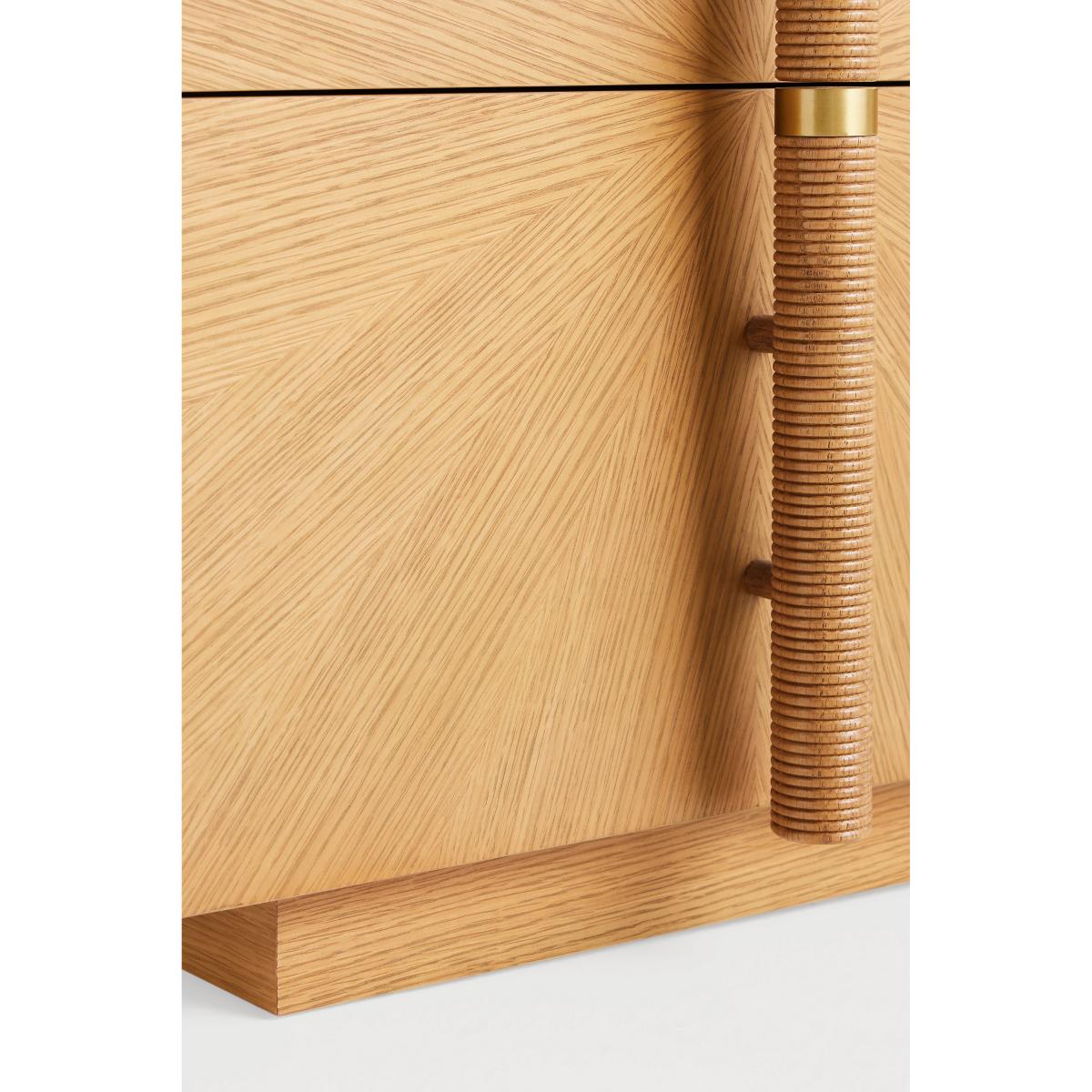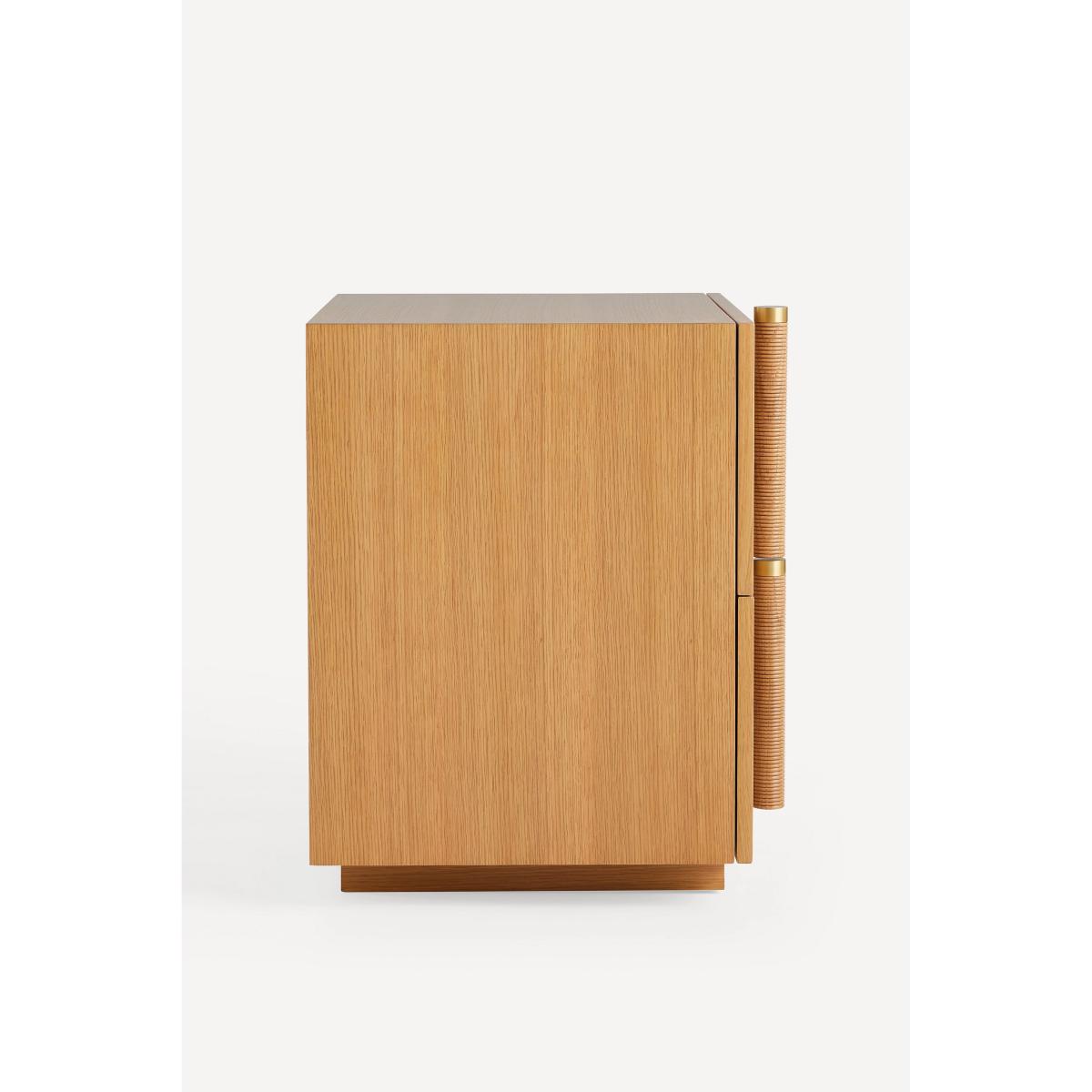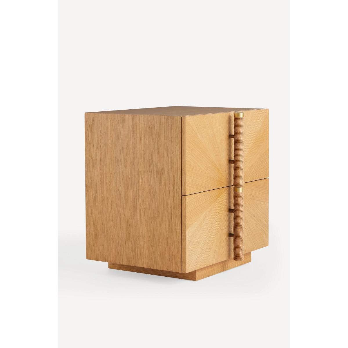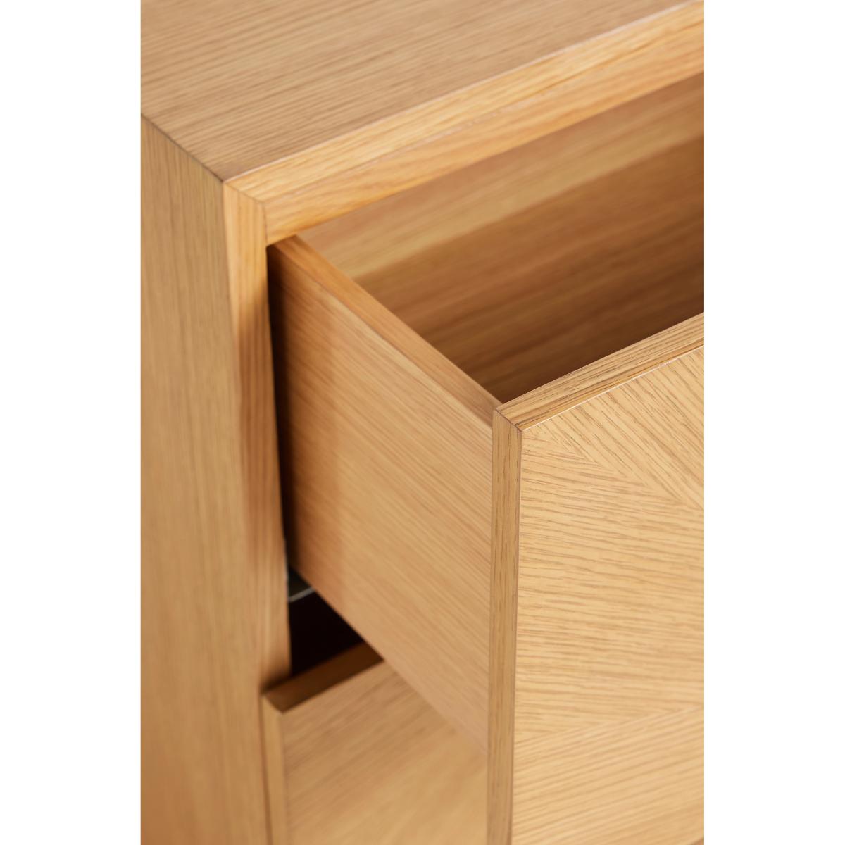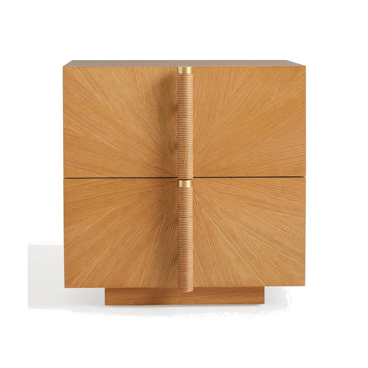 The Hugo Nightstand boasts a modern design with symmetrical panels, a recessed plinth base, and ample storage space. * Oak wood nightstand reinforced with engineered hardwood with an oak veneer finish * Steel and aluminum hardware * Two drawers * Drawers open on metal glides * Wipe clean with soft cloth. Avoid using chemical cleaners * This piece is intended for indoor use * Imported