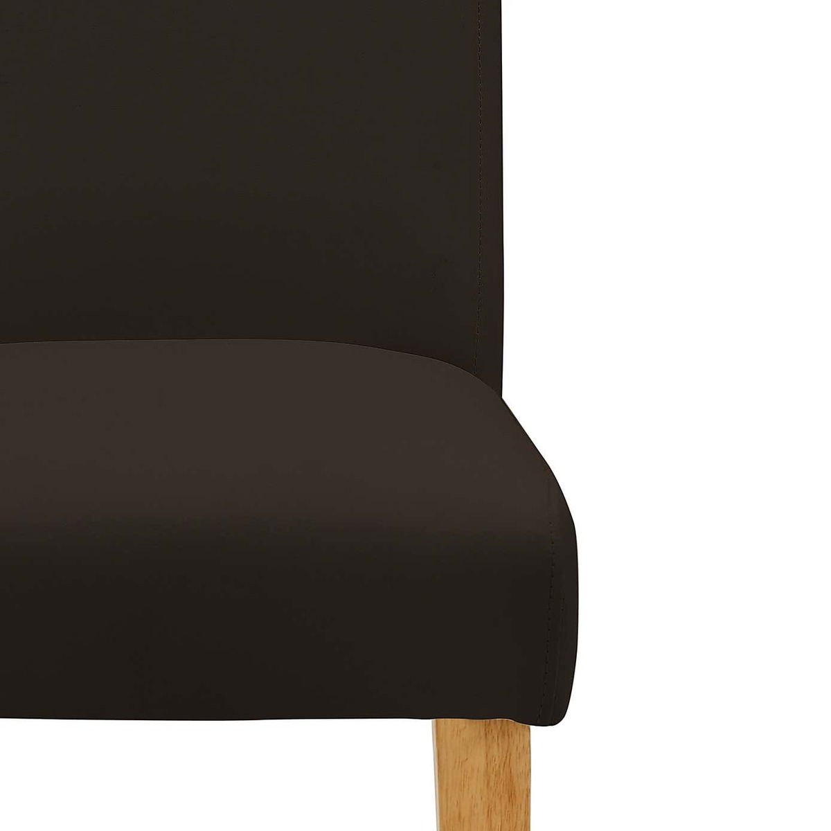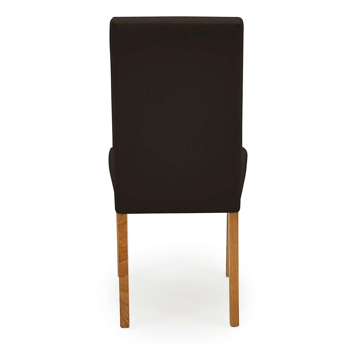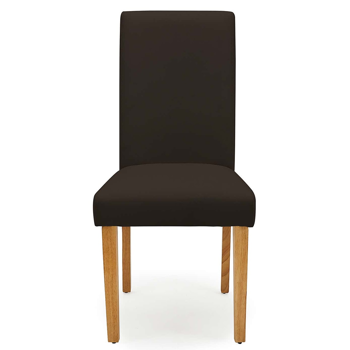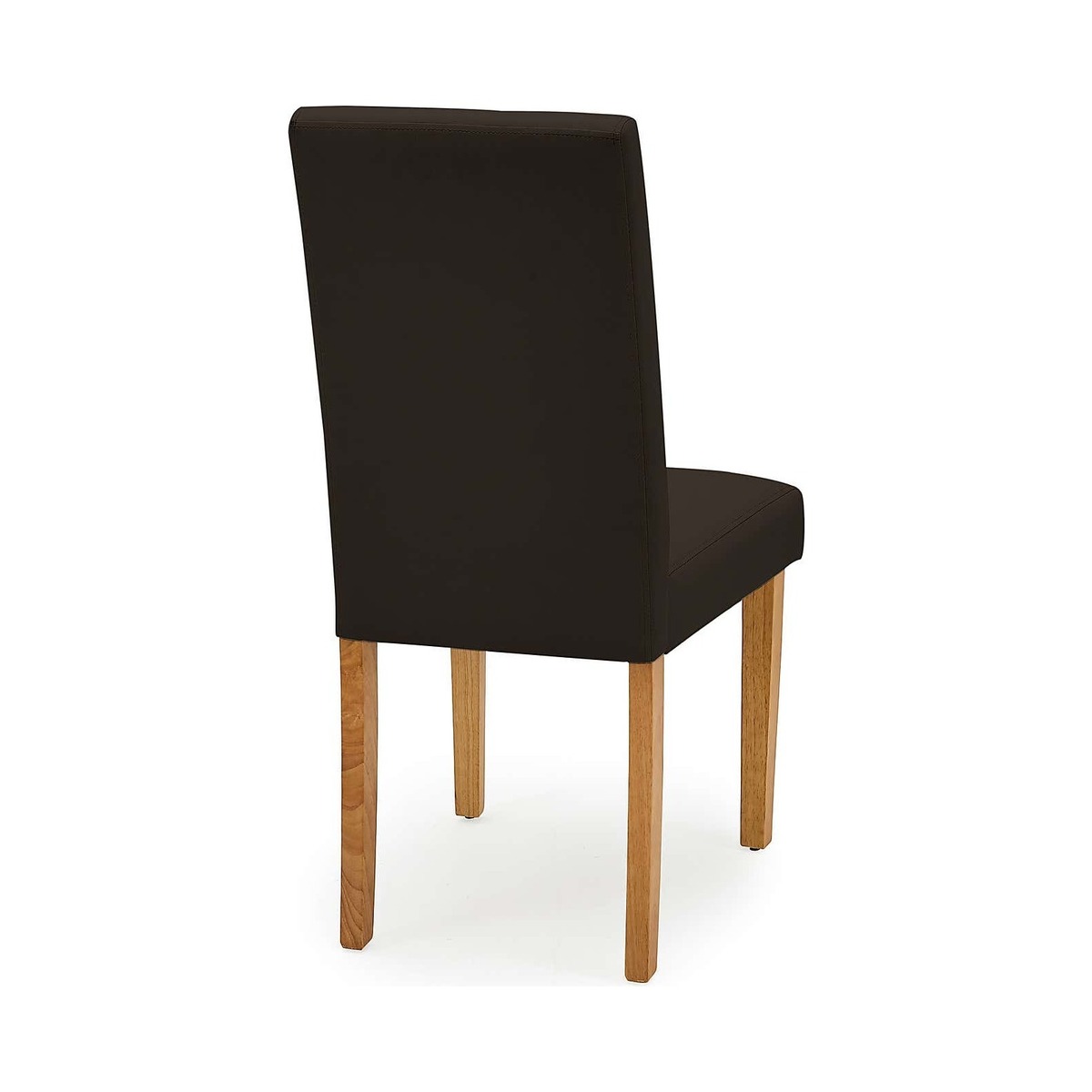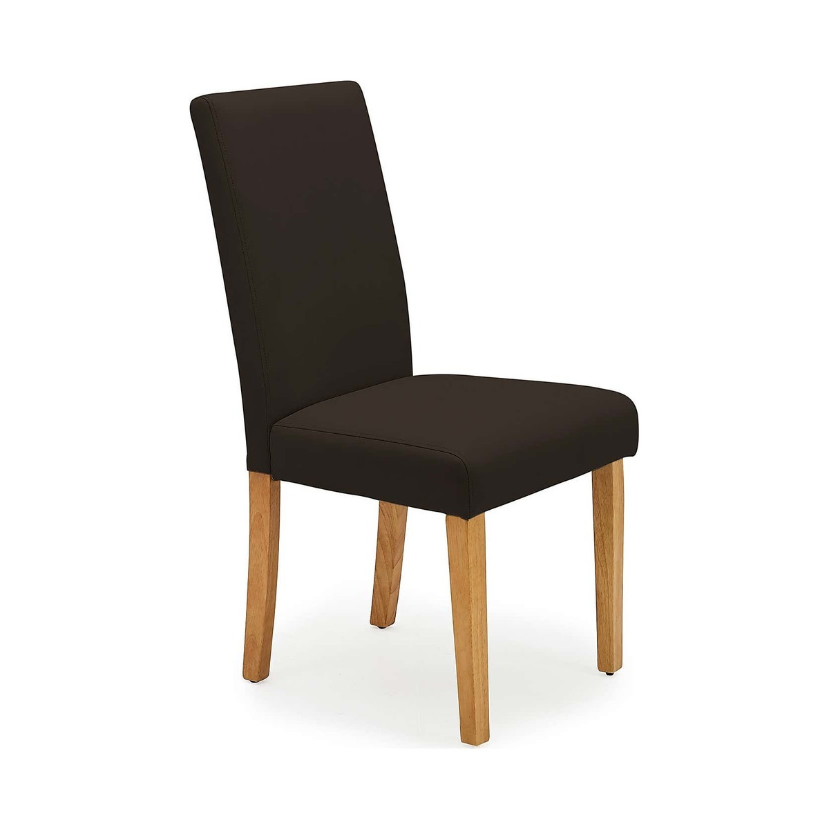 Upholstered in an easy clean, chocolate PU leather, the contemporary Hugo set of 2 dining chairs suit a variety of styles and would be a great addition to any dining space. Complete with foam-filled seats and backrests, these easy to assemble dining chairs are designed to provide plenty of comfort and feature tapered, oak finished solid wood legs to match a range of furniture. Other colours and fabric styles are also available.