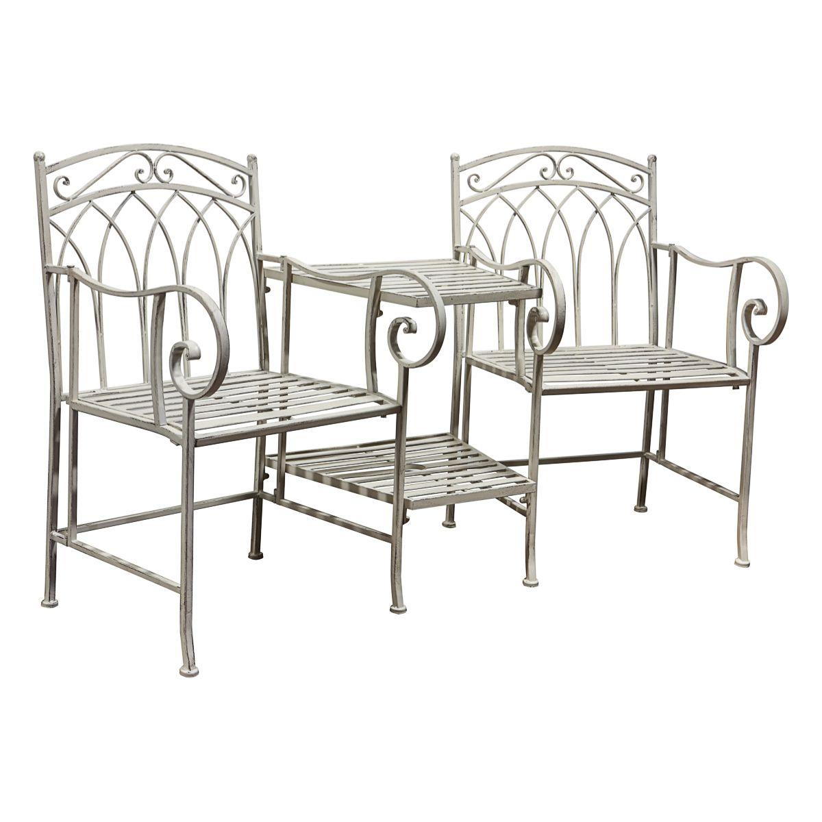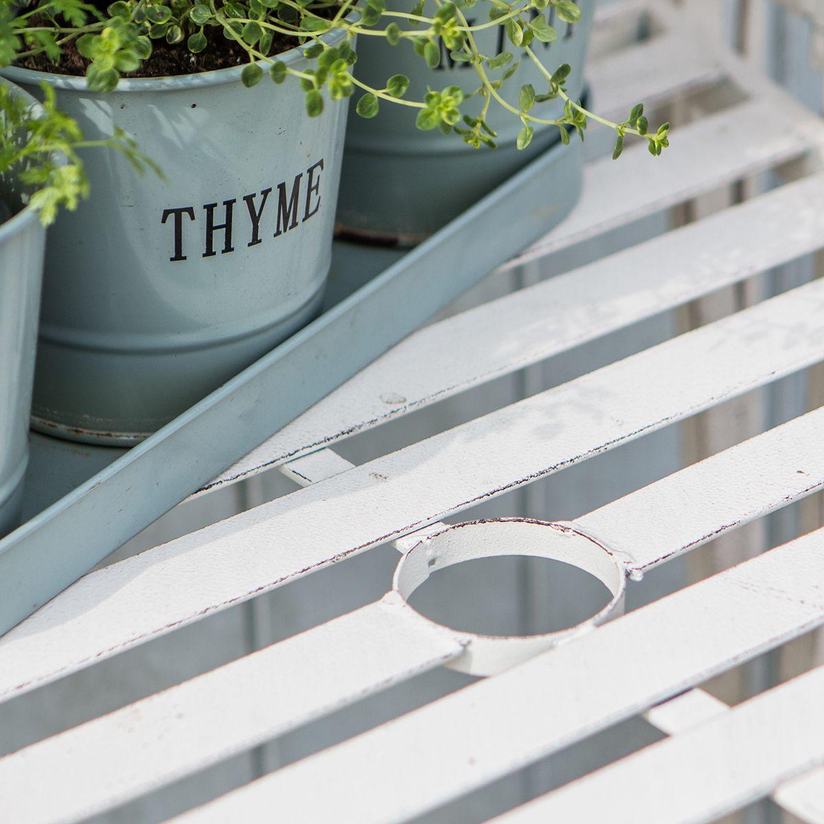 Create a beautiful casual seating area in your garden with the loveseat in a distressed, painted white finish. Featuring two armchairs secured together in the middle with a tapered side table which has a practical parasol hole for those sunny days.