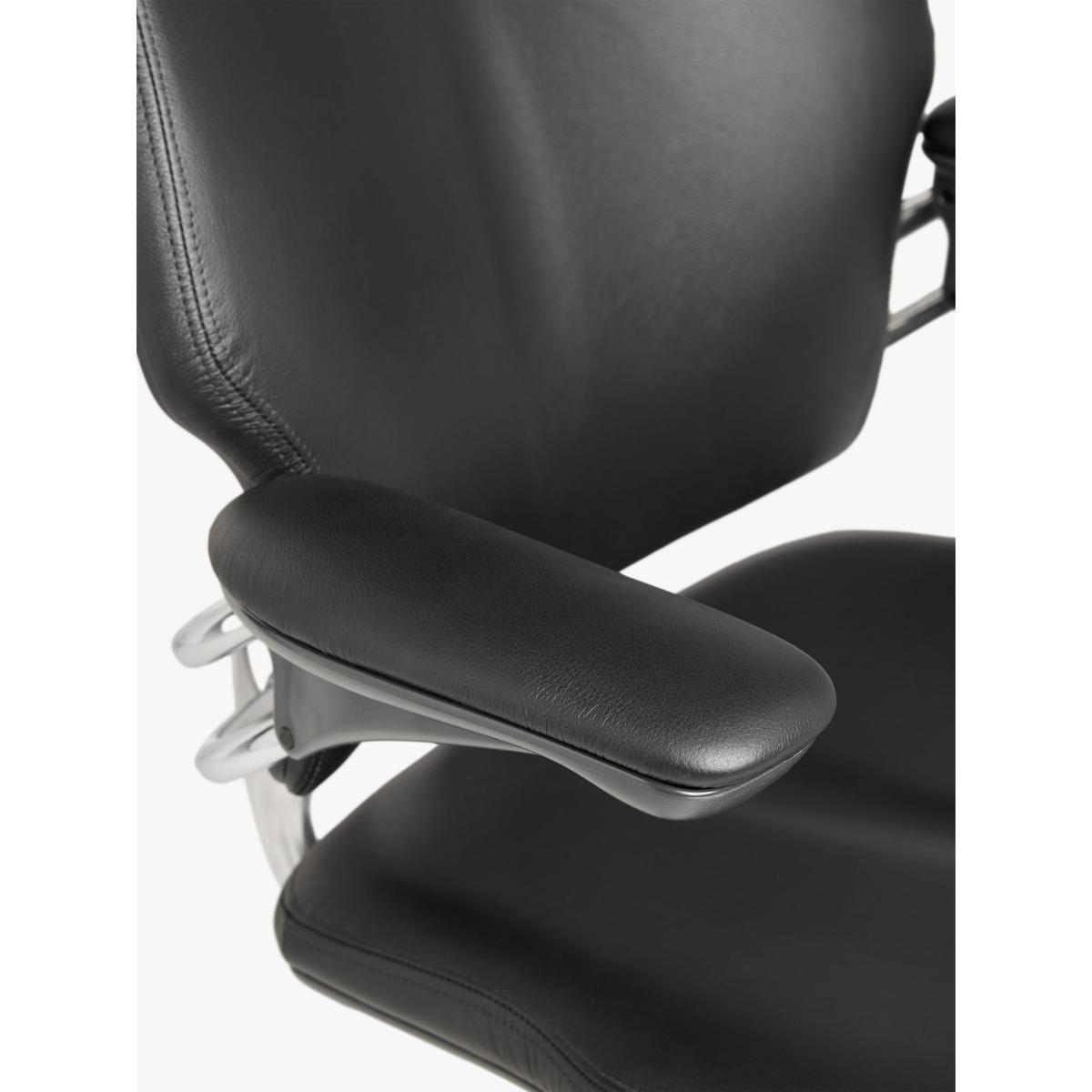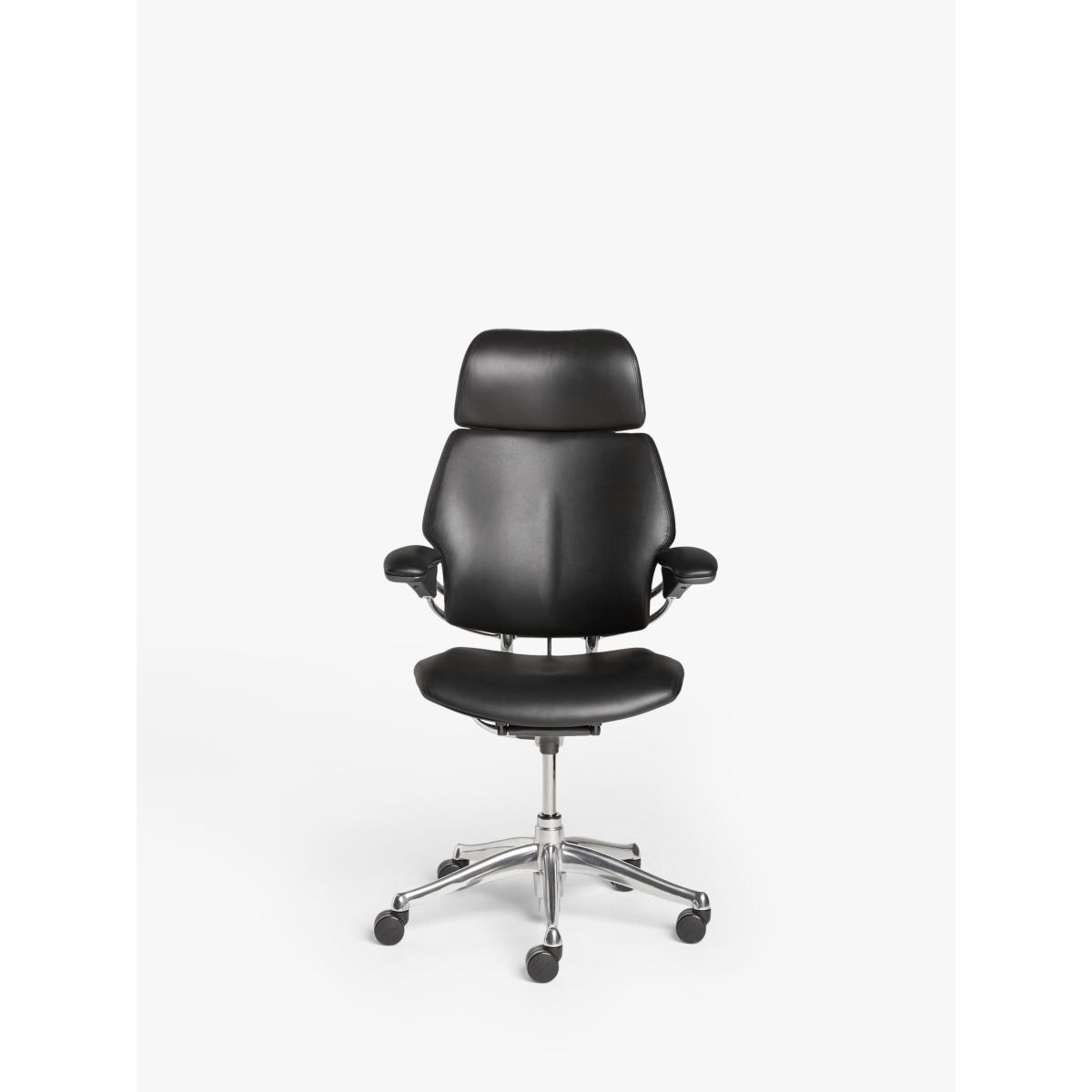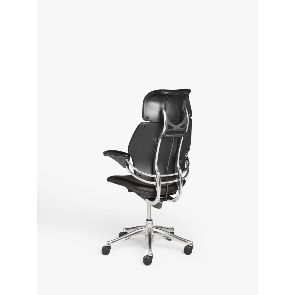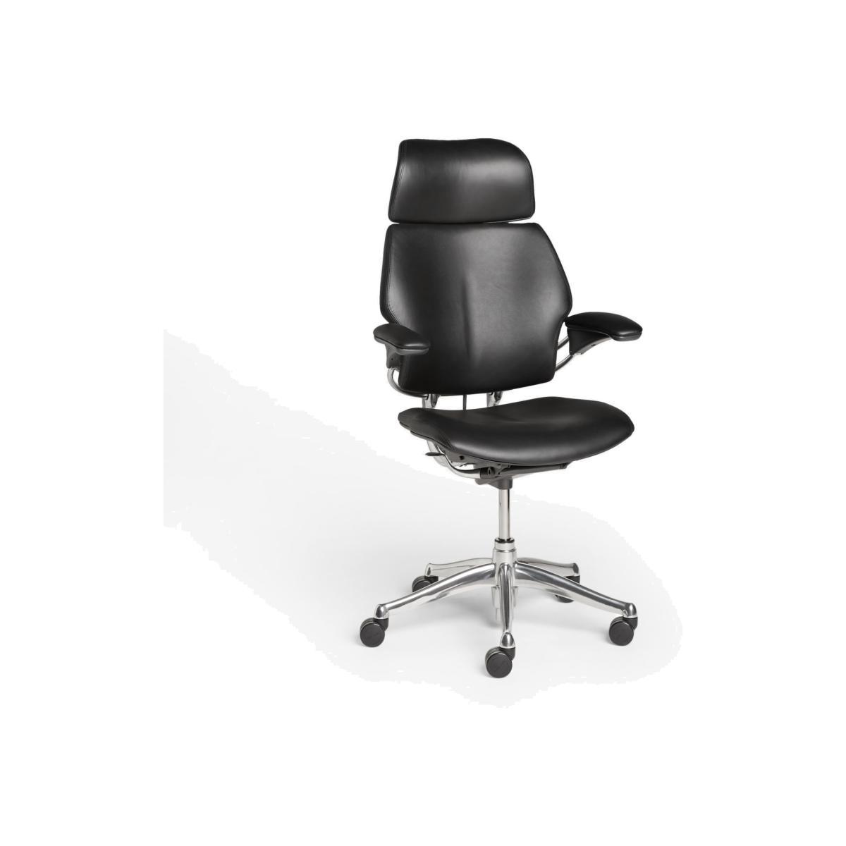 Created by Niels Diffrient for Humanscale, the Freedom office chair provides you with the ultimate support and comfort you need for a long working day. Ergonomically shaped, it automatically adjusts to each user and has been designed to eliminate the need for manual controls. It features a sophisticated weight-sensitive, self-locking recline mechanism and there's also a headrest to ensure you're totally supported. This model is contract standard and upholstered in supple leather for a smart and durable finish. Upholstered in chrome-free leather The leather used on this chair is manufactured by Wollsdorf Leather, a carbon neutral tannery. Instead of using chemical-based chrome to tan the leather, they've used natural, vegetable tanning which uses no harmful chemicals and is free from heavy metals, making the manufacture of this office chair kinder to the environment. The leather cushions are also sculpted to provide optimal weight distribution and comfort. Adjustable to each user This office chair is designed with a responsive, weight-sensitive backrest that automatically tilts and reclines when you move. It adapts to the changing needs of your spine as your recline the chair and its intelligent counterbalance mechansim provides the right amount of support for each user's body shape and size. The seat is height adjustable and the dynamic headrest adjusts to cradle your head and neck while you work. It will also move automatically when you sit upright. The armrests have a synchonous design, meaning they'll move up and down together and stay with you when you recline. This reduces muscular effort in your neck and shoulders, encouraging good posture and minimising the risk of pain. About the designer Designer Niels Diffrient aimed to create an office chair that would automatically adapt to the user, allowing them to move freely from posture to posture. His unique approach removed complexities found in other office chairs, such as cumbersome recline levers and back tension dials for a truly ergonomic task chair. As a result, he developed a recline mechanism that perfectly adjusts to the user and he reinvented the modern office chair to be simple, functional and timeless. The Freedom chair is the winner of ten design awards to date, including the Design Distinction Award in the prestigious ID Design Review competition, 2000. Protect your floor While this chair is suitable for the flooring specified, we suggest using floor pads or mats where possible, for added protection to your flooring and furniture. Want to see it first? You may want to see and get a feel for the furniture in one of our shops before ordering. We'll be able to tell you where the range you'd like to view is on display.