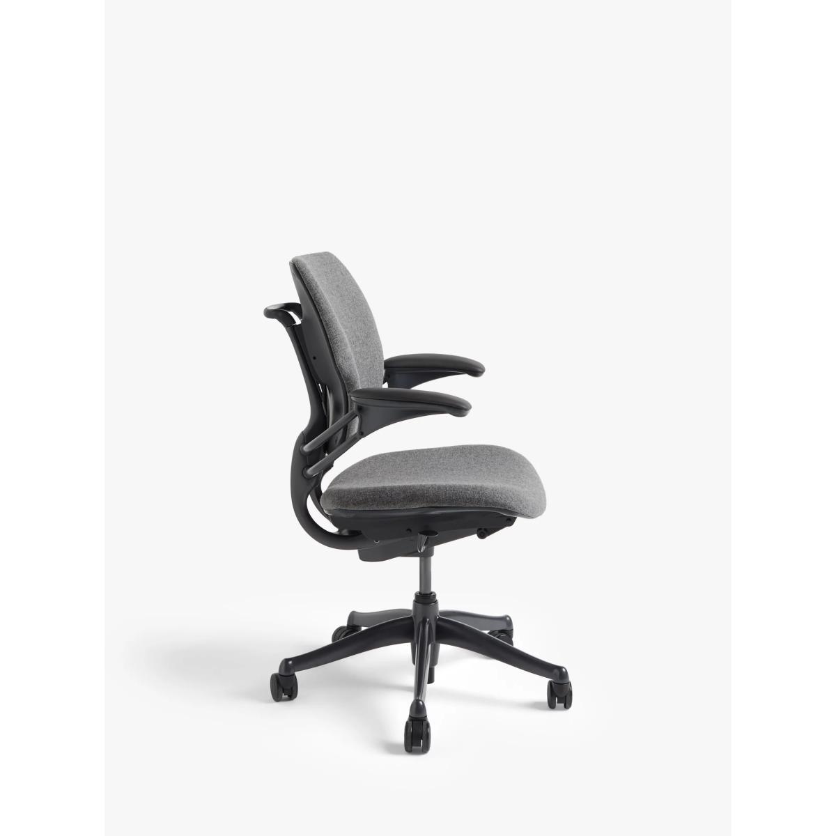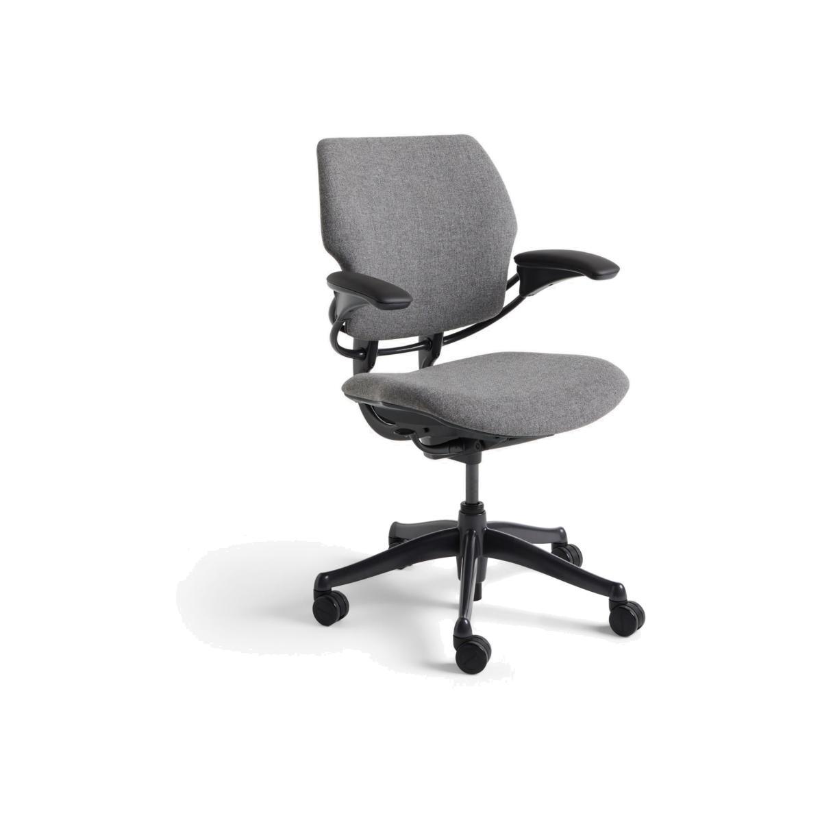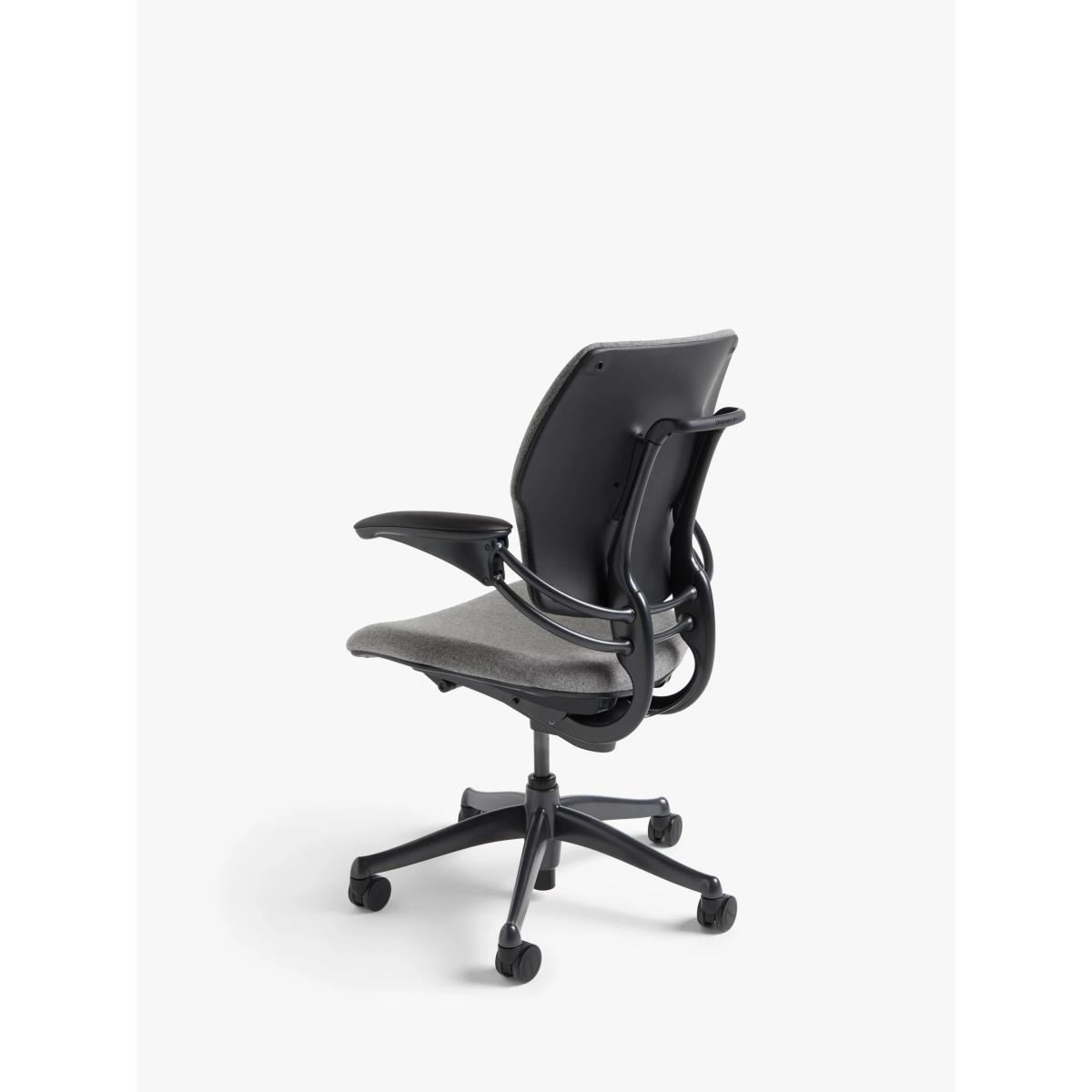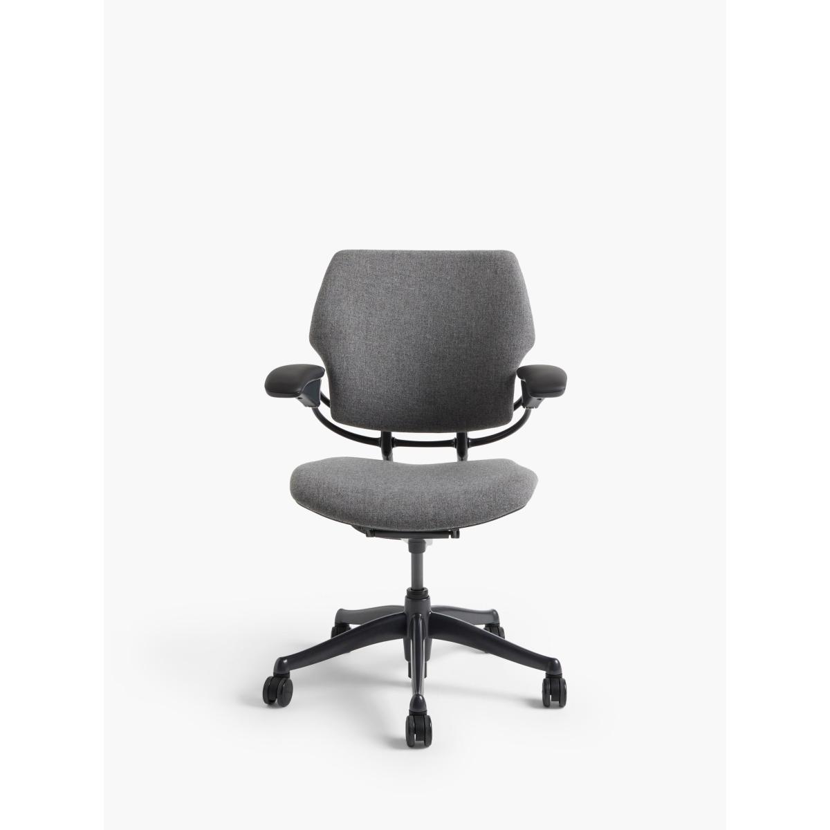 Created by Niels Diffrient for Humanscale, the Freedom office chair provides you with the ultimate support and comfort you need for a long working day. Ergonomically shaped, it automatically adjusts to each user and has been designed to eliminate the need for manual controls. It features a sophisticated weight-sensitive, self-locking recline mechanism and there's also a headrest to ensure you're totally supported. This model is contract standard and upholstered in supple leather for a smart and durable finish. Adjustable to each user This office chair is designed with a responsive, weight-sensitive backrest that automatically tilts and reclines when you move. It adapts to the changing needs of your spine as your recline the chair and its intelligent counterbalance mechansim provides the right amount of support for each user's body shape and size. The seat is height adjustable and the dynamic headrest adjusts to cradle your head and neck while you work. It will also move automatically when you sit upright. The armrests also move up and down together and stay with you when you recline. This reduces muscular effort in your neck and shoulders, encouraging good posture and minimising the risk of pain. About the designer Designer Niels Diffrient aimed to create an office chair that would automatically adapt to the user, allowing them to move freely from posture to posture. His unique approach removed complexities found in other office chairs, such as cumbersome recline levers and back tension dials for a truly ergonomic task chair. As a result, he developed a recline mechanism that perfectly adjusts to the user and he reinvented the modern office chair to be simple, functional and timeless. The Freedom chair is the winner of ten design awards to date, including the Design Distinction Award in the prestigious ID Design Review competition, 2000. Protect your floor For added protection to your floor and furniture, we recommend using floor pads or mats where possible. Want to see it first? You may want to see and get a feel for the furniture in one of our shops before ordering. We'll be able to tell you where the range you'd like to view is on display.