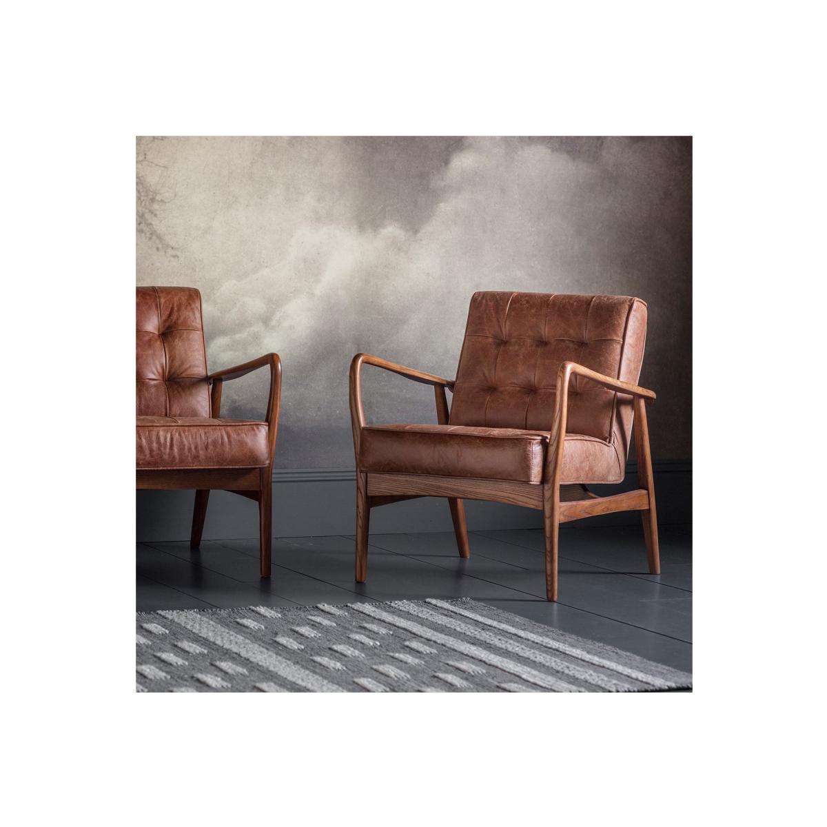 Dimensions W70cm x D74cm x H80cm. The Humber Armchair has a retro stylish design that is on trend. It is made from quality authentic vintage brown leather and has a solid wood varnished frame. It has some stunning details that make it into a real focal point for the room. Whether you're introducing it to a traditional or contemporary space it's sure to fit in beautifully with retro modern design. Features. Single armchairSoft authentic vintage brown leather Solid dark wood frame Retro styled design. No assembly required..