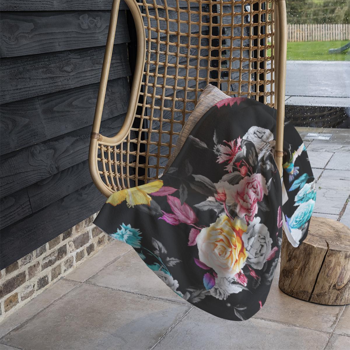 I love this black throw with hummingbird roses and peonies because it adds a sophisticated yet vibrant touch to any space. It works particularly well in eclectic, understated, or modern interiors, where the bold floral design can serve as a statement piece or complement neutral tones. Practical styling tips include draping it casually over a cosy armchair or layering it on the edge of a bed to bring warmth and visual interest. Its dark background makes it versatile for both colour-rich schemes and monochrome settings, making it a great option for adding depth and pattern without overwhelming the space.