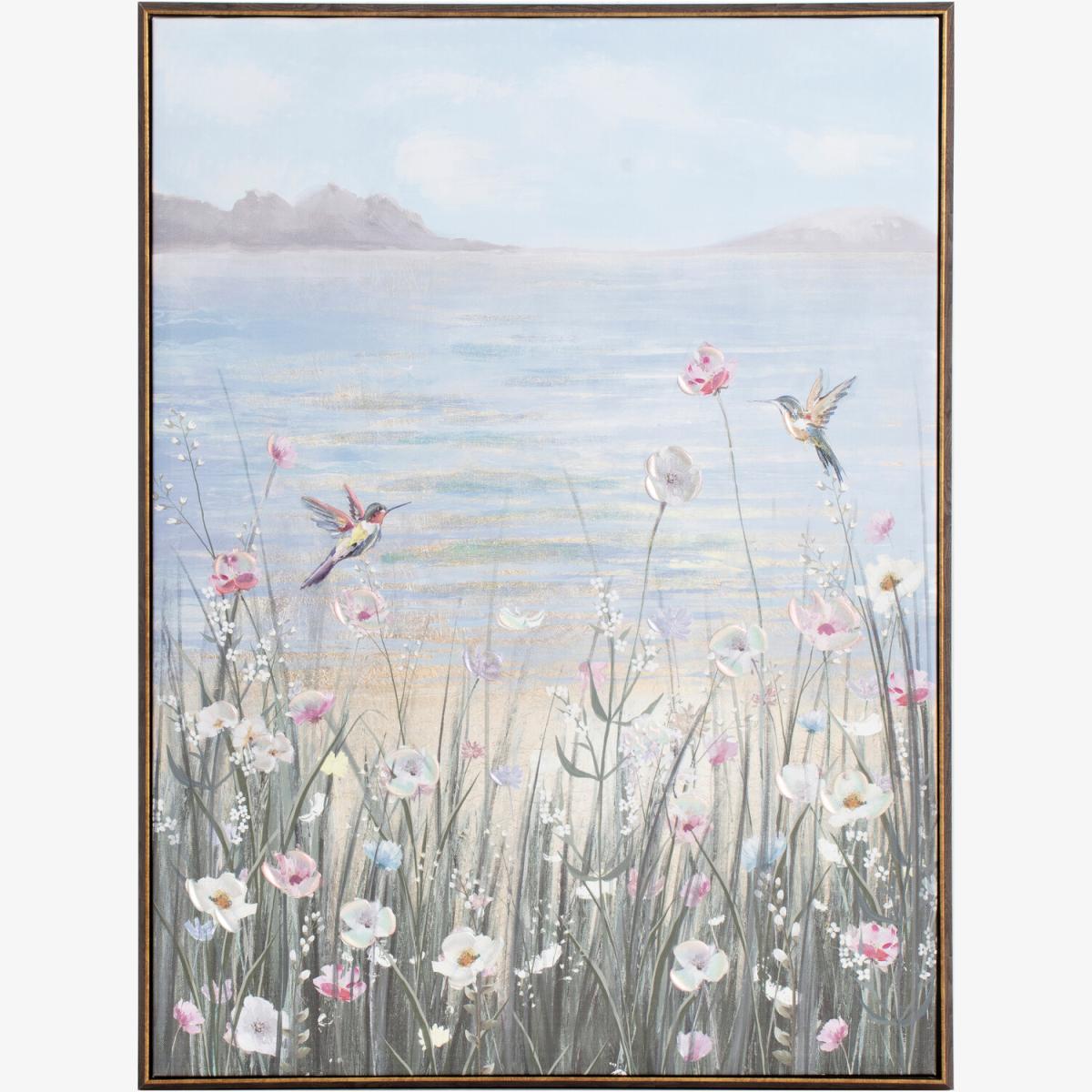 I love the calm, airy feel of this hummingbirds and sea piece - it works beautifully in both coastal and relaxed interiors. Its soft blues and gentle pinks make it perfect for bringing a sense of tranquility to living rooms, bedrooms, or even sunrooms. To style it effectively, hang it at eye level above a neutral sofa or bed, and consider pairing it with light wood or white frames to keep things cohesive. For added impact, couple it with other subtle coastal accessories like driftwood or soft textiles in complementary shades. This artwork is versatile enough to add colour and interest without overwhelming a space, making it a smart choice for creating a serene yet stylish focal point.